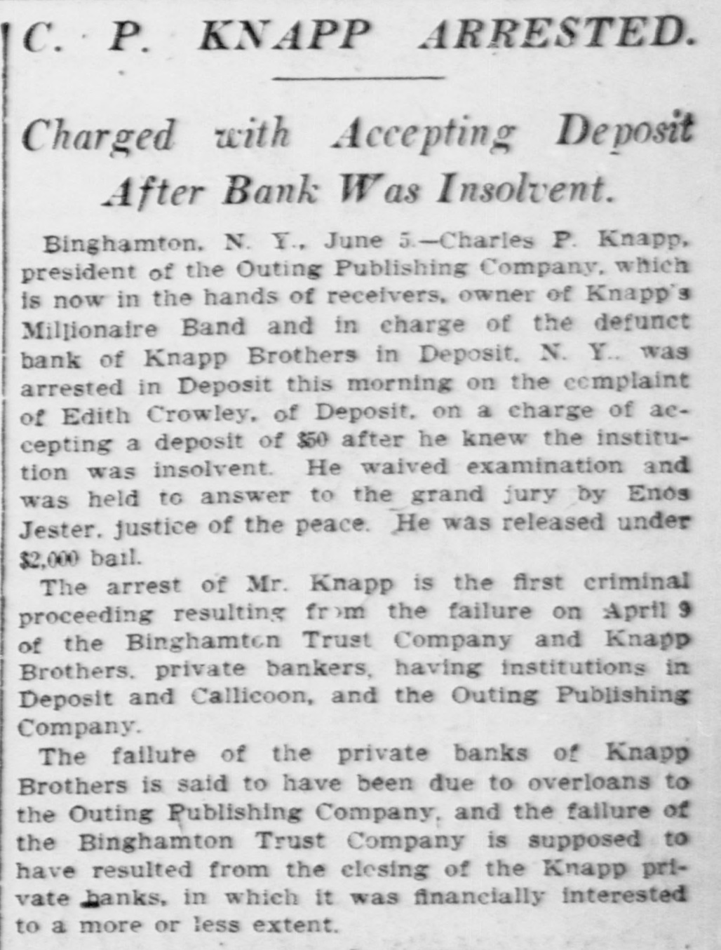 C. P. KNAPP ARRESTED. Charged with Accepting Deposit After Bank Was Insolvent. Binghamton. N. Y., June 5.-Charles P. Knapp, president of the Outing Publishing Company, which is now in the hands of receivers, owner of Knapp's Millionaire Band and in charge of the defunct bank of Knapp Brothers in Deposit. N. Y.. was arrested in Deposit this morning on the complaint of Edith Crowley, of Deposit. on a charge of accepting a deposit of $50 after he knew the institution was insolvent. He waived examination and was held to answer to the grand jury by Enós Jester. justice of the peace. He was released under $2,000 bail. The arrest of Mr. Knapp is the first criminal proceeding resulting from the failure on April 9 of the Binghamton Trust Company and Knapp Brothers. private bankers, having institutions in Deposit and Callicoon, and the Outing Publishing Company. The failure of the private banks of Knapp Brothers is said to have been due to overloans to the Outing Publishing Company, and the failure of the Binghamton Trust Company is supposed to have resulted from the elesing of the Knapp private banks, in which it was financially interested to a more or less extent.
