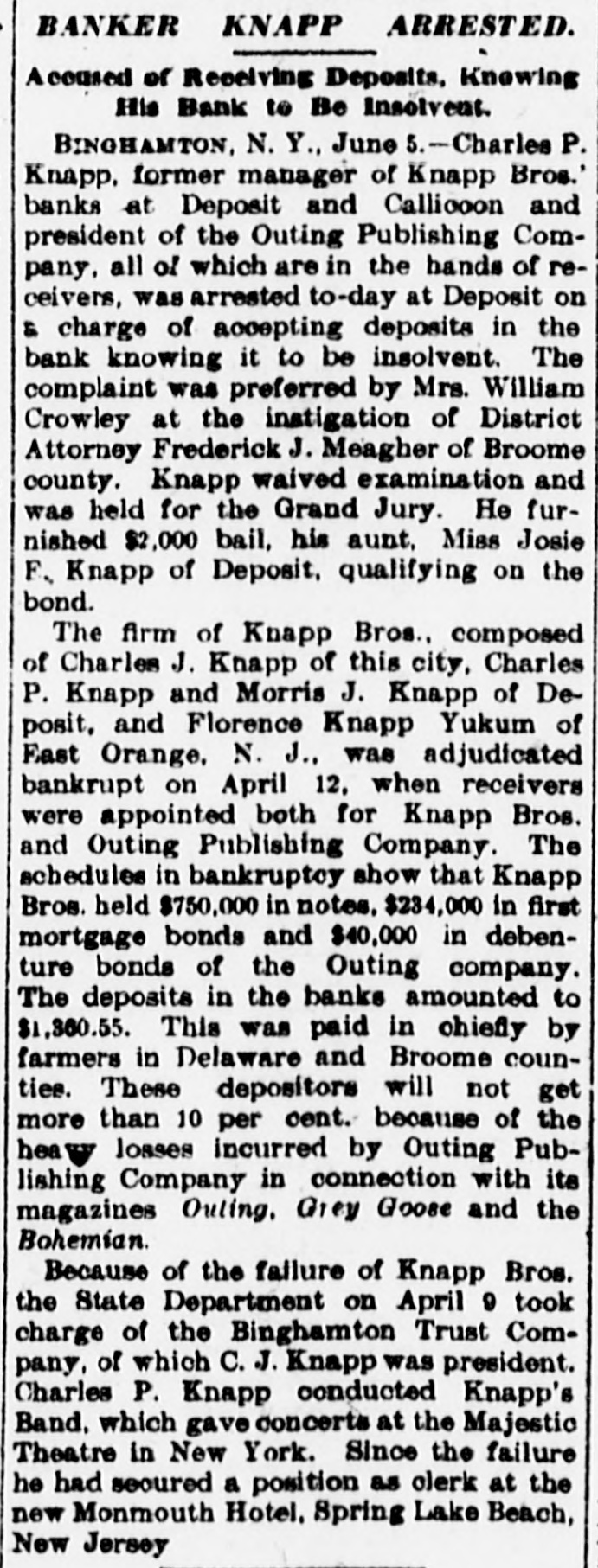 BANKER KNAPP ARRESTED. Accused of Receiving Deposits, Knowing His Bank to Be Insolvent. BINGHAMTON, N. Y., June 5.-Charles P. Knapp. former manager of Knapp Bros.' banks at Deposit and Calliooon and president of the Outing Publishing Company, all of which are in the hands of receivers, was arrested to-day at Deposit on & charge of accepting deposits in the bank knowing it to be insolvent. The complaint was preferred by Mrs. William Crowley at the instigation of District Attorney Frederick J. Meagher of Broome county. Knapp waived examination and was held for the Grand Jury. He furnished $2,000 bail, his aunt, Miss Josie F., Knapp of Deposit, qualifying on the bond. The firm of Knapp Bros., composed of Charles J. Knapp of this city, Charles P. Knapp and Morris J. Knapp of Deposit, and Florence Knapp Yukum of East Orange. N. J., was adjudicated bankrupt on April 12, when receivers were appointed both for Knapp Bros. and Outing Publishing Company. The schedules in bankruptcy show that Knapp Bros. held $750,000 in notes. $234,000 in first mortgage bonds and $40,000 in debenture bonds of the Outing company. The deposits in the banks amounted to $1,360.55. This was paid in chiefly by farmers in Delaware and Broome counties. These depositors will not get more than 10 per cent. because of the heavy losses incurred by Outing Publishing Company in connection with its magazines Outing, Grey Goose and the Bohemian. Because of the failure of Knapp Bros. the State Department on April 9 took charge of the Binghamton Trust Company, of which C. J. Knapp was president. Charles P. Knapp conducted Knapp's Band, which gave concerts at the Majestic Theatre in New York. Since the failure he had secured a position as clerk at the new Monmouth Hotel, Spring Lake Beach, New Jersey