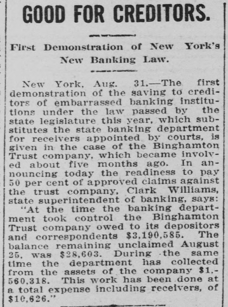 GOOD FOR CREDITORS. First Demonstration of New York's New Banking Law. New York, Aug. 31.-The first demonstration of the saving to creditors of embarrassed banking institutions under the law passed by the state legislature this year, which substitutes the state banking department for receivers appointed by courts, is given in the case of the Binghamton Trust company, which became involved about five months ago. In announcing today the readiness to pay 50 per cent of approved claims against the trust company, Clark Williams, state superintendent of banking, says: "At the time the banking department took control the Binghamton Trust company owed to its depositors and correspondents $3,190,585. The balance remaining unclaimed August 25, was $28,603. During the same time the department has collected from the assets of the company $1,560,318. This work has been done at a total expense including receivers, of $10,626."
