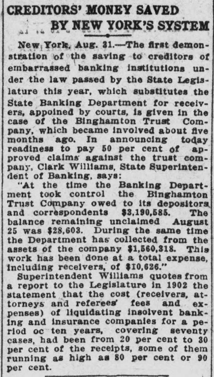 CREDITORS' MONEY SAVED BY NEW YORK'S SYSTEM New York, Aug. 31.-The first demonstration of the saving to creditors of embarrassed banking institutions under the law passed by the State Legislature this year, which substitutes the State Banking Department for receivers, appoined by courts, is given in the case of the Binghamton Trust Company, which became involved about five months ago. In announcing today readiness to pay 50 per cent of approved claims against the trust company, Clark Williams, State Superintendent of Banking, says: "At the time the Banking Department took control the Binghamton Trust Company owed to its depositors and correspondents $3,190,585. The balance remaining unclaimed August 25 was $28,603. During the same time the Department has collected from the assets of the company $1,560,318. This work has been done at a total expense, including receivers, of $10,626." Superintendent Williams quotes from a report to the Legislature in 1902 the statement that the cost (receivers, attorneys and referees' fees and expenses) of liquidating insolvent banking and insurance companies for a period oc ten years, covering seventy cases, had been from 20 per cent to 30 per cent of the receipts, some of them running as high as 80 per cent or 90 per cent.