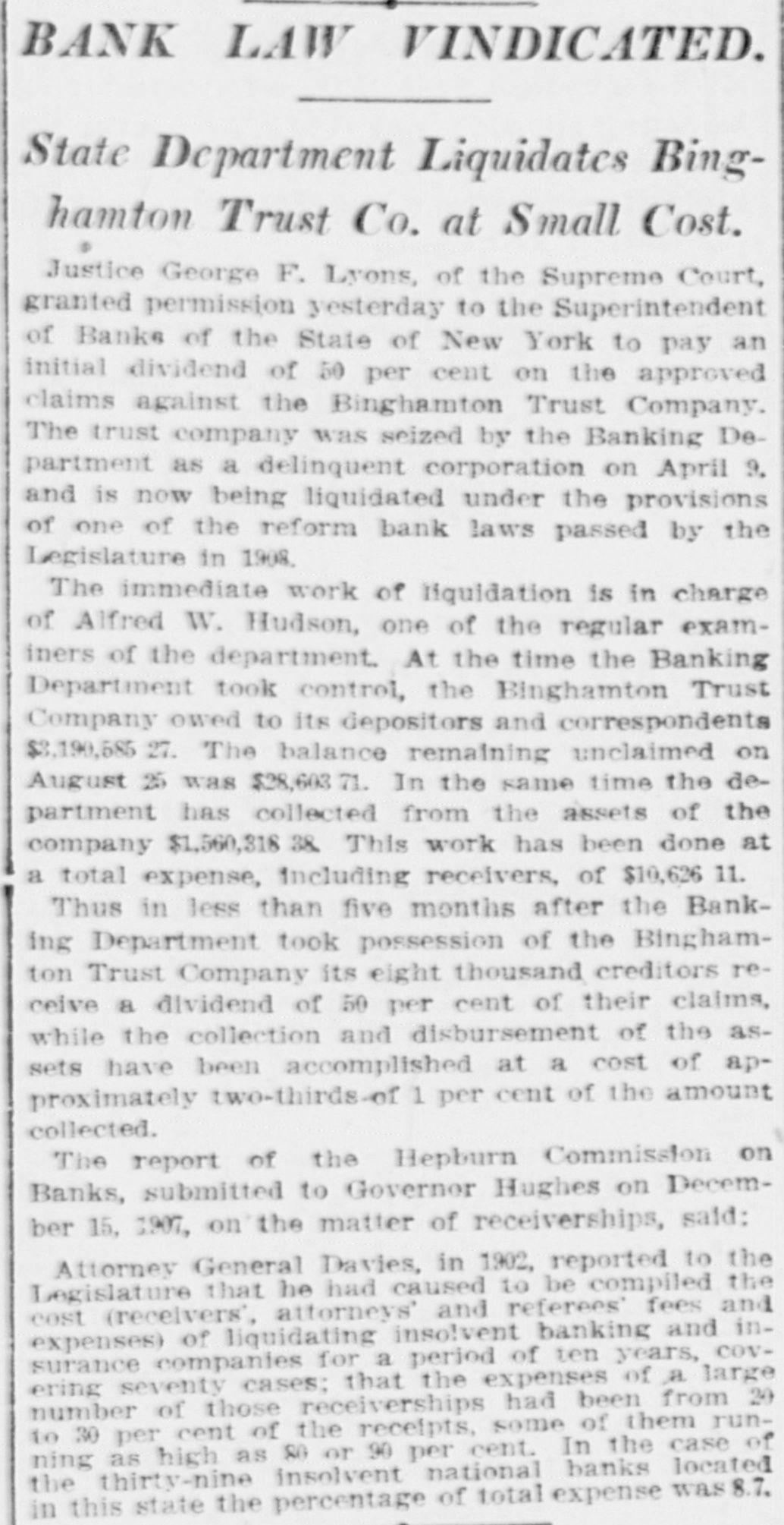 BANK LAW VINDICATED. State Department Liquidates Binghamton Trust Co. at Small Cost. Justice George F. Lyons, of the Supreme Court, granted permission yesterday to the Superintendent of Banks of the State of New York to pay an initial dividend of 50 per cent on the approved claims against the Binghamton Trust Company. The trust company was seized by the Banking Department as a delinquent corporation on April 9. and is now being liquidated under the provisions of one of the reform bank laws passed by the Legislature in 1908. The immediate work of liquidation is in charge of Alfred W. Hudson, one of the regular examiners of the department. At the time the Banking Department took control, the Binghamton Trust Company owed to its depositors and correspondents $3,190,685 27. The balance remaining unclaimed on August 25 was $28,603 71. In the same time the department has collected from the assets of the company $1,560,318.38 This work has been done at a total expense, including receivers, of $10,626 11. Thus in less than five months after the Banking Department took possession of the Binghamton Trust Company its eight thousand creditors receive a dividend of 50 per cent of their claims, while the collection and disbursement of the assets have been accomplished at a cost of approximately two-thirds-of 1 per cent of the amount collected. The report of the Hepburn Commission on Banks, submitted to Governor Hughes on December 15, 1907, on the matter of receiverships, said: Attorney General Davies, in 1902, reported to the Legislature that he had caused to be compiled the cost (receivers', attorneys' and referees fees and expenses) of liquidating insolvent banking and insurance companies for a period of ten years, COVering seventy cases: that the expenses of a large number of those receiverships had been from 20 to 30 per cent of the receipts, some of them running as high as 80 or 90 per cent. In the case of the thirty-nine insolvent national banks located in this state the percentage of total expense was 8.7.