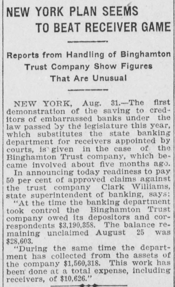 NEW YORK PLAN SEEMS TO BEAT RECEIVER GAME Reports from Handling of Binghamton Trust Company Show Figures That Are Unusual NEW YORK, Aug. 31.-The first demonstration of the saving to creditors of embarrassed banks under the law passed by the legislature this year, which substitutes the state banking department for receivers appointed by courts, is given in the case of the Binghamton Trust company, which became involved about five months ago. In announcing today readiness to pay 50 per cent of approved claims against the trust company Clark Williams, state superintendent of banking, says: "At the time the banking department took control the Binghamton Trust company owed its depositors and correspondents $3,190,358. The balance remaining unclaimed August 25 was $28,603. "During the same time the department has collected from the assets of the company $1,560,318. This work has been done at a total expense, including receivers, of $10,626."