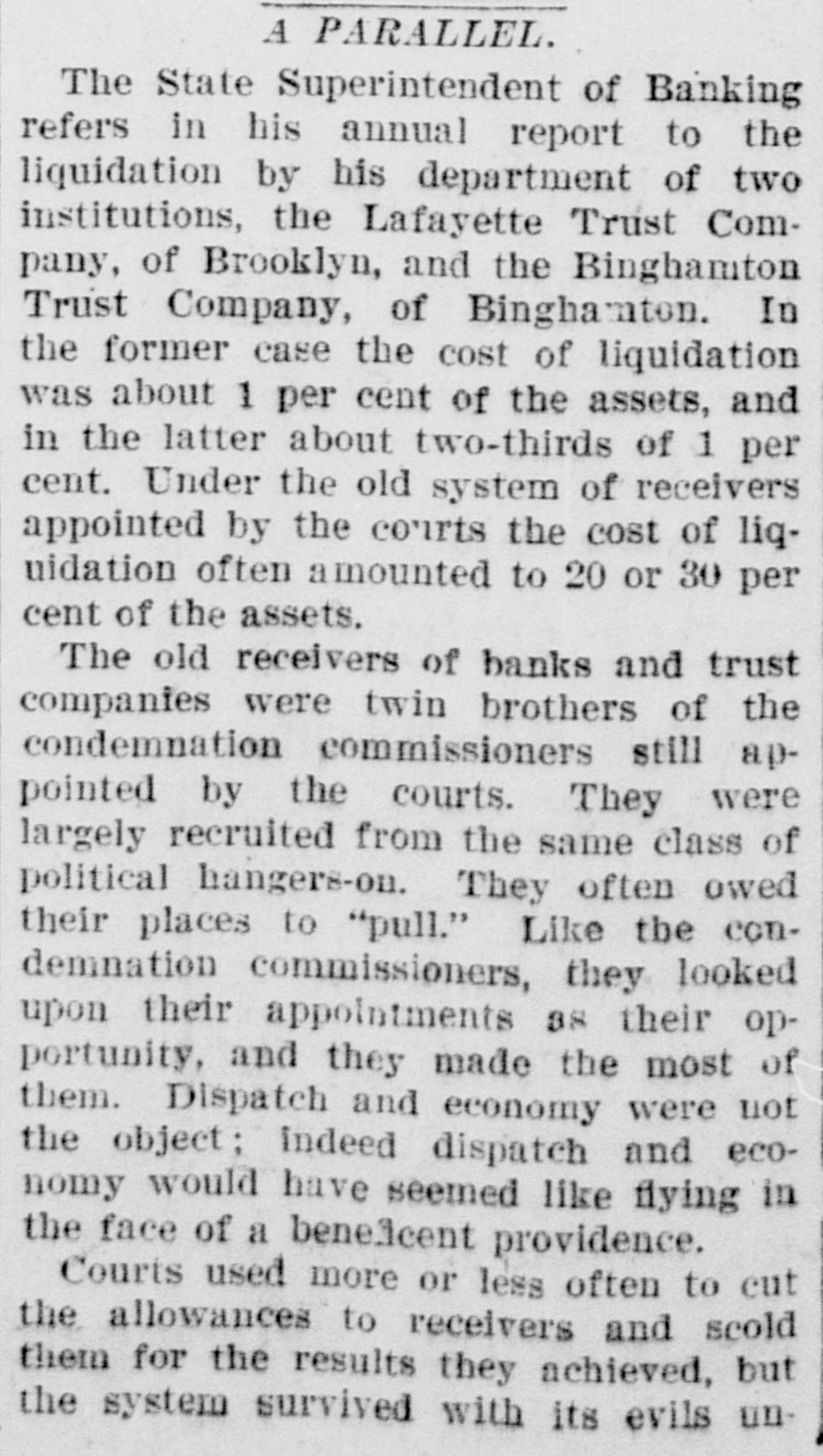 A PARALLEL. The State Superintendent of Banking refers in his annual report to the liquidation by his department of two institutions, the Lafayette Trust Company, of Brooklyn, and the Binghamton Trust Company, of Binghamton. In the former case the cost of liquidation was about 1 per cent of the assets, and in the latter about two-thirds of 1 per cent. Under the old system of receivers appointed by the courts the cost of liquidation often amounted to 20 or 30 per cent of the assets. The old receivers of banks and trust companies were twin brothers of the condemnation commissioners still appointed by the courts. They were largely recruited from the same class of political hangers-on. They often owed their places to "pull." Like the condemnation commissioners, they looked upon their appointments as their opportunity, and they made the most of them. Dispatch and economy were not the object; indeed dispatch and economy would have seemed like flying in the face of a beneAcent providence. Courts used more or less often to cut the allowances to receivers and scold them for the results they achieved, but the system survived with its evils un-