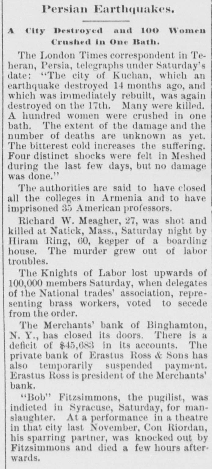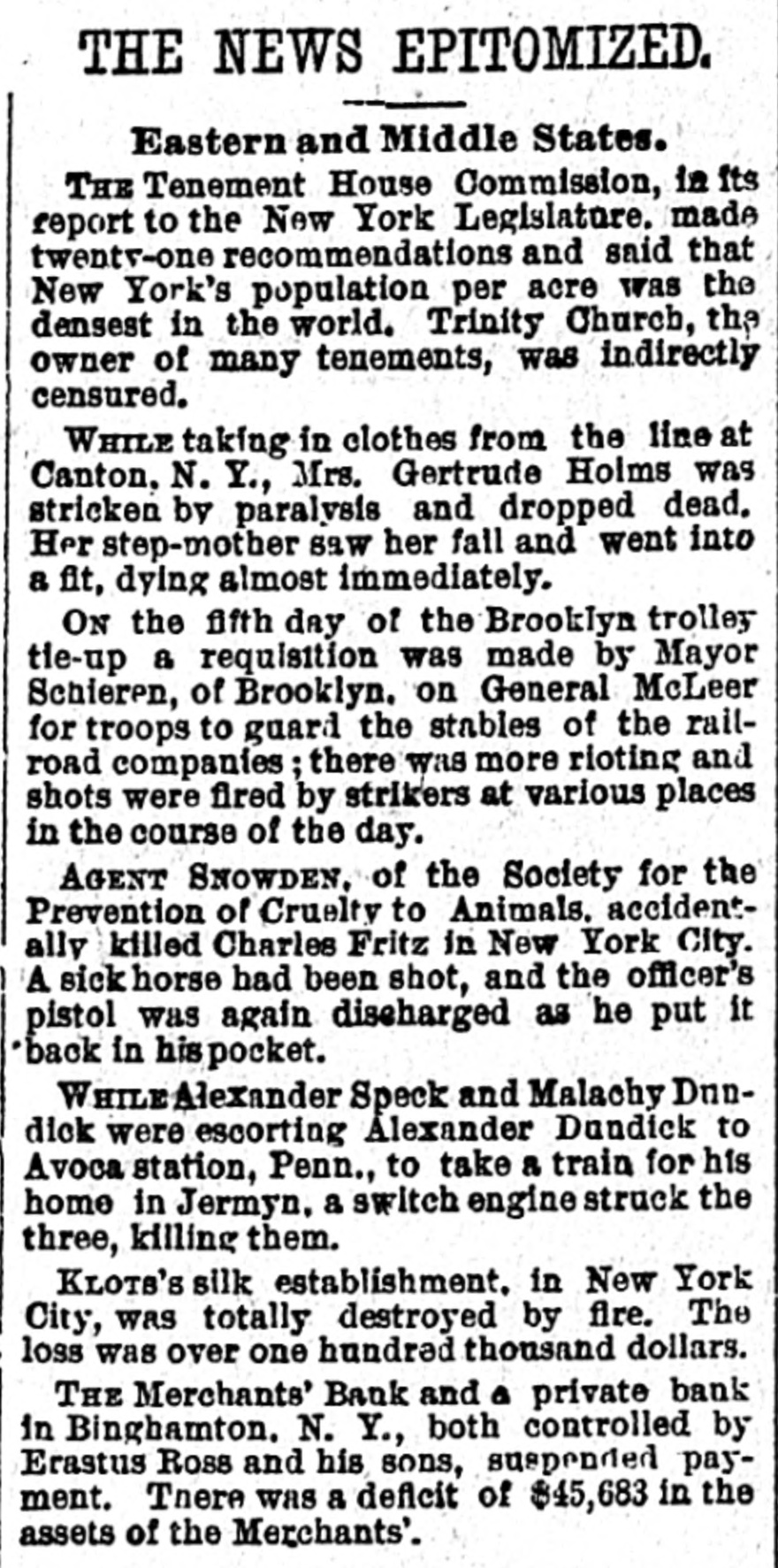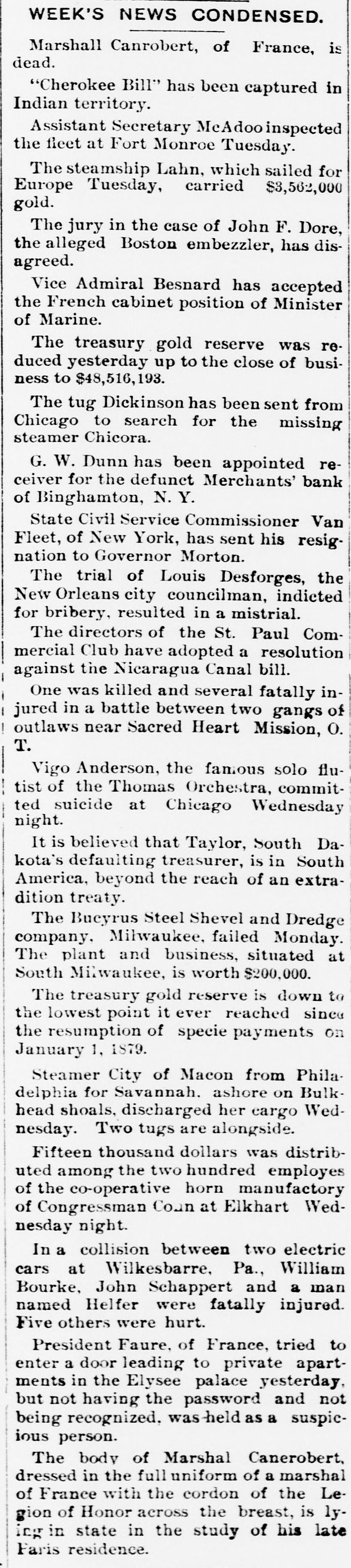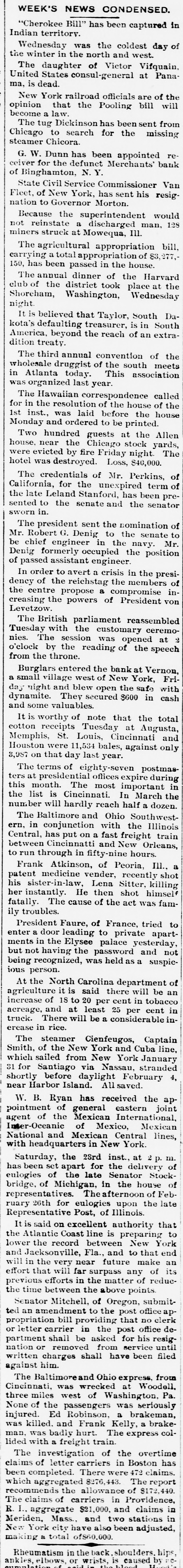 WEEK'S NEWS CONDENSED. "Cherokee Bill" has been captured in Indian territory. Assistant Secretary inspected the fleet at Fort Monroe Tuesday. The steamship Lahn, which sailed for Europe Tuesday, carried $3,562,000 gold. The jury in the case of John F. Dore, the alleged Boston embezzler, has disagreed. The daughter of Victor Vifquain, United States consul-general at Panama, is dead. New York railroad officials are of the opinion that the Pooling bill will become a law. There is abundant proof that the western pass agreement is in a tottering condition. The treasury gold reserve was reduced yesterday up to the close of business to $48,516,193. The tug Dickinson has been sent from Chicago to search for the missing steamer Chicora. G. W. Dunn has been appointed receiver for the defunct Merchants' bank of Binghamton, N. Y. State Civil Service Commissioner Van Fleet, of New York, has sent his resignation to Governor Morton. Because the superintendent would not reinstate a discharged man, 128 miners struck at Mowequa, Ill. The directors of the St. Paul Commercial Club have adopted a resolution against the Nicaragua Canal bill. The agricultural appropriation bill, carrying a total appropriation of $3,377,150, has been passed in the house. One was killed and several fatally injured in a battle between two gangs of outlaws near Sacred Heart Mission, O. T. Vigo Anderson, the famous solo flutist of the Thomas Orchestra, committed suicide at Chicago Wednesday night. It is believed that Taylor, South Dakota's defaulting treasurer, is in South America. beyond the reach of an extradition treaty. The Hawaiian correspondence called for in the resolution of the house of the 1st inst., was laid before the house Monday and ordered to be printed. Two hundred guests at the Allen house, near the Chicago stock yards, were evicted by fire Friday night. The hotel was destroyed. Loss, $40,000. Fifteen thousand dollars was distributed among the two hundred employes of the co-operative horn manufactory of Congressman Conn at Elkhart Wednesday night. Burglars entered the bank at Vernon, a small village west of New York. Friday night and blew open the safe with dynamite. They secured $600 in cash and some valuables. The terms of eighty-seven postmasters at presidential offices expire during this month. The most important in the list is Cincinnati. In March the number will hardly reach half a dozen. The Baltimore and Ohio Southwestern, in conjunction with the Illinois Central, has put on a fast freight train between Cincinnatti and New Orleans, to run through in fifty-nine hours. President Faure, of France, tried to enter a door leading to private apartments in the Elysee palace yesterday, but not having the password and not being recognized, was held as a suspicious person. W. B. Ryan has received the appointment of general eastern joint agent of the Mexican International, Inter-Oceanic of Mexico, Mexican National and Mexican Central lines, with headquarters in New York. Saturday, the 23rd inst., at 2 p. m. hasbeen set apart for the delivery of eulogies of the late Senator Stockbridge, of Michigan, in the house of representatives. The afternoon of February 26th for eulogies upon the late Representative Post, of Illinois. It is said on excellent authority that the Atlantic Coast line is preparing to lower the record between New York and Jacksonville, Fla., and to that end will in the very near future make an effort that will far surpass any of its previous efforts in the matter of reducthe time between the above points. Senator Mitchell, of Oregon, submitted an amendment to the post office appropriation bill providing that no clerk or letter carrier in the post office department shall be asked for his resignation or removed from service until written charges shall have been filed against him. The Baltimoreand Ohio express, from Cincinnati, was wrecked at Woodell, three miles west of Washington, Pa. None of the passengers was seriously injured. Ed Robinson, a brakeman, was killed. and Frank Kelly, a brakeman, was badly hurt. The express collided with a freight train. The investigation of the overtime claims of letter carriers in Boston has been completed. There were 472 claims. which aggregated $276,443. The report recommends the allowance of $172,440. The claims of carriers in Providence, R. I., aggregate $21,000, and claims in Meriden, Mass., and two stations in New York city have also been adjusted, making a total of $60,000. Non-suit was granted in Pittsburg yesterday in the case of Waring Brothers against the Pennsylvania railroad for $8,500,000. A suit for $1,500,000 was entered for alleged rebates due for freight on oil shipped. Two million dollars were asked as damage for discriminating against the firm. Fourteen years elapsed between the time of the alleged discrimination and the filing of