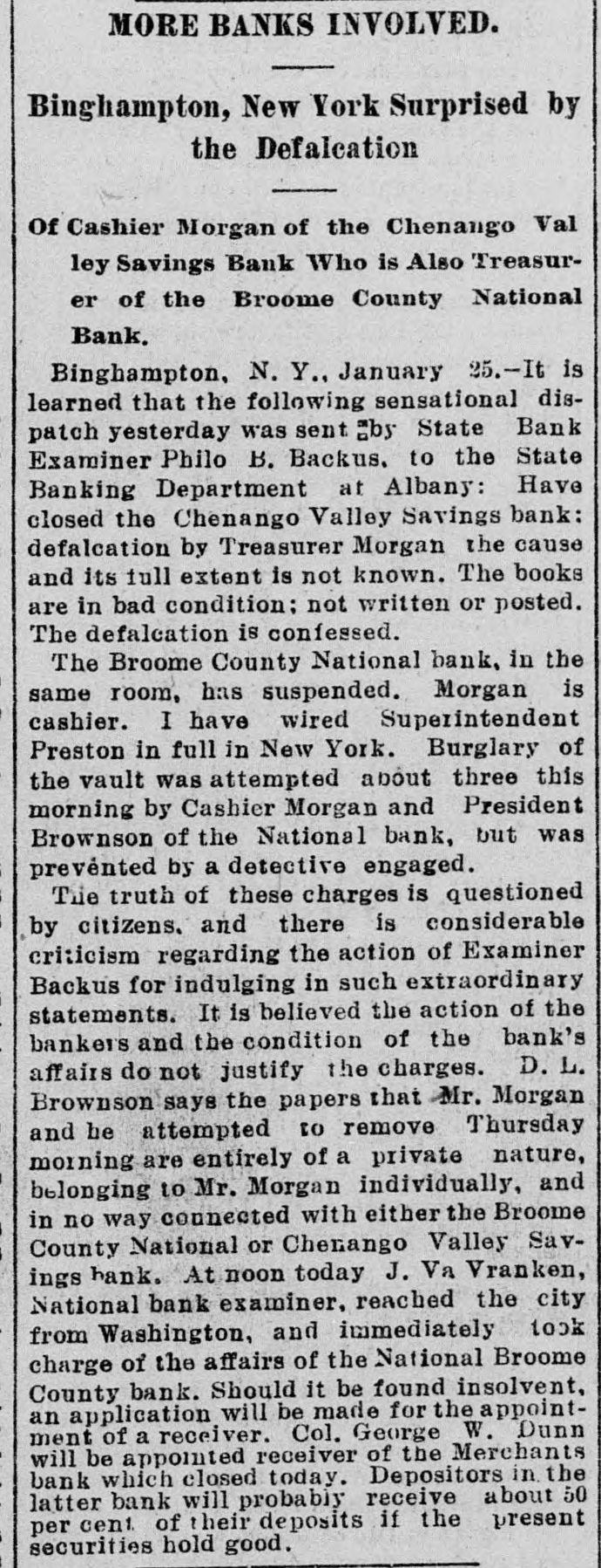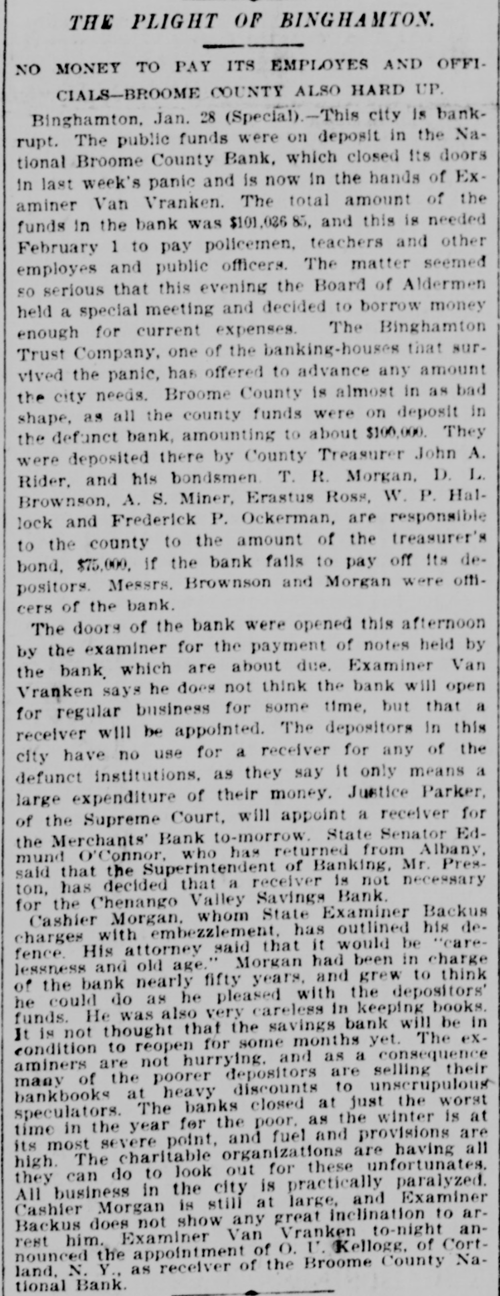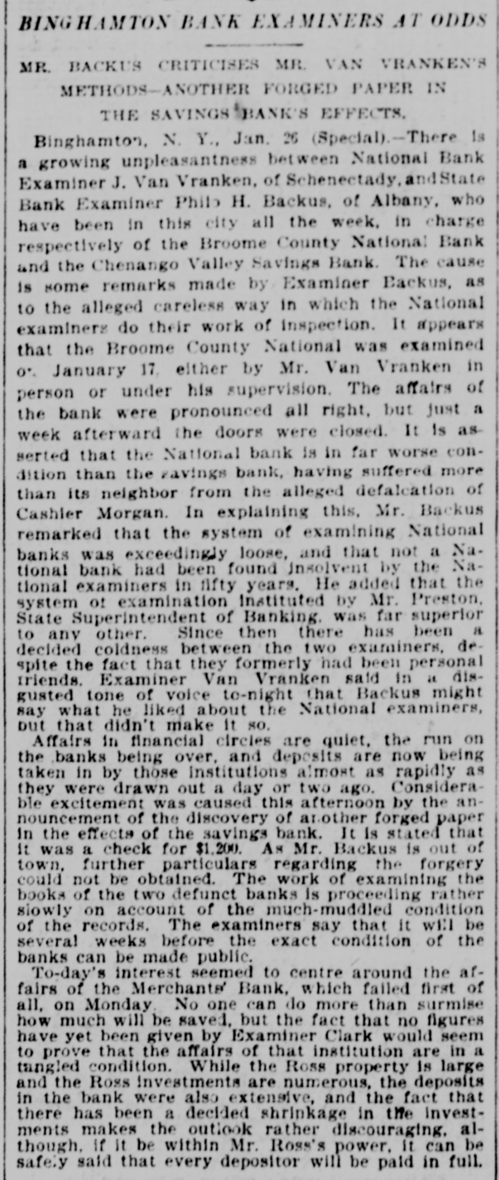 WEEK'S NEWS CONDENSED. "Cherokee Bill" has been captured in Indian territory. Assistant Secretary inspected the fleet at Fort Monroe Tuesday. The steamship Lahn, which sailed for Europe Tuesday, carried $3,562,000 gold. The jury in the case of John F. Dore, the alleged Boston embezzler, has disagreed. The daughter of Victor Vifquain, United States consul-general at Panama, is dead. New York railroad officials are of the opinion that the Pooling bill will become a law. There is abundant proof that the western pass agreement is in a tottering condition. The treasury gold reserve was reduced yesterday up to the close of business to $48,516,193. The tug Dickinson has been sent from Chicago to search for the missing steamer Chicora. G. W. Dunn has been appointed receiver for the defunct Merchants' bank of Binghamton, N. Y. State Civil Service Commissioner Van Fleet, of New York, has sent his resignation to Governor Morton. Because the superintendent would not reinstate a discharged man, 128 miners struck at Mowequa, Ill. The directors of the St. Paul Commercial Club have adopted a resolution against the Nicaragua Canal bill. The agricultural appropriation bill, carrying a total appropriation of $3,377,150, has been passed in the house. One was killed and several fatally injured in a battle between two gangs of outlaws near Sacred Heart Mission, O. T. Vigo Anderson, the famous solo flutist of the Thomas Orchestra, committed suicide at Chicago Wednesday night. It is believed that Taylor, South Dakota's defaulting treasurer, is in South America. beyond the reach of an extradition treaty. The Hawaiian correspondence called for in the resolution of the house of the 1st inst., was laid before the house Monday and ordered to be printed. Two hundred guests at the Allen house, near the Chicago stock yards, were evicted by fire Friday night. The hotel was destroyed. Loss, $40,000. Fifteen thousand dollars was distributed among the two hundred employes of the co-operative horn manufactory of Congressman Conn at Elkhart Wednesday night. Burglars entered the bank at Vernon, a small village west of New York. Friday night and blew open the safe with dynamite. They secured $600 in cash and some valuables. The terms of eighty-seven postmasters at presidential offices expire during this month. The most important in the list is Cincinnati. In March the number will hardly reach half a dozen. The Baltimore and Ohio Southwestern, in conjunction with the Illinois Central, has put on a fast freight train between Cincinnatti and New Orleans, to run through in fifty-nine hours. President Faure, of France, tried to enter a door leading to private apartments in the Elysee palace yesterday, but not having the password and not being recognized, was held as a suspicious person. W. B. Ryan has received the appointment of general eastern joint agent of the Mexican International, Inter-Oceanic of Mexico, Mexican National and Mexican Central lines, with headquarters in New York. Saturday, the 23rd inst., at 2 p. m. hasbeen set apart for the delivery of eulogies of the late Senator Stockbridge, of Michigan, in the house of representatives. The afternoon of February 26th for eulogies upon the late Representative Post, of Illinois. It is said on excellent authority that the Atlantic Coast line is preparing to lower the record between New York and Jacksonville, Fla., and to that end will in the very near future make an effort that will far surpass any of its previous efforts in the matter of reducthe time between the above points. Senator Mitchell, of Oregon, submitted an amendment to the post office appropriation bill providing that no clerk or letter carrier in the post office department shall be asked for his resignation or removed from service until written charges shall have been filed against him. The Baltimoreand Ohio express, from Cincinnati, was wrecked at Woodell, three miles west of Washington, Pa. None of the passengers was seriously injured. Ed Robinson, a brakeman, was killed. and Frank Kelly, a brakeman, was badly hurt. The express collided with a freight train. The investigation of the overtime claims of letter carriers in Boston has been completed. There were 472 claims. which aggregated $276,443. The report recommends the allowance of $172,440. The claims of carriers in Providence, R. I., aggregate $21,000, and claims in Meriden, Mass., and two stations in New York city have also been adjusted, making a total of $60,000. Non-suit was granted in Pittsburg yesterday in the case of Waring Brothers against the Pennsylvania railroad for $8,500,000. A suit for $1,500,000 was entered for alleged rebates due for freight on oil shipped. Two million dollars were asked as damage for discriminating against the firm. Fourteen years elapsed between the time of the alleged discrimination and the filing of