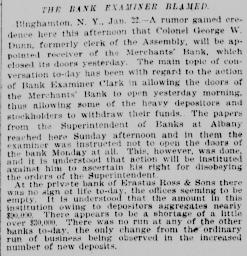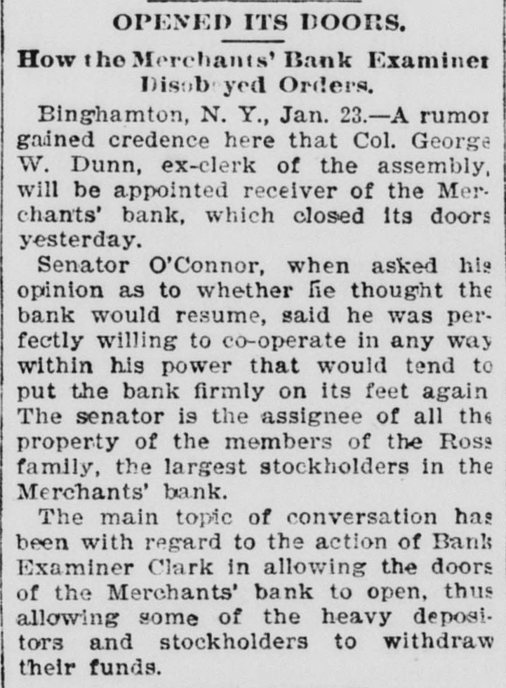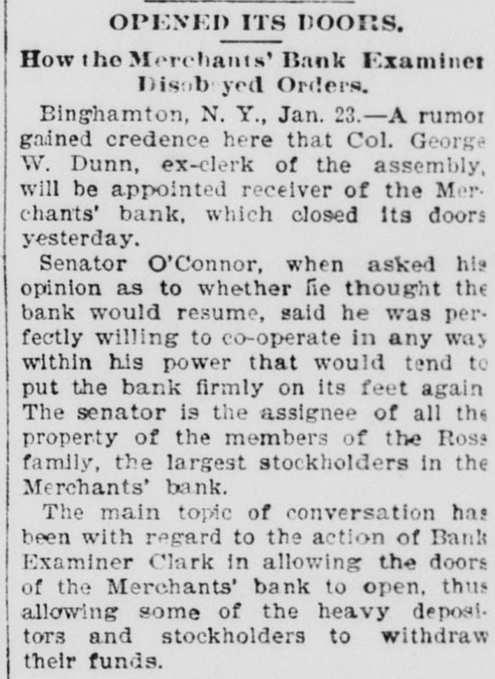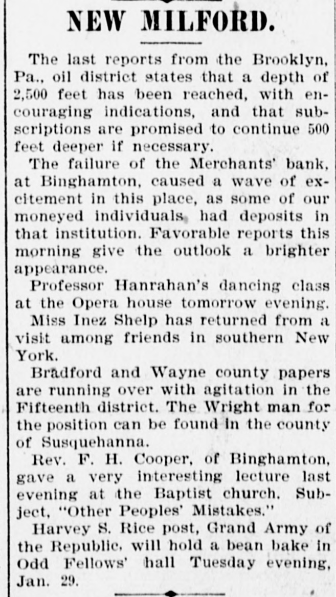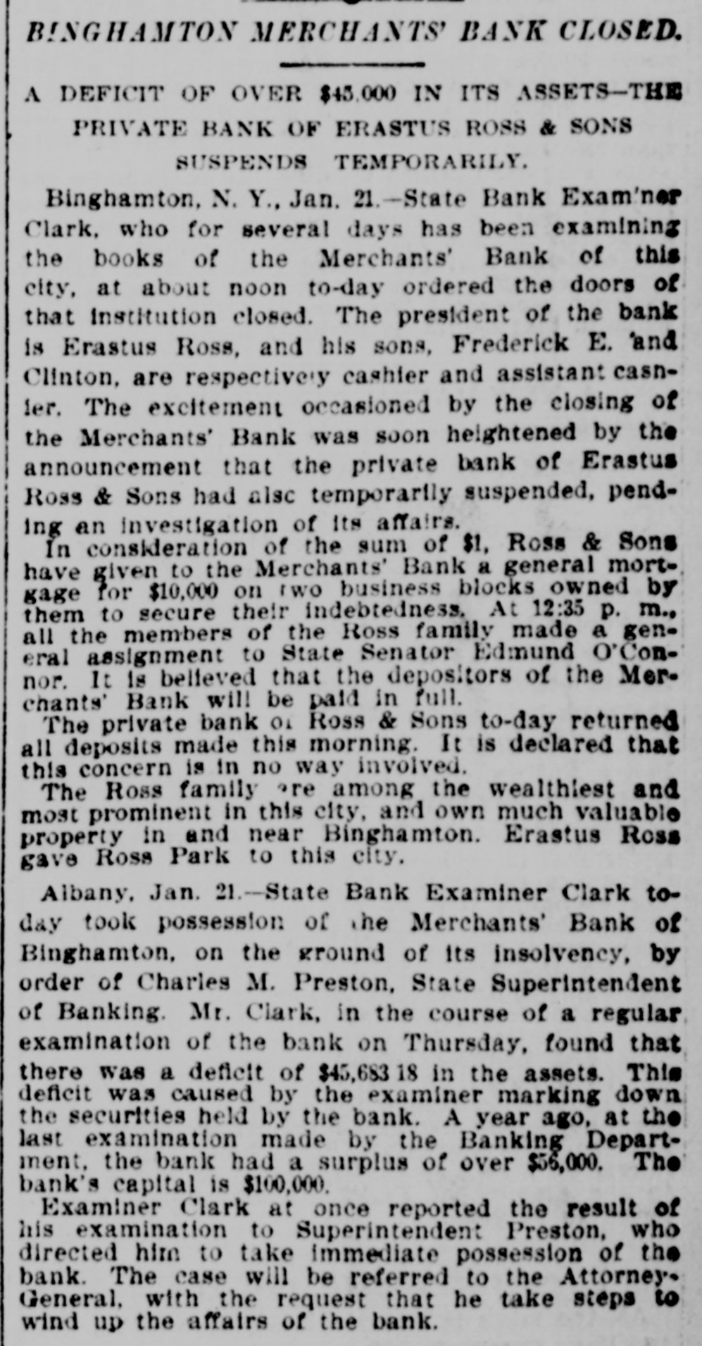 WEEK'S NEWS CONDENSED. "Cherokee Bill" has been captured in Indian territory. Assistant Secretary inspected the fleet at Fort Monroe Tuesday. The steamship Lahn, which sailed for Europe Tuesday, carried $3,562,000 gold. The jury in the case of John F. Dore, the alleged Boston embezzler, has disagreed. The daughter of Victor Vifquain, United States consul-general at Panama, is dead. New York railroad officials are of the opinion that the Pooling bill will become a law. There is abundant proof that the western pass agreement is in a tottering condition. The treasury gold reserve was reduced yesterday up to the close of business to $48,516,193. The tug Dickinson has been sent from Chicago to search for the missing steamer Chicora. G. W. Dunn has been appointed receiver for the defunct Merchants' bank of Binghamton, N. Y. State Civil Service Commissioner Van Fleet, of New York, has sent his resignation to Governor Morton. Because the superintendent would not reinstate a discharged man, 128 miners struck at Mowequa, Ill. The directors of the St. Paul Commercial Club have adopted a resolution against the Nicaragua Canal bill. The agricultural appropriation bill, carrying a total appropriation of $3,377,150, has been passed in the house. One was killed and several fatally injured in a battle between two gangs of outlaws near Sacred Heart Mission, O. T. Vigo Anderson, the famous solo flutist of the Thomas Orchestra, committed suicide at Chicago Wednesday night. It is believed that Taylor, South Dakota's defaulting treasurer, is in South America. beyond the reach of an extradition treaty. The Hawaiian correspondence called for in the resolution of the house of the 1st inst., was laid before the house Monday and ordered to be printed. Two hundred guests at the Allen house, near the Chicago stock yards, were evicted by fire Friday night. The hotel was destroyed. Loss, $40,000. Fifteen thousand dollars was distributed among the two hundred employes of the co-operative horn manufactory of Congressman Conn at Elkhart Wednesday night. Burglars entered the bank at Vernon, a small village west of New York. Friday night and blew open the safe with dynamite. They secured $600 in cash and some valuables. The terms of eighty-seven postmasters at presidential offices expire during this month. The most important in the list is Cincinnati. In March the number will hardly reach half a dozen. The Baltimore and Ohio Southwestern, in conjunction with the Illinois Central, has put on a fast freight train between Cincinnatti and New Orleans, to run through in fifty-nine hours. President Faure, of France, tried to enter a door leading to private apartments in the Elysee palace yesterday, but not having the password and not being recognized, was held as a suspicious person. W. B. Ryan has received the appointment of general eastern joint agent of the Mexican International, Inter-Oceanic of Mexico, Mexican National and Mexican Central lines, with headquarters in New York. Saturday, the 23rd inst., at 2 p. m. hasbeen set apart for the delivery of eulogies of the late Senator Stockbridge, of Michigan, in the house of representatives. The afternoon of February 26th for eulogies upon the late Representative Post, of Illinois. It is said on excellent authority that the Atlantic Coast line is preparing to lower the record between New York and Jacksonville, Fla., and to that end will in the very near future make an effort that will far surpass any of its previous efforts in the matter of reducthe time between the above points. Senator Mitchell, of Oregon, submitted an amendment to the post office appropriation bill providing that no clerk or letter carrier in the post office department shall be asked for his resignation or removed from service until written charges shall have been filed against him. The Baltimoreand Ohio express, from Cincinnati, was wrecked at Woodell, three miles west of Washington, Pa. None of the passengers was seriously injured. Ed Robinson, a brakeman, was killed. and Frank Kelly, a brakeman, was badly hurt. The express collided with a freight train. The investigation of the overtime claims of letter carriers in Boston has been completed. There were 472 claims. which aggregated $276,443. The report recommends the allowance of $172,440. The claims of carriers in Providence, R. I., aggregate $21,000, and claims in Meriden, Mass., and two stations in New York city have also been adjusted, making a total of $60,000. Non-suit was granted in Pittsburg yesterday in the case of Waring Brothers against the Pennsylvania railroad for $8,500,000. A suit for $1,500,000 was entered for alleged rebates due for freight on oil shipped. Two million dollars were asked as damage for discriminating against the firm. Fourteen years elapsed between the time of the alleged discrimination and the filing of