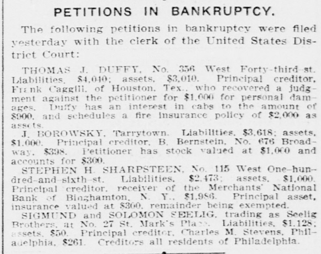 # PETITIONS IN BANKRUPTCY. The following petitions in bankruptcy were filed yesterday with the clerk of the United States District Court: THOMAS J. DUFFY, No. 356 West Forty-third-st. Liabilities, $4,040; assets, $3,010. Principal creditor, Frank Caggili, of Houston, Tex., who recovered a judgment against the petitioner for $1,000 for personal damages. Duffy has an interest in cabs to the amount of $900, and schedules a fire insurance policy of $2,000 as assets. J. BOROWSKY, Tarrytown. Liabilities, $3,618; assets, $1,000. Principal creditor, B. Bernstein, No. 676 Broadway, $398. Petitioner has stock valued at $1,000 and accounts for $300. STEPHEN H. SHARPSTEEN, No. 115 West One-hundred-and-sixth-st. Liabilities, $2,473; assets, $1,000. Principal creditor, receiver of the Merchants' National Bank of Binghamton, N. Y., $1,986. Principal asset, insurance valued at $300, remainder being exempted. SIGMUND and SOLOMON SEELIG, trading as Seelig Brothers, at No. 27 St. Mark's Place. Liabilities, $1,128; assets, $50. Principal creditor, Charles M. Stevens, Philadelphia, $261. Creditors all residents of Philadelphia.
