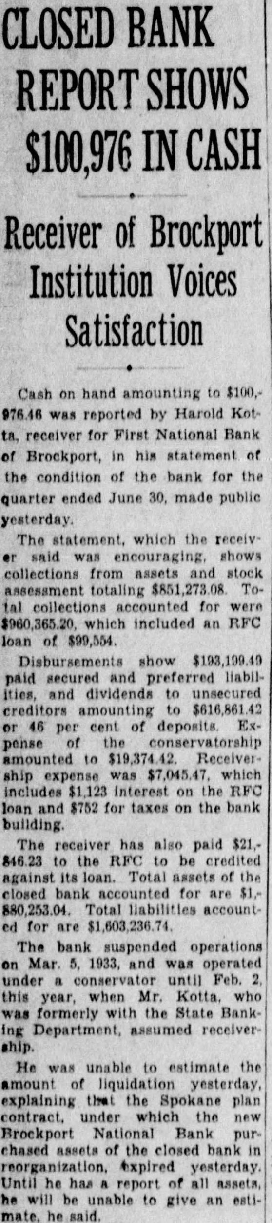 CLOSED BANK REPORT SHOWS $100,976 IN CASH Receiver of Brockport Institution Voices Satisfaction Cash on hand amounting to $100,976.46 was reported by Harold Kotta. receiver for First National Bank of Brockport, in his statement of the condition of the bank for the quarter ended June 30, made public The statement. which the receivor said was encouraging. shows collections from assets and stock assessment totaling $851,273.08 Total collections accounted for were $960,365.20. which included an RFC loan of $99,554 Disbursements show $193,199.49 paid secured and preferred liabilities, and dividends to unsecured creditors amounting to $616,861.42 or 46 per cent of deposits. Expense of the conservatorship amounted to $19,374.42 Receivership expense was $7,045.47. which includes $1,123 interest on the RFC loan and $752 for taxes on the bank The receiver has also paid $21.846.23 to the RFC to be credited against its loan. Total assets of the closed bank accounted for are $1,880,253.04. Total liabilities accounted for are $1,603,236.74 The bank suspended operations on Mar. 5, 1933, and was operated under conservator until Feb. 2. this year, when Mr. Kotta. who was formerly with the State Banking Department, assumed receivership. He was unable to estimate the amount of liquidation yesterday, explaining that the Spokane plan contract. under which the new Brockport National Bank purchased assets of the closed bank in reorganization, expired yesterday. Until he has report of all assets, he will be unable to give an estimate. he said.