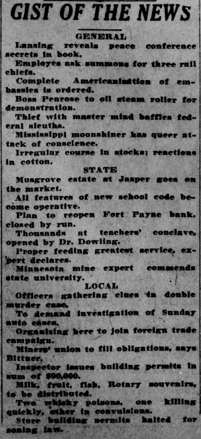 GIST OF THE NEWS GENERAL Lansing reveals peace conference secrets in book. Employes ask summons for three rail chiefs. Complete Americanisation of embassies is ordered. Boss Penrose to oil steam roller for demonstration. Thief with master mind baffles federal sleuths. Mississippi moonshiner has queer attack of conscience. Irregular course in stocks; reactions in cotton. STATE Musgrove estate at Jasper goes on the market. All features of new school code become operative. Plan to reopen Fort Payne bank, closed by run. Thousands at teachers' conclave, opened by Dr. Dowling. Proper feeding greatest service, expert declares. Minnesota mine expert commends state university. LOCAL Officers gathering clues in double murder cane. To demand investigation of Sunday auto canen. Organizing here to join foreign trade campaign. Miners' union to fill obligations, says Bittner. Inspector issues building permits in sum of $90,000. Milk, fruit, fish, Rotary souvenirs, to be distributed. Two whisky poisons, one killing quickly, other in convulsions. Store building permits halted for soning law.