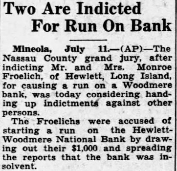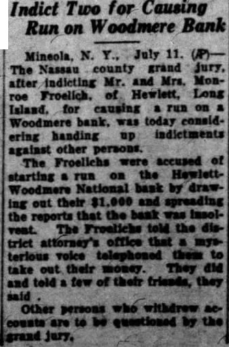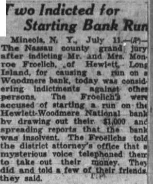 The Froelichs were accused of starting a run on the Hewlett-Woodmere National Bank by drawing out their $1,000 and spreading reports that the bank was insolvent.