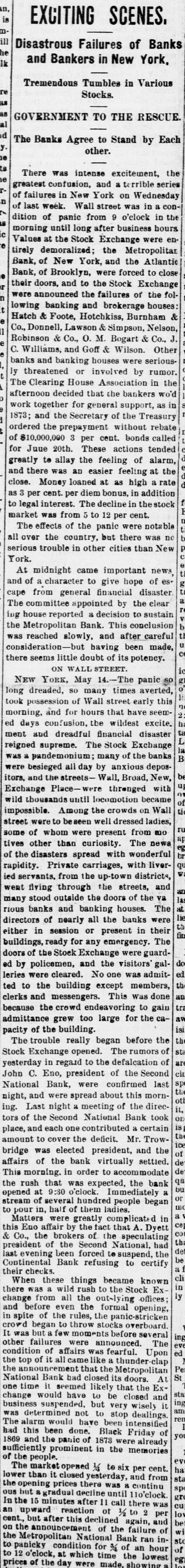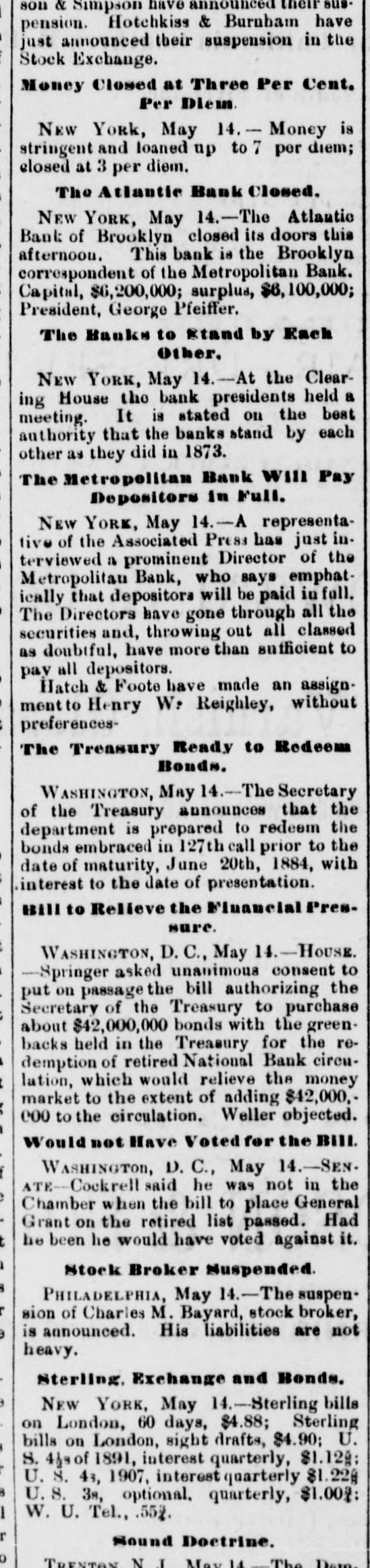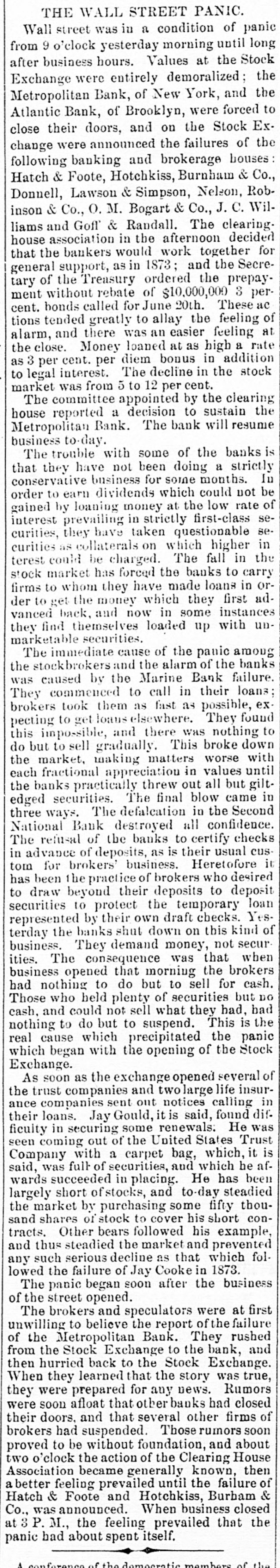 THE WALL STREET PANIC. Wall street was in a condition of panic from 9 o'clock yesterday morning until long after business hours. Values at the Stock Exchange were entirely demoralized the Metropolitan Bank, of New York, and the Atlantic Bank, of Brooklyn, were forced to close their doors, and on the Stock Exchange were announced the failures of the following banking and brokerage houses : Hatch & Foote, Hotchkiss, Burnham & Co., Donnell, Lawson & Simpson, Nelson, Robinson & Co., O. M. Bogart & Co., J. C. Williams and Goff & Randall. The clearinghouse association in the afternoon decided that the bankers would work together for general support, as in 1873; and the Secretary of the Treasury ordered the prepayment without rebate of $10,000,000 3 percent. bonds called for June 20th. These ac tions tended greatly to allay the feeling of alarm, and there was an easier feeling at the close. Money loaned at as high a rate as 3 per cent. per diem bonus in addition to legal interest. The decline in the stock market was from 5 to 12 per cent. The committee appointed by the clearing house reported a decision to sustain the Metropolitan Bank. The bank will resume business to-day. The trouble with some of the banks is that they have not been doing a strictly conservative business for some months. In order to earn dividends which could not be gained by loaning money at the low rate of interest prevailing in strictly first-class securities, they have taken questionable securities as collaterals on which higher in terest could be charged. The fall in the stock market has forced the banks to carry firms to whom they have made loans in order to get the money which they first advanced back, and now in some instances they find themselves loaded up with unmarketable securities. The immediate cause of the panic among the stockbrokers and the alarm of the banks was caused by the Marine Bank failure. They commenced to call in their loans ; brokers took them as fast as possible, expecting to get loans elsewhere. They found this impossible, and there was nothing to do but to sell gradually. This broke down the market, making matters worse with each fractional appreciation in values until the banks practically threw out all but giltedged securities. The final blow came in three ways. The defalcation in the Second National Bank destroyed all confidence. The refusal of the banks to certify checks in advance of deposits, as is their usual custom for brokers' business. Heretofore it has been the practice of brokers who desired to draw beyond their deposits to deposit securities to protect the temporary loan represented by their own draft checks. Yesterday the banks shut down on this kind of business. They demand money, not secur ities. The consequence was that when business opened that morning the brokers had nothing to do but to sell for cash. Those who held plenty of securities but DO cash, and could not sell what they had, bad nothing to do but to suspend. This is the real cause which precipitated the panic which began with the opening of the Stock Exchange. As soon as the exchange opened several of the trust companies and twolarge life insurance companies sent out notices calling in their loans. Jay Gould, it is said, found difficulty in securing some renewals: He was seen coming out of the United States Trust Company with a carpet bag, which, it is said, was full of securities, and which he afwards succeeded in placing. He has been largely short of stocks, and to-day steadied the market by purchasing some fifty thousand shares of stock to cover his short contracts. Other bears followed his example, and thus steadied the market and prevented any such serious decline as that which followed the failure of Jay Cooke in 1873. The panic began soon after the business of the street opened. The brokers and speculators were at first unwilling to believe the report of the failure of the Metropolitan Bank. They rushed from the Stock Exchange to the bank, and then hurried back to the Stock Exchange. When they learned that the story was true, they were prepared for any news. Rumors were soon afloat that other banks had closed