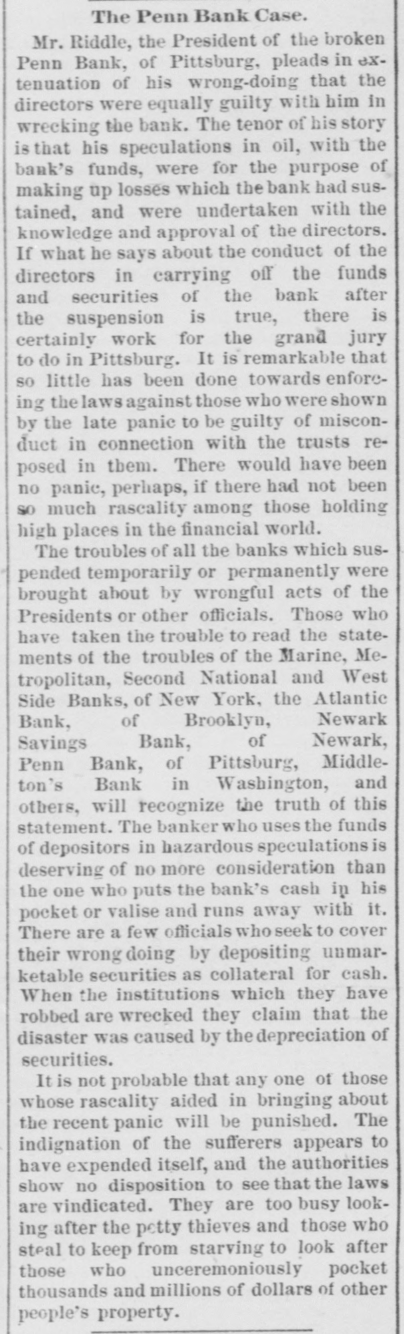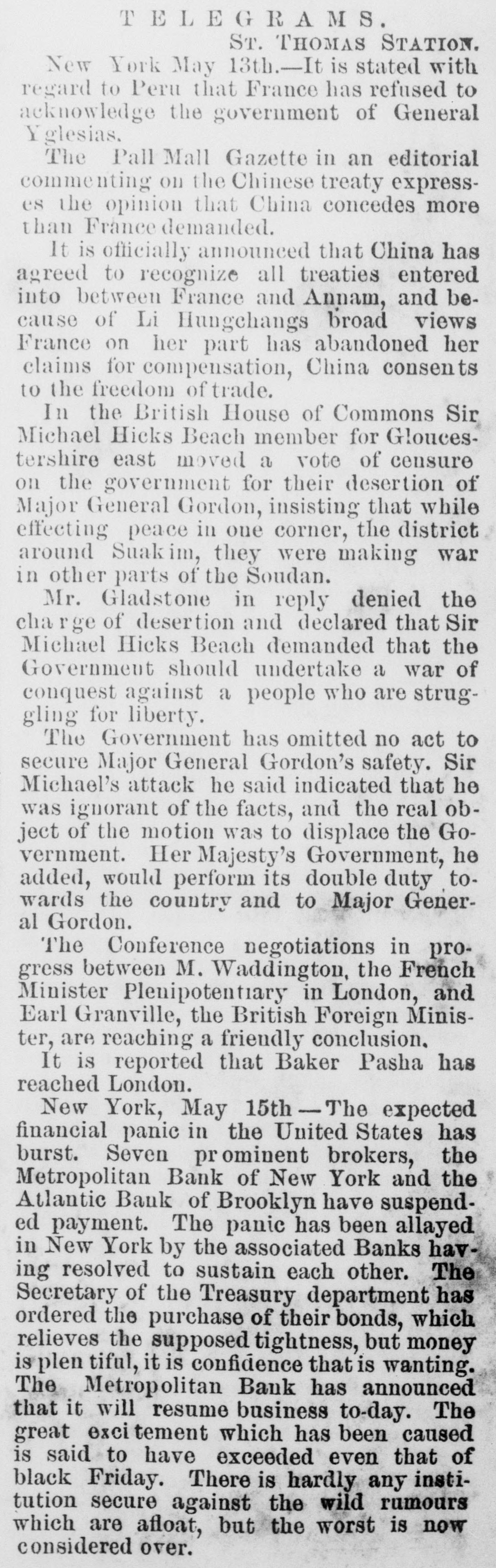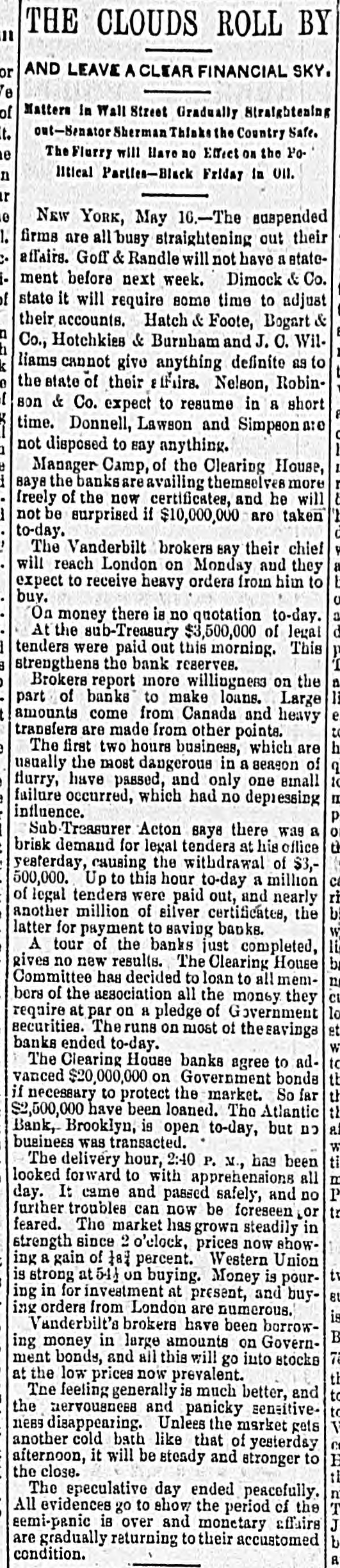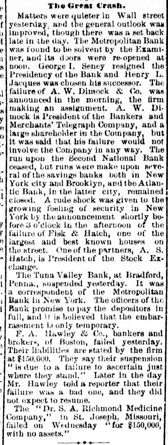 THE WALL STREET PANIC. Wall street was in a condition of panic from 9 o'clock yesterday morning until long after business hours. Values at the Stock Exchange were entirely demoralized the Metropolitan Bank, of New York, and the Atlantic Bank, of Brooklyn, were forced to close their doors, and on the Stock Exchange were announced the failures of the following banking and brokerage houses : Hatch & Foote, Hotchkiss, Burnham & Co., Donnell, Lawson & Simpson, Nelson, Robinson & Co., O. M. Bogart & Co., J. C. Williams and Goff & Randall. The clearinghouse association in the afternoon decided that the bankers would work together for general support, as in 1873; and the Secretary of the Treasury ordered the prepayment without rebate of $10,000,000 3 percent. bonds called for June 20th. These ac tions tended greatly to allay the feeling of alarm, and there was an easier feeling at the close. Money loaned at as high a rate as 3 per cent. per diem bonus in addition to legal interest. The decline in the stock market was from 5 to 12 per cent. The committee appointed by the clearing house reported a decision to sustain the Metropolitan Bank. The bank will resume business to-day. The trouble with some of the banks is that they have not been doing a strictly conservative business for some months. In order to earn dividends which could not be gained by loaning money at the low rate of interest prevailing in strictly first-class securities, they have taken questionable securities as collaterals on which higher in terest could be charged. The fall in the stock market has forced the banks to carry firms to whom they have made loans in order to get the money which they first advanced back, and now in some instances they find themselves loaded up with unmarketable securities. The immediate cause of the panic among the stockbrokers and the alarm of the banks was caused by the Marine Bank failure. They commenced to call in their loans ; brokers took them as fast as possible, expecting to get loans elsewhere. They found this impossible, and there was nothing to do but to sell gradually. This broke down the market, making matters worse with each fractional appreciation in values until the banks practically threw out all but giltedged securities. The final blow came in three ways. The defalcation in the Second National Bank destroyed all confidence. The refusal of the banks to certify checks in advance of deposits, as is their usual custom for brokers' business. Heretofore it has been the practice of brokers who desired to draw beyond their deposits to deposit securities to protect the temporary loan represented by their own draft checks. Yesterday the banks shut down on this kind of business. They demand money, not secur ities. The consequence was that when business opened that morning the brokers had nothing to do but to sell for cash. Those who held plenty of securities but DO cash, and could not sell what they had, bad nothing to do but to suspend. This is the real cause which precipitated the panic which began with the opening of the Stock Exchange. As soon as the exchange opened several of the trust companies and twolarge life insurance companies sent out notices calling in their loans. Jay Gould, it is said, found difficulty in securing some renewals: He was seen coming out of the United States Trust Company with a carpet bag, which, it is said, was full of securities, and which he afwards succeeded in placing. He has been largely short of stocks, and to-day steadied the market by purchasing some fifty thousand shares of stock to cover his short contracts. Other bears followed his example, and thus steadied the market and prevented any such serious decline as that which followed the failure of Jay Cooke in 1873. The panic began soon after the business of the street opened. The brokers and speculators were at first unwilling to believe the report of the failure of the Metropolitan Bank. They rushed from the Stock Exchange to the bank, and then hurried back to the Stock Exchange. When they learned that the story was true, they were prepared for any news. Rumors were soon afloat that other banks had closed