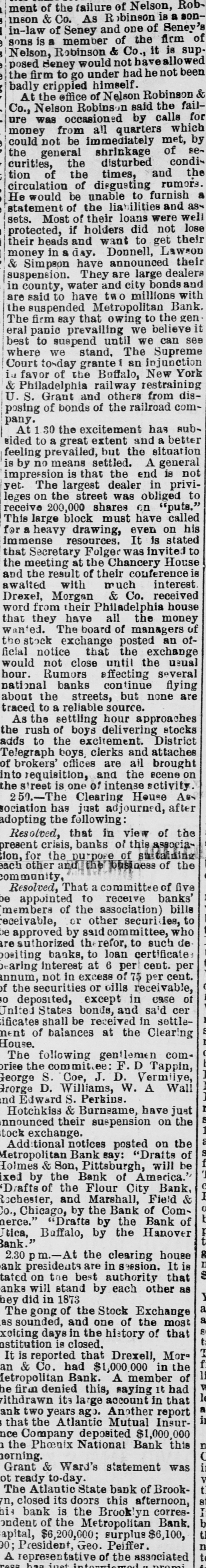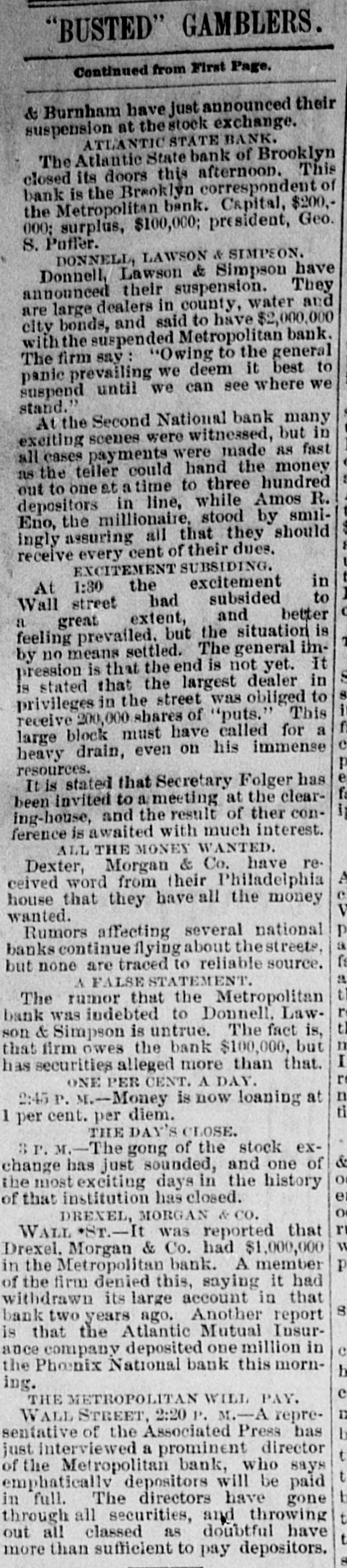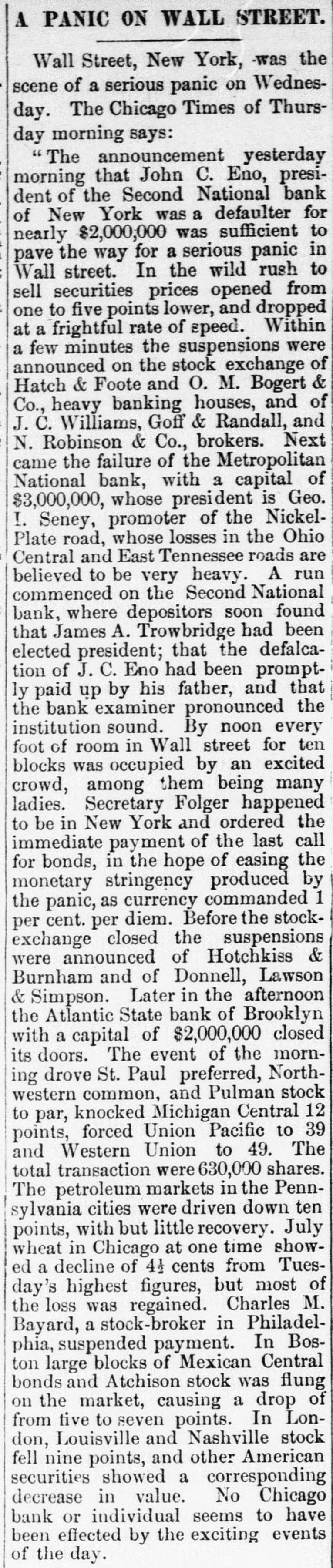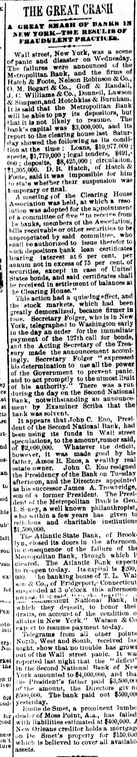 E THE GREAT CRASH GREAT SMASH OF BANKS IN NEW YORK-THE RESULTS OF FRAUDULENT PRACTICES. Wall street, New York, was a scene of panic and disaster on Wednesday. The failures were announced of the Metropolitan Bank, and the firms of Hatch & Foote, Nelson Robinson & Co., O. & Co., Goff & Co., J. C. M. Williams Bogart Donnell, & Burnham. Randall, Lawson & Simpson, and Hotchkiss & It said that the Metropolitan Bank will be able to pay its depositors, but that it is not likely to resuine. The bank's capital was $3,000,000, and its report to the clearing house last Saturday showed the following as its condition at the time : Loans, $10,977.000; specie, $1,779,000 legal tenders, $491, 000 deposits, $8,425,000 circulation, & $1,305,000. D. B. Hatch, of Hatch Foote, said it was impossible for him state whether their suspension was temporary or final. A meeting of the Clearing House Association was held, at which a reso lution was adopted for the appointment of a committee of five to receive from be banks, members of the Association, bills receivable or other securities to be appropriated by said committee, who shall be authorized to issue therefor to bank loan certificates interest at 6 per per such bearing depositors cent. cent. in excess of 75 per of in case securities, annum not except of United shall States bonds, and said certificates be received in settlement of balances at he Clearing House." had a quieding effect, and the in This stock action markets, became which had firmer been Folger, tone. greatly Secretary demoralized, who is in New telegraphed to Washington early in an order for York, the day call the for immediate bonds, payment of the 127th and Secretary made the sury the Acting announcement of the accord- Treaingly. Secretary Folger " expressed his determination to use all the power of the Government to prevent panic, and to act promptly to the utmost limit ey of his authority.' There was a run re the on the during day Second announce National et Bank, notwithstanding all st men' by Examiner Scriba that the ets bank was solvent. Lee It appears that John C. Eno, President of the Second National Bank, had rtbeen using its funds in Wall street speculations, to the amount,rumor said, nd of $2,000,000. Whatever the deficit, however, it was made good by his 08father, Amos R. Enos, a wealthy real estate owner. John C. Eno resigned an the Presidency of the Bank on Tuesday afternoon, and the Directors appointed to as his successor James A. Trowbridge, son of a former President. The Presiod dent of the Metropolitan Bank is Geo. I. Sauey, a well known philanthropist, his who within a few years has given to religious and charitable institutions ub $1,500,000. The Atlantic State Bank, of Brookleft lyn, closed its doors in the afternoon BOL in conseqnence of the failure of the Mecropolitan Bank, through which it 'BOD cleared. The Atlantic Bank expects to re-open to-day. Its capital 18 $200, ex 000. he banking house of T. L. Wat son & Co., of Bridgeport, Connecticut for suspended at 3 o'clock this afternoon owing. 1: said, inabilities - connecticut National Bank, in which they deposit, to honor thei Pen drafts, on account of the condition o atlairs in New York." Watson & Co oto leit expect to resume payment to-day. Telegrams from all other points ery North, West and South, received las No. night, show that no trouble has grown out of the Wall street panic. It wa rket reported last night that the deficit the in the Second National Bank of New York amounted to $4,000,000, and tha en if the President's father paid $3,500,000 iver the amount, the Directors giv n 624 $500,000. The bank paid out $500,00 codyesterday. Emile de Smet, a prominent lumbe for dealer of Moss Point, A.a., has failed food with liabilities estimated at $400,000. A New Orleans creditor holds a mortgage ness on De Smet's property for $150,000 on't whiele is believed to cover all available ture assets. -