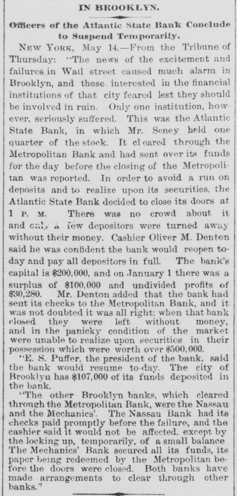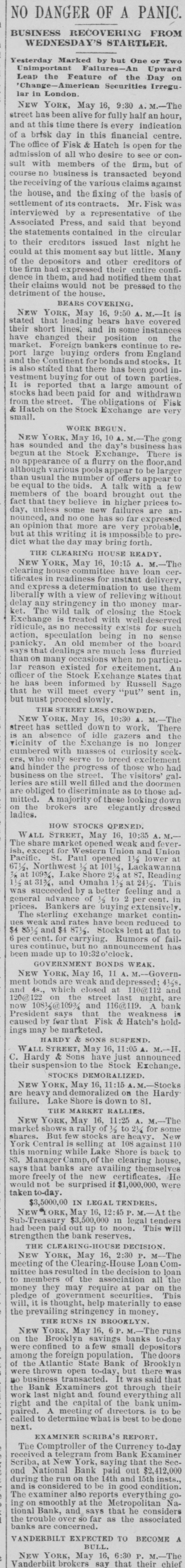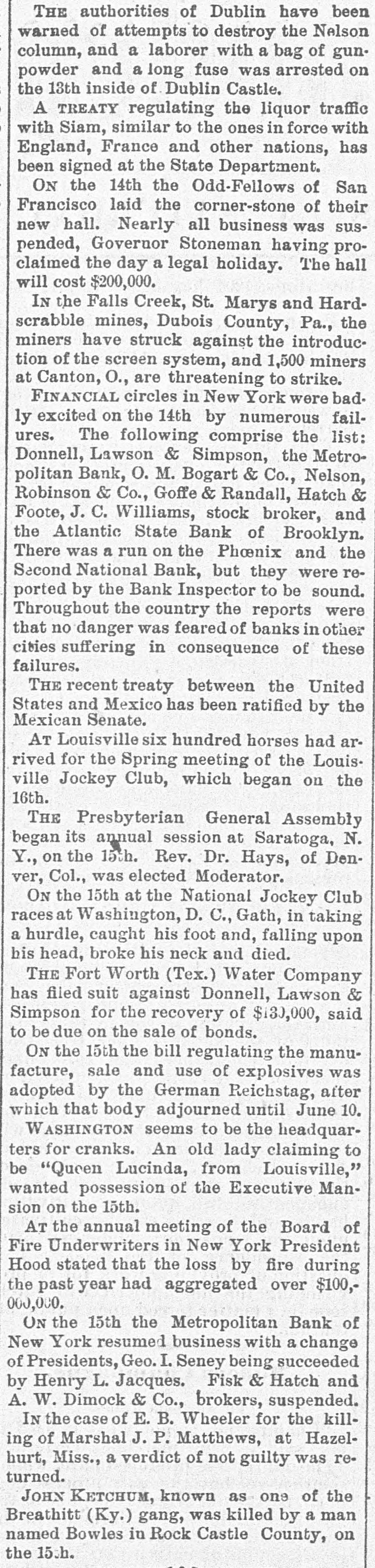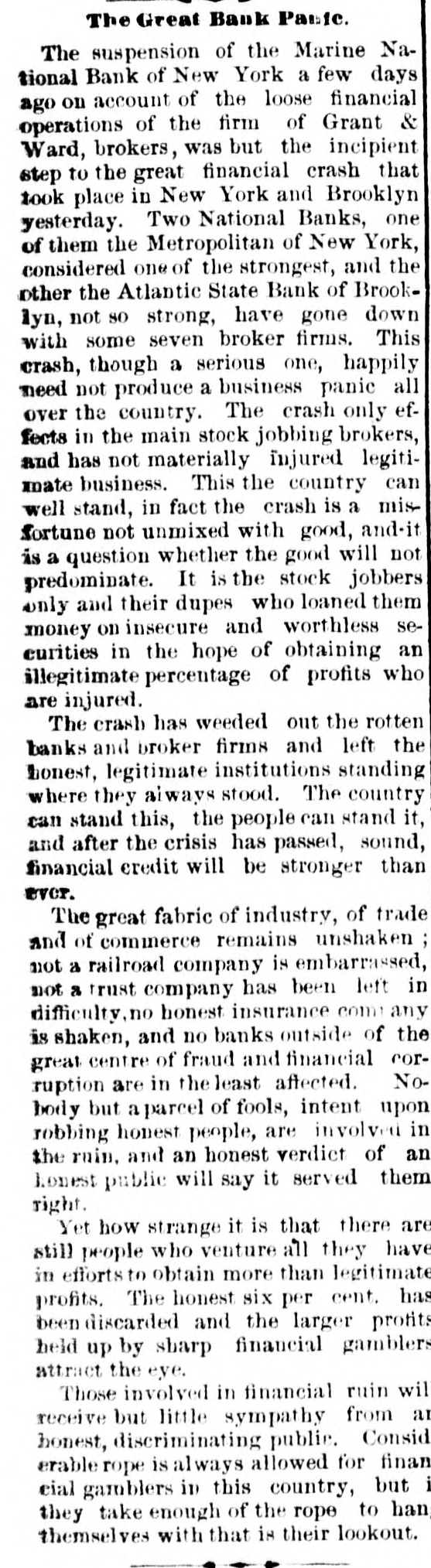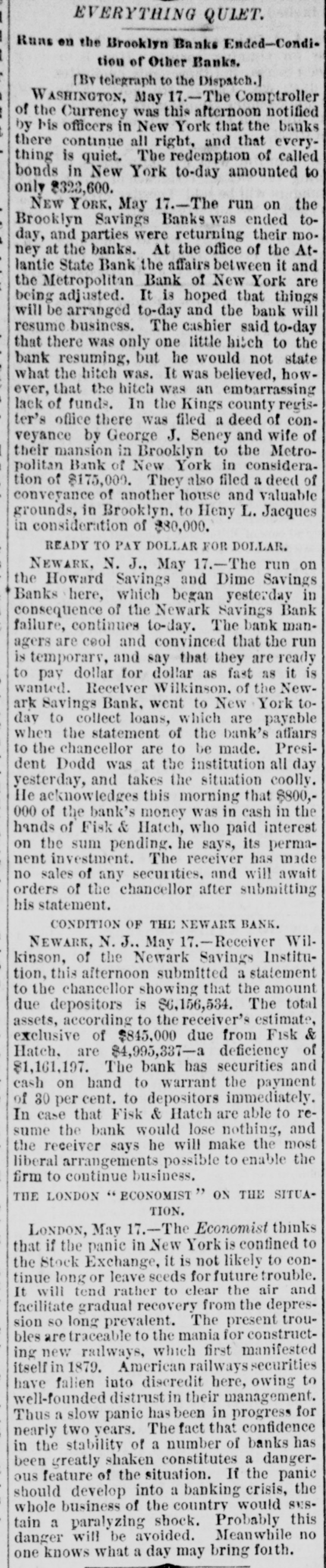 E THE GREAT CRASH GREAT SMASH OF BANKS IN NEW YORK-THE RESULTS OF FRAUDULENT PRACTICES. Wall street, New York, was a scene of panic and disaster on Wednesday. The failures were announced of the Metropolitan Bank, and the firms of Hatch & Foote, Nelson Robinson & Co., O. & Co., Goff & Co., J. C. M. Williams Bogart Donnell, & Burnham. Randall, Lawson & Simpson, and Hotchkiss & It said that the Metropolitan Bank will be able to pay its depositors, but that it is not likely to resuine. The bank's capital was $3,000,000, and its report to the clearing house last Saturday showed the following as its condition at the time : Loans, $10,977.000; specie, $1,779,000 legal tenders, $491, 000 deposits, $8,425,000 circulation, & $1,305,000. D. B. Hatch, of Hatch Foote, said it was impossible for him state whether their suspension was temporary or final. A meeting of the Clearing House Association was held, at which a reso lution was adopted for the appointment of a committee of five to receive from be banks, members of the Association, bills receivable or other securities to be appropriated by said committee, who shall be authorized to issue therefor to bank loan certificates interest at 6 per per such bearing depositors cent. cent. in excess of 75 per of in case securities, annum not except of United shall States bonds, and said certificates be received in settlement of balances at he Clearing House." had a quieding effect, and the in This stock action markets, became which had firmer been Folger, tone. greatly Secretary demoralized, who is in New telegraphed to Washington early in an order for York, the day call the for immediate bonds, payment of the 127th and Secretary made the sury the Acting announcement of the accord- Treaingly. Secretary Folger " expressed his determination to use all the power of the Government to prevent panic, and to act promptly to the utmost limit ey of his authority.' There was a run re the on the during day Second announce National et Bank, notwithstanding all st men' by Examiner Scriba that the ets bank was solvent. Lee It appears that John C. Eno, President of the Second National Bank, had rtbeen using its funds in Wall street speculations, to the amount,rumor said, nd of $2,000,000. Whatever the deficit, however, it was made good by his 08father, Amos R. Enos, a wealthy real estate owner. John C. Eno resigned an the Presidency of the Bank on Tuesday afternoon, and the Directors appointed to as his successor James A. Trowbridge, son of a former President. The Presiod dent of the Metropolitan Bank is Geo. I. Sauey, a well known philanthropist, his who within a few years has given to religious and charitable institutions ub $1,500,000. The Atlantic State Bank, of Brookleft lyn, closed its doors in the afternoon BOL in conseqnence of the failure of the Mecropolitan Bank, through which it 'BOD cleared. The Atlantic Bank expects to re-open to-day. Its capital 18 $200, ex 000. he banking house of T. L. Wat son & Co., of Bridgeport, Connecticut for suspended at 3 o'clock this afternoon owing. 1: said, inabilities - connecticut National Bank, in which they deposit, to honor thei Pen drafts, on account of the condition o atlairs in New York." Watson & Co oto leit expect to resume payment to-day. Telegrams from all other points ery North, West and South, received las No. night, show that no trouble has grown out of the Wall street panic. It wa rket reported last night that the deficit the in the Second National Bank of New York amounted to $4,000,000, and tha en if the President's father paid $3,500,000 iver the amount, the Directors giv n 624 $500,000. The bank paid out $500,00 codyesterday. Emile de Smet, a prominent lumbe for dealer of Moss Point, A.a., has failed food with liabilities estimated at $400,000. A New Orleans creditor holds a mortgage ness on De Smet's property for $150,000 on't whiele is believed to cover all available ture assets. -