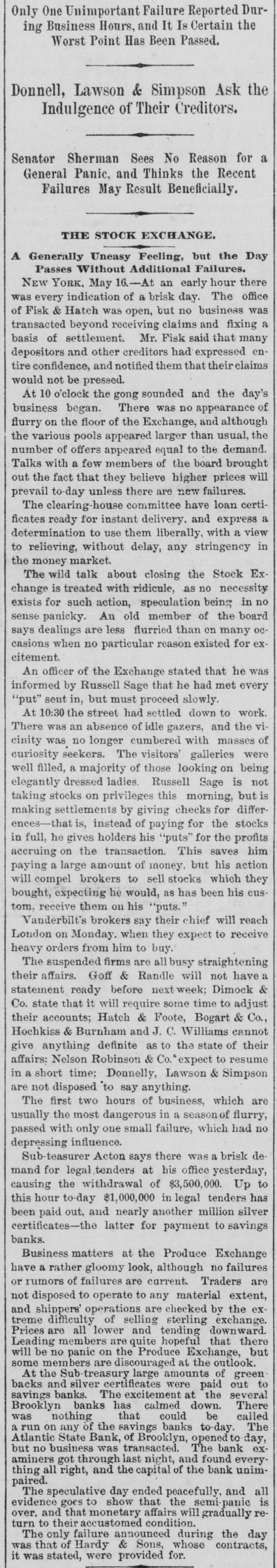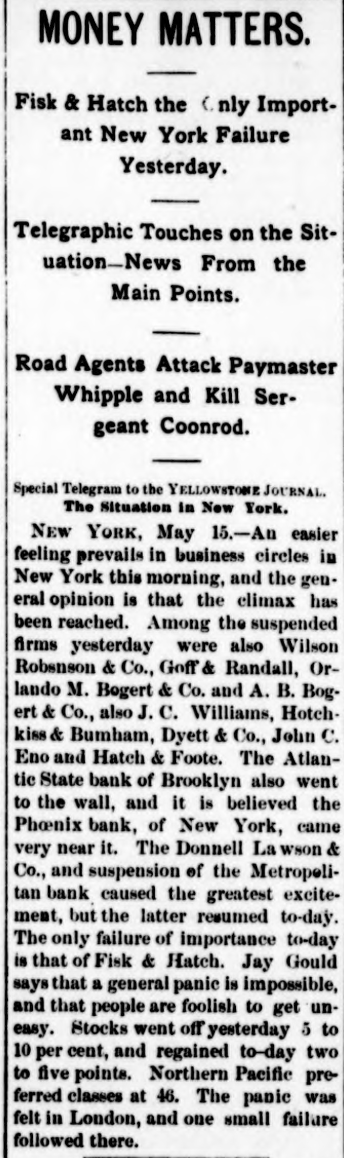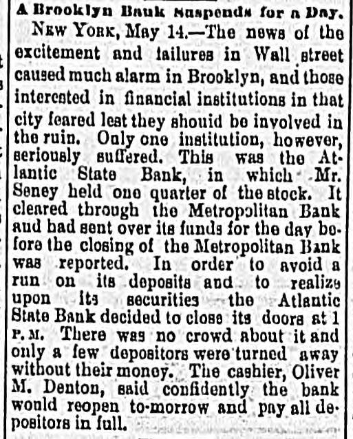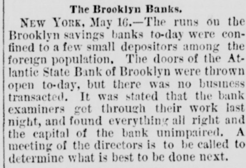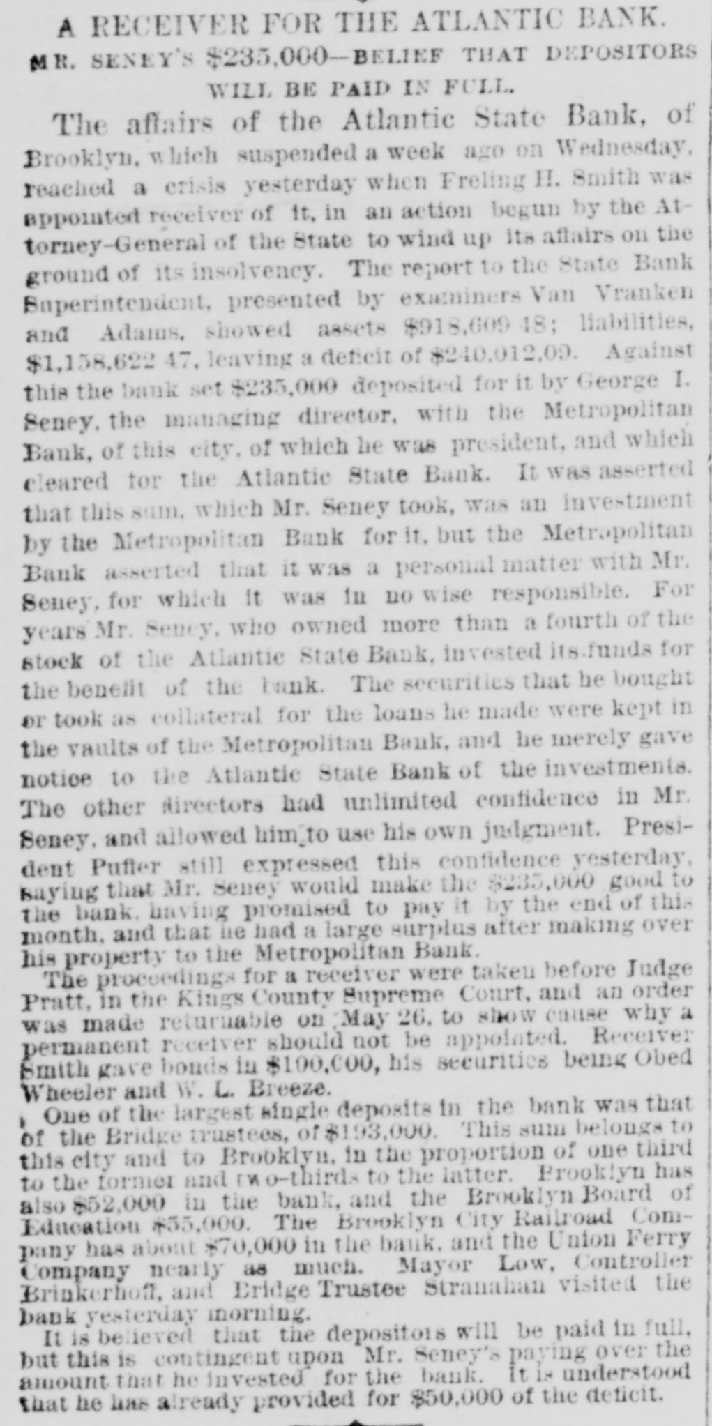 E THE GREAT CRASH GREAT SMASH OF BANKS IN NEW YORK-THE RESULTS OF FRAUDULENT PRACTICES. Wall street, New York, was a scene of panic and disaster on Wednesday. The failures were announced of the Metropolitan Bank, and the firms of Hatch & Foote, Nelson Robinson & Co., O. & Co., Goff & Co., J. C. M. Williams Bogart Donnell, & Burnham. Randall, Lawson & Simpson, and Hotchkiss & It said that the Metropolitan Bank will be able to pay its depositors, but that it is not likely to resuine. The bank's capital was $3,000,000, and its report to the clearing house last Saturday showed the following as its condition at the time : Loans, $10,977.000; specie, $1,779,000 legal tenders, $491, 000 deposits, $8,425,000 circulation, & $1,305,000. D. B. Hatch, of Hatch Foote, said it was impossible for him state whether their suspension was temporary or final. A meeting of the Clearing House Association was held, at which a reso lution was adopted for the appointment of a committee of five to receive from be banks, members of the Association, bills receivable or other securities to be appropriated by said committee, who shall be authorized to issue therefor to bank loan certificates interest at 6 per per such bearing depositors cent. cent. in excess of 75 per of in case securities, annum not except of United shall States bonds, and said certificates be received in settlement of balances at he Clearing House." had a quieding effect, and the in This stock action markets, became which had firmer been Folger, tone. greatly Secretary demoralized, who is in New telegraphed to Washington early in an order for York, the day call the for immediate bonds, payment of the 127th and Secretary made the sury the Acting announcement of the accord- Treaingly. Secretary Folger " expressed his determination to use all the power of the Government to prevent panic, and to act promptly to the utmost limit ey of his authority.' There was a run re the on the during day Second announce National et Bank, notwithstanding all st men' by Examiner Scriba that the ets bank was solvent. Lee It appears that John C. Eno, President of the Second National Bank, had rtbeen using its funds in Wall street speculations, to the amount,rumor said, nd of $2,000,000. Whatever the deficit, however, it was made good by his 08father, Amos R. Enos, a wealthy real estate owner. John C. Eno resigned an the Presidency of the Bank on Tuesday afternoon, and the Directors appointed to as his successor James A. Trowbridge, son of a former President. The Presiod dent of the Metropolitan Bank is Geo. I. Sauey, a well known philanthropist, his who within a few years has given to religious and charitable institutions ub $1,500,000. The Atlantic State Bank, of Brookleft lyn, closed its doors in the afternoon BOL in conseqnence of the failure of the Mecropolitan Bank, through which it 'BOD cleared. The Atlantic Bank expects to re-open to-day. Its capital 18 $200, ex 000. he banking house of T. L. Wat son & Co., of Bridgeport, Connecticut for suspended at 3 o'clock this afternoon owing. 1: said, inabilities - connecticut National Bank, in which they deposit, to honor thei Pen drafts, on account of the condition o atlairs in New York." Watson & Co oto leit expect to resume payment to-day. Telegrams from all other points ery North, West and South, received las No. night, show that no trouble has grown out of the Wall street panic. It wa rket reported last night that the deficit the in the Second National Bank of New York amounted to $4,000,000, and tha en if the President's father paid $3,500,000 iver the amount, the Directors giv n 624 $500,000. The bank paid out $500,00 codyesterday. Emile de Smet, a prominent lumbe for dealer of Moss Point, A.a., has failed food with liabilities estimated at $400,000. A New Orleans creditor holds a mortgage ness on De Smet's property for $150,000 on't whiele is believed to cover all available ture assets. -