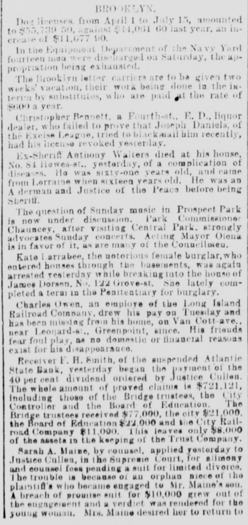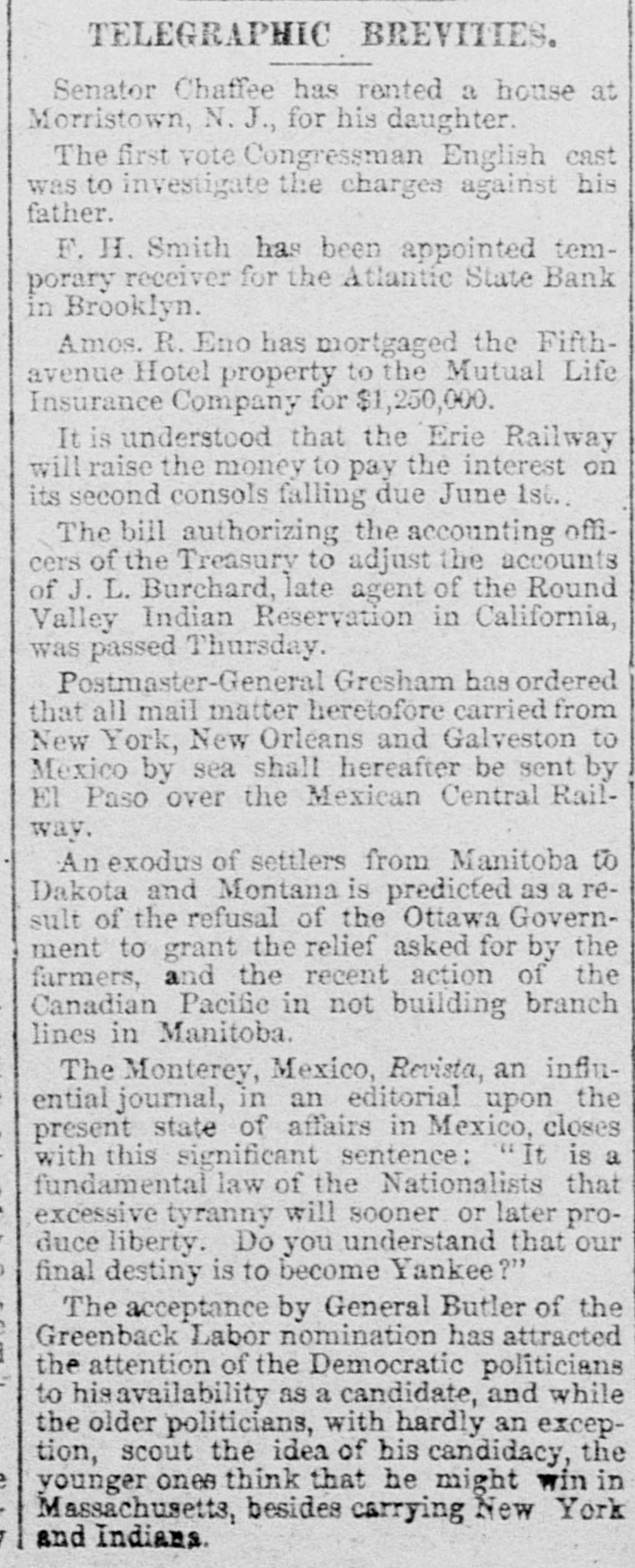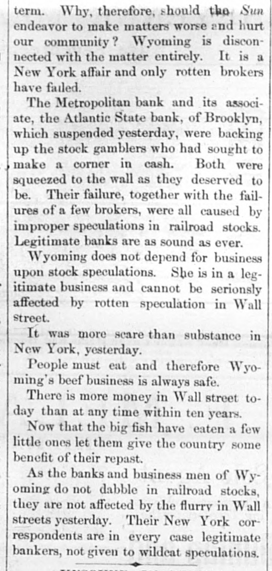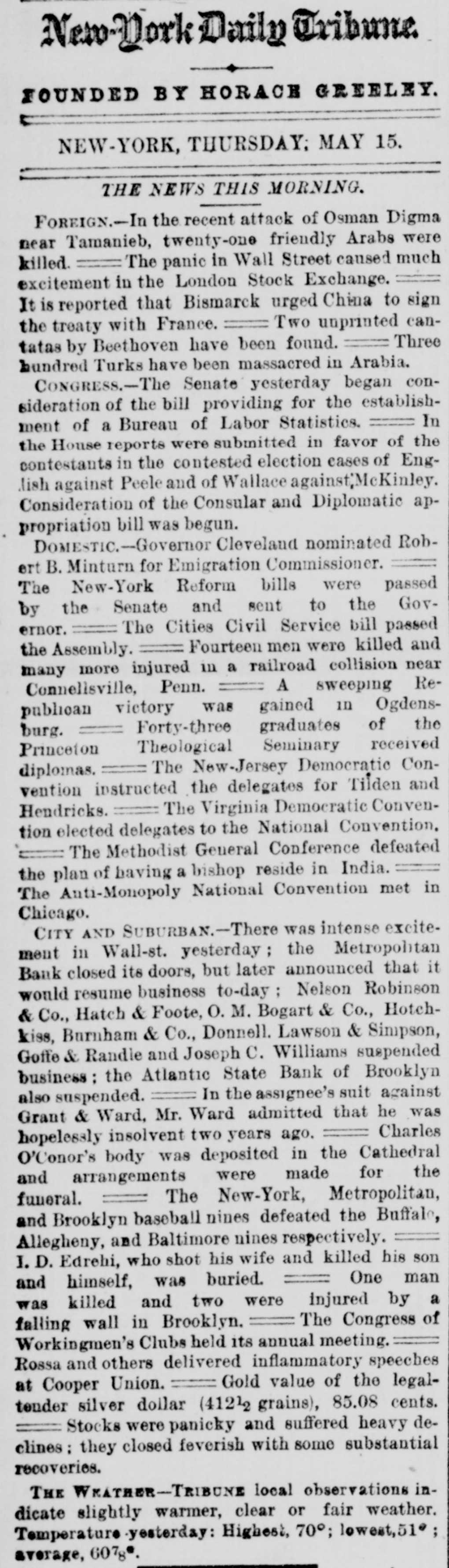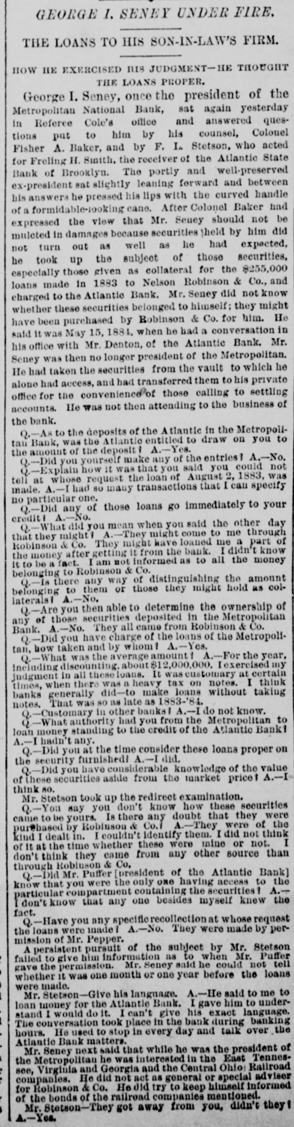 E THE GREAT CRASH GREAT SMASH OF BANKS IN NEW YORK-THE RESULTS OF FRAUDULENT PRACTICES. Wall street, New York, was a scene of panic and disaster on Wednesday. The failures were announced of the Metropolitan Bank, and the firms of Hatch & Foote, Nelson Robinson & Co., O. & Co., Goff & Co., J. C. M. Williams Bogart Donnell, & Burnham. Randall, Lawson & Simpson, and Hotchkiss & It said that the Metropolitan Bank will be able to pay its depositors, but that it is not likely to resuine. The bank's capital was $3,000,000, and its report to the clearing house last Saturday showed the following as its condition at the time : Loans, $10,977.000; specie, $1,779,000 legal tenders, $491, 000 deposits, $8,425,000 circulation, & $1,305,000. D. B. Hatch, of Hatch Foote, said it was impossible for him state whether their suspension was temporary or final. A meeting of the Clearing House Association was held, at which a reso lution was adopted for the appointment of a committee of five to receive from be banks, members of the Association, bills receivable or other securities to be appropriated by said committee, who shall be authorized to issue therefor to bank loan certificates interest at 6 per per such bearing depositors cent. cent. in excess of 75 per of in case securities, annum not except of United shall States bonds, and said certificates be received in settlement of balances at he Clearing House." had a quieding effect, and the in This stock action markets, became which had firmer been Folger, tone. greatly Secretary demoralized, who is in New telegraphed to Washington early in an order for York, the day call the for immediate bonds, payment of the 127th and Secretary made the sury the Acting announcement of the accord- Treaingly. Secretary Folger " expressed his determination to use all the power of the Government to prevent panic, and to act promptly to the utmost limit ey of his authority.' There was a run re the on the during day Second announce National et Bank, notwithstanding all st men' by Examiner Scriba that the ets bank was solvent. Lee It appears that John C. Eno, President of the Second National Bank, had rtbeen using its funds in Wall street speculations, to the amount,rumor said, nd of $2,000,000. Whatever the deficit, however, it was made good by his 08father, Amos R. Enos, a wealthy real estate owner. John C. Eno resigned an the Presidency of the Bank on Tuesday afternoon, and the Directors appointed to as his successor James A. Trowbridge, son of a former President. The Presiod dent of the Metropolitan Bank is Geo. I. Sauey, a well known philanthropist, his who within a few years has given to religious and charitable institutions ub $1,500,000. The Atlantic State Bank, of Brookleft lyn, closed its doors in the afternoon BOL in conseqnence of the failure of the Mecropolitan Bank, through which it 'BOD cleared. The Atlantic Bank expects to re-open to-day. Its capital 18 $200, ex 000. he banking house of T. L. Wat son & Co., of Bridgeport, Connecticut for suspended at 3 o'clock this afternoon owing. 1: said, inabilities - connecticut National Bank, in which they deposit, to honor thei Pen drafts, on account of the condition o atlairs in New York." Watson & Co oto leit expect to resume payment to-day. Telegrams from all other points ery North, West and South, received las No. night, show that no trouble has grown out of the Wall street panic. It wa rket reported last night that the deficit the in the Second National Bank of New York amounted to $4,000,000, and tha en if the President's father paid $3,500,000 iver the amount, the Directors giv n 624 $500,000. The bank paid out $500,00 codyesterday. Emile de Smet, a prominent lumbe for dealer of Moss Point, A.a., has failed food with liabilities estimated at $400,000. A New Orleans creditor holds a mortgage ness on De Smet's property for $150,000 on't whiele is believed to cover all available ture assets. -