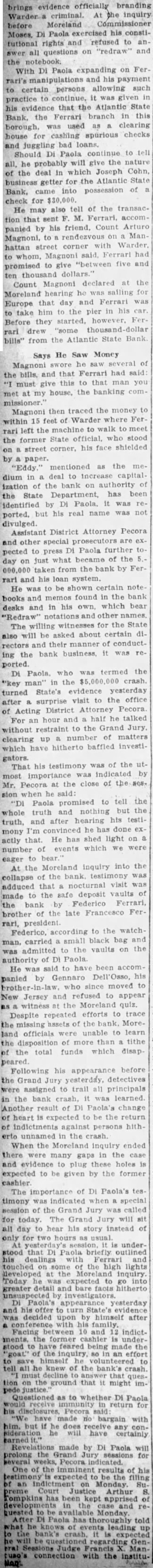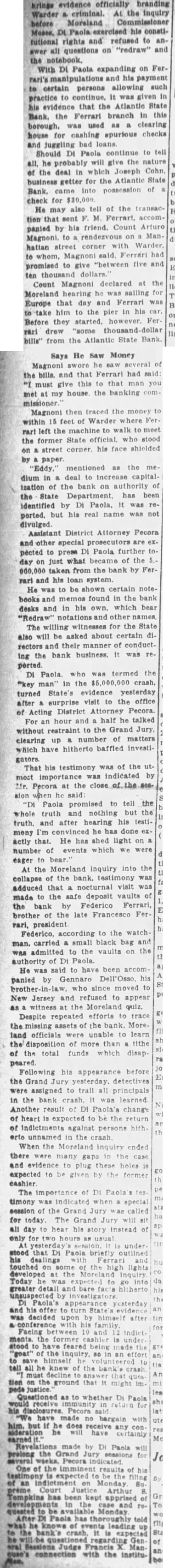 evidence officially branding brings criminal. At inquiry Moreland Commissioner before Moses. Di Paola exercised his constitutional rights and refused to on "redraw" and swer all questions With DI Paola expanding on Fer manipulations his payment certain persons allowing such practice continue, was given his that the Atlantic State Bank, the Ferrari branch in this borough, used clearing house for cashing spurious checks and juggling bad loans. Should Paola to all, he probably will give the nature the deal which Joseph Cohn. for Atlantic State business getter into possession of Bank, came check for He also tell of the transacmay that his Count Arturo panied by Magnoni, rendezvous on Manhattan street corner Magnoni Ferrari whom, "between five and promised to give thousand dollars. ten declared the Count Magnoni Moreland hearing salling for that day and Ferrari Europe the pier in his take Before rari "some the Atlantic State Bank from Says He Saw Money he Magnoni the bills, and that Ferrari had said this to that man must give at house, the banking my Magnoni then traced the money to within 15 feet of Warder where Ferrari the machine to walk meet the former State official, stood his face shielded street corner, paper. mentioned as the dium in deal to increase capital of the bank on authority of ization State Department, been identified by DI Paola. was but his real name divulged. District Attorney Pecora and other special pected to press Di Paola just what of the on 000,000 taken from the bank by Ferrari and loan system. be shown certain noteHe books memos found in the bank desks and his own which bear other names. The witnesses for the State will be about certain rectors and their of ing bank business, ported. termed the who man" crash. State's evidence yesterday turned after surprise visit office of Acting District Attorney Pecora. hour and half he talked For an without restraint the Grand Jury. of matters clearing up hitherto baffled investiwhich gators. testimony of the That his indicated by importance Mr. Pecora the close of when said: promised to tell the Paola whole and nothing but the truth, after testimony I'm he has done ex that. He has shed light actly number events which were eager Moreland inquiry the At the the bank testimony collapse adduced nocturnal visit the safe deposit vaults made Federico Ferrari, brother the Francesco Federico, the watch carried black bag the vaults on the authority Di Paola. He to Gennaro his panied since moved Jersey refused appear witness Moreland quiz. Despite repeated efforts trace missing the bank. More. officials unable learn the the total funds which Following his appearance before the Grand detectives were assigned to trail principals learned Another result of DI Paola's change heart is expected to the return unnamed the When the inquiry ended there were many gaps in and evidence to plug these holes expected to be given by the former The importance of DI Paola's tes timony was indicated when special session the Grand was called for today. The Grand Jury will sit all day to hear his story instead of understood that Di Paola briefly outlined dealings with Ferrari touched some the high lights developed inquiry. Today greater detail bare facts hitherto Paola's yesterday State's decided himself after Facing and ments, former cashier underfeared being made effort himself knew the bank's crash. the ground that might imQuestioned to whether Di Paola return for Pecora have bargain him. does have certainly made DI Paola the Grand sessions for Pecora the imminent results Monday Court Arthur Tompkins has been kept apprised and Monday told leading bank's Judge connection with the