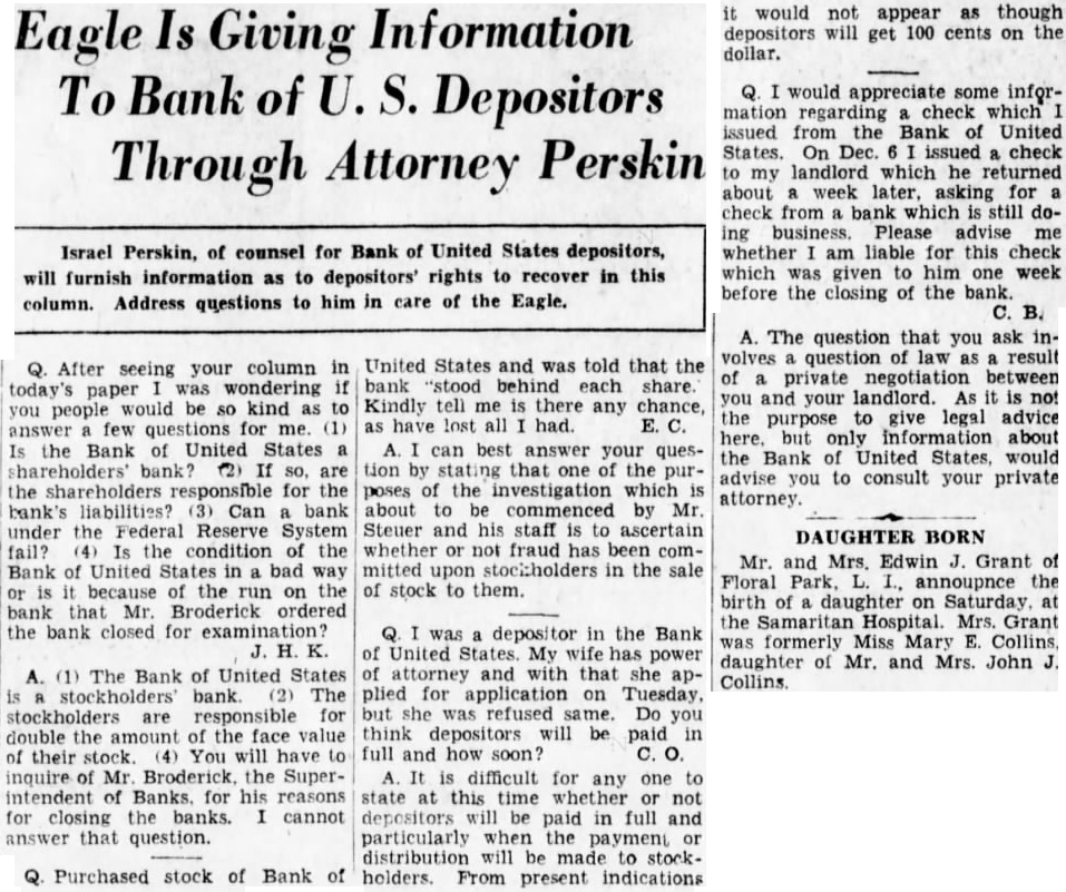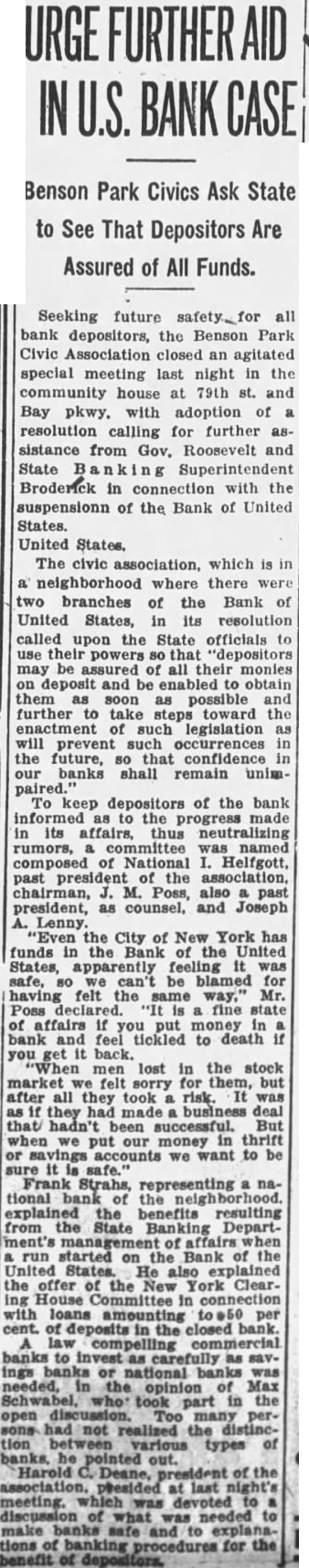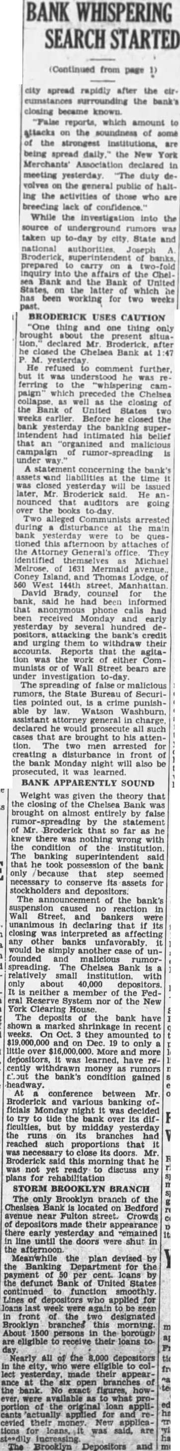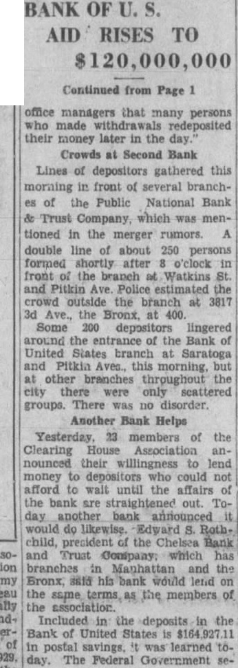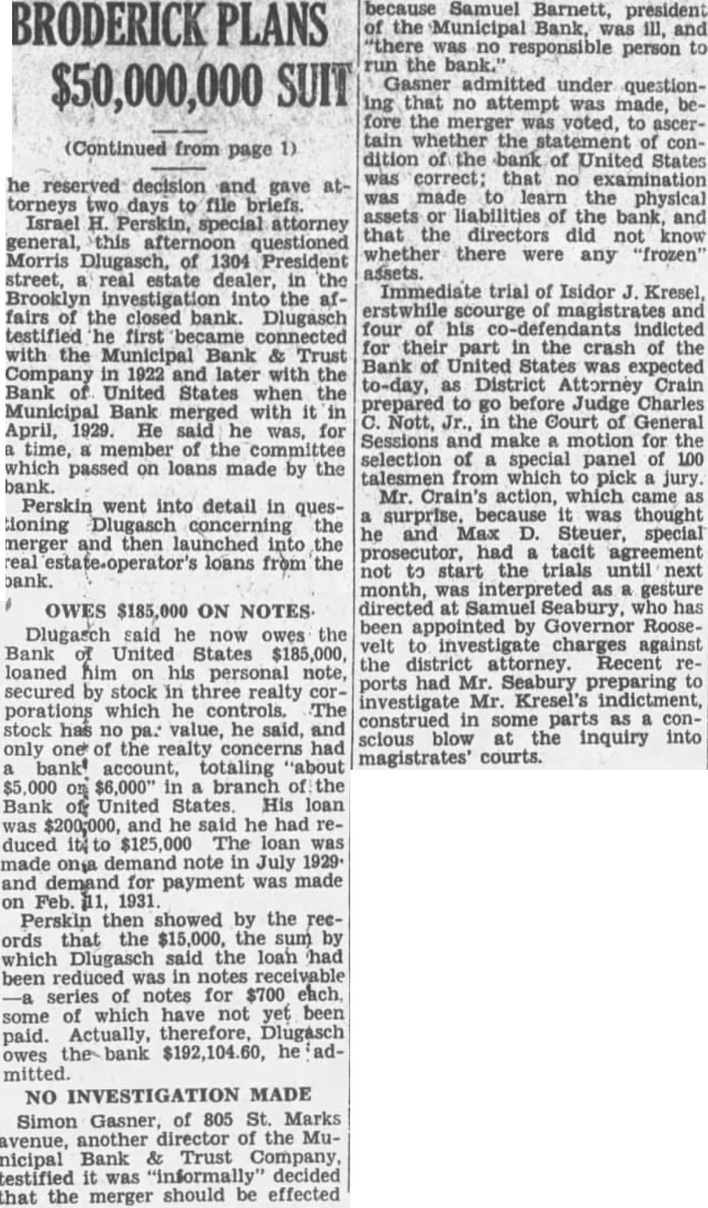 OWES $185,000 ON NOTES Dlugasch said he now owes the Bank United States $185,000, loaned him on his personal note, secured stock in three realty porations which he controls. The stock has value, he said, and only one the realty concerns bank account, totaling 'about branch Bank United States. His loan was $200,000, and he said he had reduced was made ona demand note in July 1929and demand for payment was made on Feb. 1931 Perskin then showed by the records that the $15,000, the sum which Dlugasch said the loan had been reduced was notes receivable series of notes for $700 each. some of which have not yet been paid. Actually, therefore, Dlugasch owes the bank $192,104.60, he mitted. NO INVESTIGATION MADE Simon Gasner, of 805 St. Marks avenue, another director of the Municipal Bank & Trust Company, testified was "informally" decided that the merger should be effected because Samuel Barnett, president of the Municipal Bank, was ill, and "there was no responsible person to run the bank." Gasner admitted under questioning that no attempt was made, before the was voted, to ascertain whether the condition of the bank of United States was correct; that no examination was made learn the physical assets or liabilities of the bank, and that the directors did not know whether there were any "frozen' assets. Immediate trial of Isidor J. Kresel, magistrates and four of his for their part in the crash of the Bank of United was expected to-day, as District Attorney Crain prepared to before Judge Charles Nott, the Court General Sessions and make motion for selection of special panel 100 talesmen from which to pick Mr. Crain's action, which came as surprise. because was thought and Max D. Steuer, special prosecutor, had tacit agreement not to start the trials until next month, was interpreted as gesture directed Samuel Seabury, has been appointed by Governor Roosevelt investigate charges against the attorney. Recent ports had Mr. Seabury preparing investigate Mr. Kresel's indictment, construed in some parts consclous blow the inquiry into magistrates' courts.