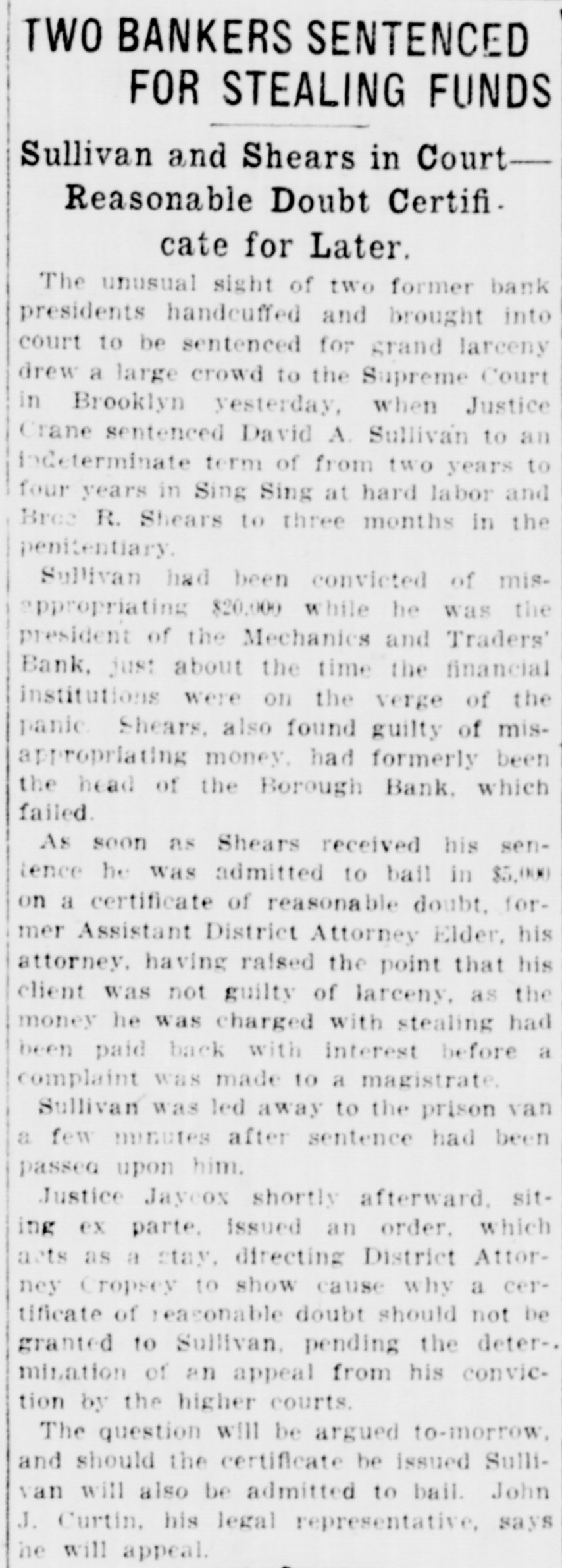"Might Ruin Us," Jones Said. "I protested at this. saying that it would mean trouble for us; in fact, might ruin us," said the witness. "They told me that these three banks must bring their balances up to $500,000, or I should stop clearing for them. So the Chelsea bank brought up its balance, but the Brooklyn banks did not. Then the Clearing House told me to stop clearing for the two Brooklyn banks. "I protested. and asked for a committee to look into my books. They sent a committee with accountants and stayed up all night examining the bank. When they finished they said my bank was in good condition and complimented me. But they told me to stop clearing for the Borough Bank and the Brooklyn Bank. I sent out the notices, and the two banks closed their doors. The publicity caused a run on my bank. "I had about $9,500,000 on deposit, and the run decreased this. I went to the Clearing House for a loan. I got altogether $2,800,000. That was in January, 1907. I was taken ill about this time, with pneumonia, having been unconscious for long periods, and when I got back Mr. Kelly had been elected president of the bank. I resigned. Shortly afterward the Clearing House sent out a notice calling in the loans of the Oriental, and the bank had to close." The witness said he understood that Mr. Kelly had been made president at the suggestion of the Clearing House committee. He produced the Kelly letter at this point. and Mr. Untermyer read it. Erskine Hewitt, formerly vice-president of the Oriental Bank. and Charles K. Beekman. a former director and counsel for the bank, testified in regard to several conferences they, together with Mr. Kelly,