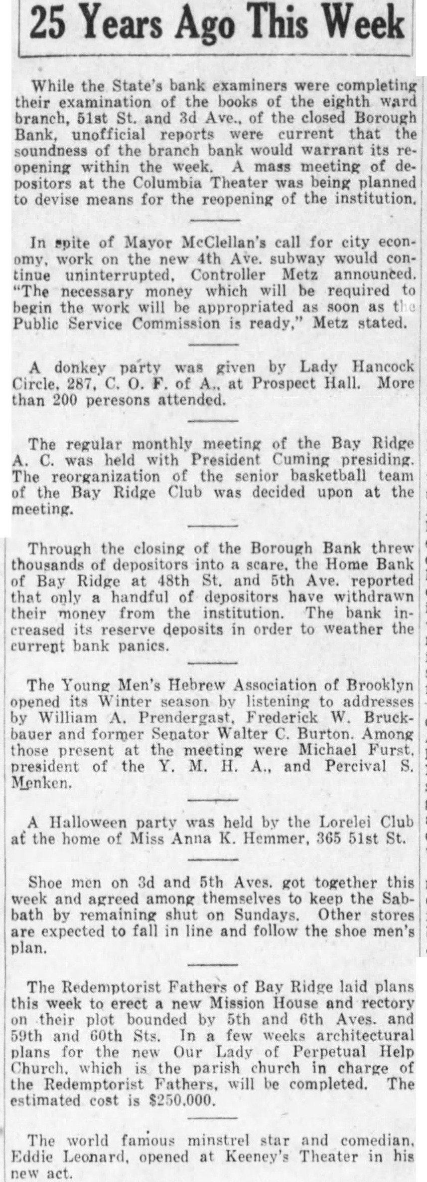 Years This Ago While the State's bank examiners were completing their books eighth ward branch, 51st and Ave., the closed Borough Bank, reports were current that the branch bank would warrant its opening within week. mass meeting of positors the Theater being planned means for the reopening of the institution. In spite of Mayor McClellan's call for city work on the Ave. subway would Controller announced. necessary which will be required begin work will appropriated Public Service Commission is Metz stated. donkey party was given by Lady Hancock of at Prospect Hall. More than 200 peresons attended. The regular monthly meeting of the Bay Ridge held with President Cuming the senior basketball team the Ridge Club was decided upon at the meeting. Through the closing of the Borough Bank threw Home Bank Bay Ridge 48th and 5th reported of depositors their from institution. bank creased deposits in order to weather current bank panics. The Young Men's Hebrew Association of Brooklyn opened season listening addresses Prendergast, Bruckbauer former Senator Burton. Among those present the meeting Michael president the M. A., and Percival Menken. Halloween party was held by the Lorelei Club the home Miss Anna K. Hemmer, 365 St. Shoe men on 3d and 5th Aves. got together this week agreed among themselves keep Sabbath by remaining shut Sundays. Other stores expected to fall line and follow the shoe men's plan. The Redemptorist Fathers of Bay Ridge laid plans this and rectory their bounded by 5th 6th 59th 60th Sts. architectural plans Lady Help which the parish charge the Redemptorist Fathers, will be completed. The estimated cost The world famous minstrel star and comedian. Eddie opened Keeney's Theater in act.