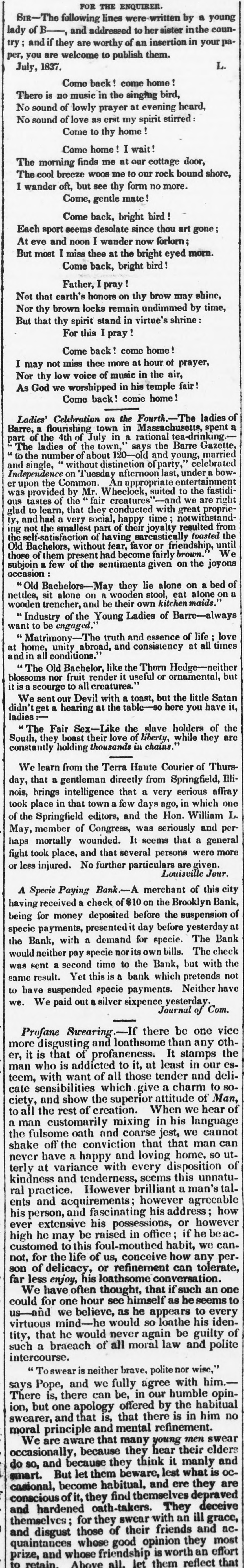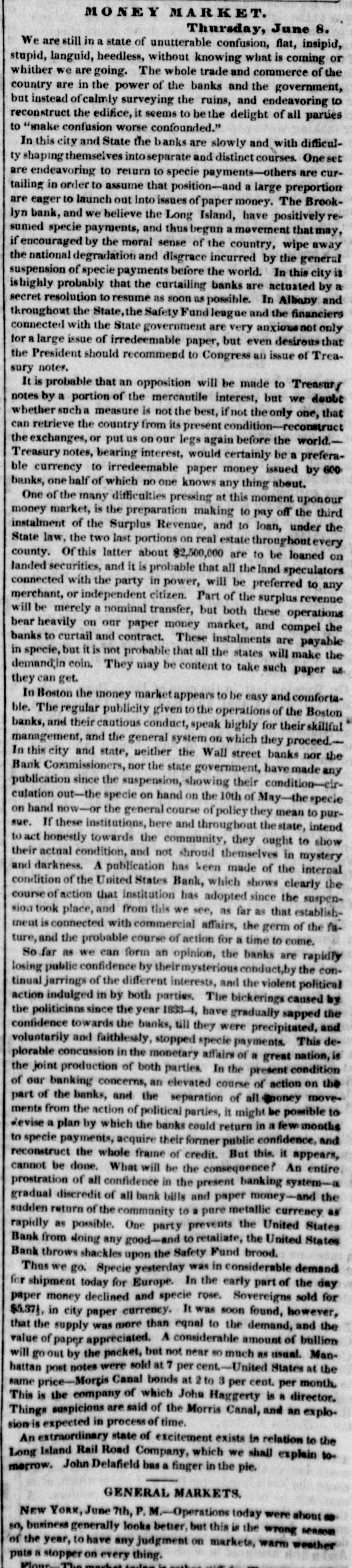 # MONEY MARKET. Thursday, June 8. We are still in a state of unutterable confusion, flat, insipid, stupid, languid, heedless, without knowing what is coming or whither we are going. The whole trade and commerce of the country are in the power of the banks and the government, but instead of calmly surveying the ruins, and endeavoring to reconstruct the edifice, it seems to be the delight of all parties to "make confusion worse confounded." In this city and State the banks are slowly and with difficulty shaping themselves into separate and distinct courses. One set are endeavoring to return to specie payments-others are curtailing in order to assume that position-and a large preportion are eager to launch out into issues of paper money. The Brooklyn bank, and we believe the Long Island, have positively resumed specie payments, and thus begun a movement that may, if encouraged by the moral sense of the country, wipe away the national degradation and disgrace incurred by the general suspension of specie payments before the world. In this city it is highly probably that the curtailing banks are actuated by a secret resolution to resume as soon as possible. In Albany and throughout the State, the Safety Fund league and the financiers connected with the State government are very anxious not only for a large issue of irredeemable paper, but even desirous that the President should recommend to Congress an issue of Treasury notes. It is probable that an opposition will be made to Treasury notes by a portion of the mercantile interest, but we doubt whether such a measure is not the best, if not the only one, that can retrieve the country from its present condition-reconstruct the exchanges, or put us on our legs again before the world. Treasury notes, bearing interest, would certainly be a prefera-ble currency to irredeemable paper money issued by 600 banks, one half of which no one knows any thing about. One of the many difficulties pressing at this moment upon our money market, is the preparation making to pay off the third instalment of the Surplus Revenue, and to loan, under the State law, the two last portions on real estate throughout every county. Of this latter about $2,500,000 are to be loaned on landed securities, and it is probable that all the land speculators connected with the party in power, will be preferred to any merchant, or independent citizen. Part of the surplus revenue will be merely a nominal transfer, but both these operations bear heavily on our paper money market, and compel the banks to curtail and contract. These instalments are payable in specie, but it is not probable that all the states will make the demand in coin. They may be content to take such paper as they can get. In Boston the money market appears to be easy and comfortable. The regular publicity given to the operations of the Boston banks, and their cautious conduct, speak highly for their skillful management, and the general system on which they proceed. In this city and state, neither the Wall street banks nor the Bank Commissioners, nor the state government, have made any publication since the suspension, showing their condition-circulation out-the specie on hand on the 10th of May-the specie on hand now-or the general course of policy they mean to pursue. If these institutions, here and throughout the state, intend to act honestly towards the community, they ought to show their actual condition, and not shroud themselves in mystery and darkness. A publication has keen made of the internal condition of the United States Bank, which shows clearly the course of action that institution has adopted since the suspension took place, and from this we see, as far as that establishment is connected with commercial affairs, the germ of the future, and the probable course of action for a time to come. So far as we can form an opinion, the banks are rapidly losing public confidence by their mysterious conduct, by the continual jarrings of the different interests, and the violent political action indulged in by both parties. The bickerings caused by the politicians since the year 1833-4, have gradually sapped the confidence towards the banks, till they were precipitated, and voluntarily and faithlessly, stopped specie payments. This deplorable concussion in the monetary affairs of a great nation, is the joint production of both parties. In the present condition of our banking concerns, an elevated course of action on the part of the banks, and the separation of all money move-ments from the action of political parties, it might be possible to devise a plan by which the banks could return in a few months to specie payments, acquire their former public confidence, and reconstruct the whole frame of credit. But this, it appears, cannot be done. What will be the consequence? An entire prostration of all confidence in the present banking system-a gradual discredit of all bank bills and paper money-and the sudden return of the community to a pure metallic currency, as rapidly as possible. One party prevents the United States Bank from doing any good and to retaliate, the United States Bank throws shackles upon the Safety Fund brood. Thus we go. Specie yesterday was in considerable demand for shipment today for Europe. In the early part of the day paper money declined and specie rose. Sovereigns sold for $5.371, in city paper currency. It was soon found, however, that the supply was more than equal to the demand, and the value of paper appreciated. A considerable amount of bullion will go out by the packet, but not near so much as usual. Manhattan post notes were sold at 7 per cent.-United States at the same price-Morgis Canal bonds at 2 to 3 per cent. per month. This is the company of which John Haggerty is a director. Things suspicious are said of the Morris Canal, and an explosion is expected in process of time. An extraordinary state of excitement exists in relation to the Long Island Rail Road Company, which we shall ex