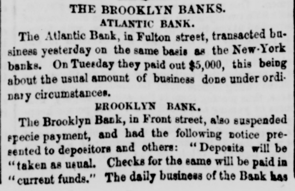 The Brooklyn Bank, in Front street, also suspended specie payment, and had the following notice presented to depositors and others: Deposits will be taken as usual. Checks for the same will be paid in current funds.