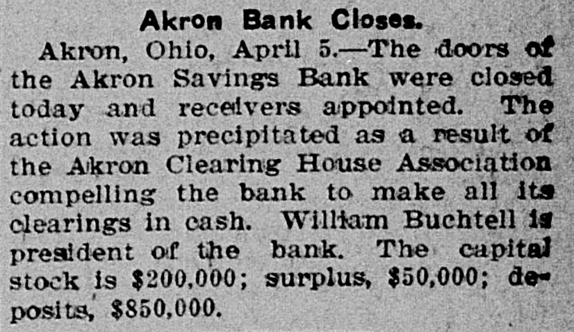 The doors of the Akron Savings Bank were closed today and receivers appointed... The action was precipitated as a result of the Akron Clearing House association compelling the bank to make all its clearings in cash.