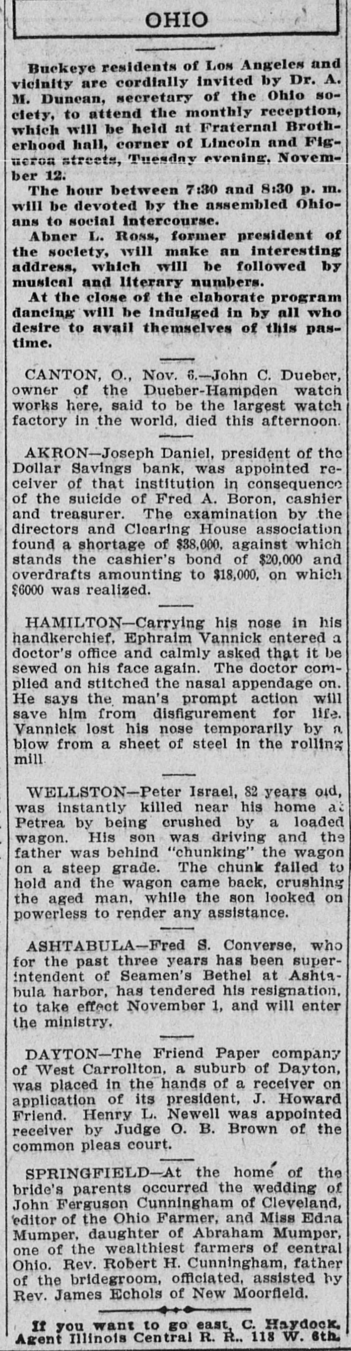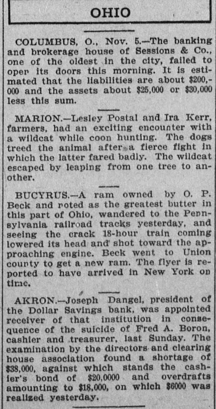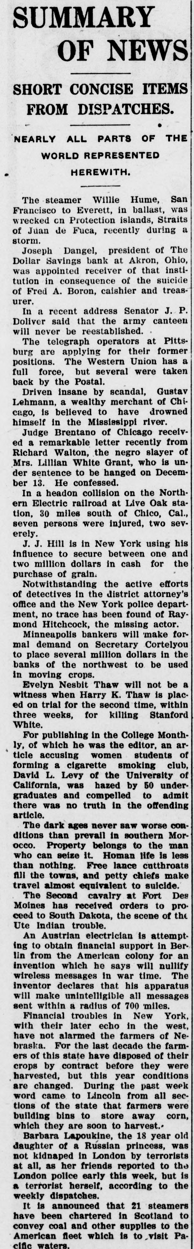 Largest Institution of the Kind in the City in Danger. NOTICE IS DEMANDED Depositors Allowed but Part of Their Cash Gold is Purchased in London. Chicago, Oct. 28.-Within an hour after the opening of the doors fully 400 people lined up at the withdrawal windows of the Illinois Trust & Savings bank, which has the largest number of savings accounts in the city. Depositors were allowed. if tney wished, to take out sums under $100, but for all amounts over, the full legal notice is required. The majority of those in the bank during the early part of the day gave notice of their intention to withdraw money. There was no excitement. Many Give Notice. In the Hibernian Savings bank about a hundred people had given notice of withdrawal by 11 o'clock and as many more were waiting in line. At the other savings banks business appeared to be on a normal basis. Depositors having checking accounts did not appear woried in the least by the situation, and business proceeded upon normal lines in all banks. Cortelyou Hears Good Reports. Washington, Oct. 28.-Secretary Corstated very telyou reassuring today reports he had from received New York, Chicago and other points, and that everywhere confidence was being restored and conditions much improved. Kansas City Bank Closes. Kansas City, Oct. 28.-The Bankers' Trust company, with deposits of $800,000, closed Hughes said they this had morning. decided to Cashier close temporarily because of clearing house certificates, Buying Bar Gold Abroad. London, Oct. 28.-The United States secured all the bar gold offered today in the market, totalling nearly $5,000.000. The price was $19.50. This is 2 1/2 cents higher than previous quotations, indicating the keenest of competition. Both Paris and London bid against the United States. Keep Money Out of Stock Market. New York, Oct. 28.-Any disposition to secure money obligations for the purpose of operating in the stock market was frowned upon and business kept at a low ebb. The delay in the appearance of supplies of money there caused no anxiety, as intimations were given loans would be carried over another day and money would be supplied when needed most. Prices continued to show an advance. Affects Grain Prices. Chicago, Oct. 28.-The financial condition in New York and the action of local banks in deciding to issue clearing house certificates and to demand full legal notice on the withdrawal of time deposits, caused a weak market 10 all the grain pits today. Wheat de clined 4 cents, corn 1 cent, and oats 11/6. Selling was in quite large vol time, but the demand slack. Buyers were extremely reluctant to take hold Duluth Board Suspends. Duluth, Oct. 28.-Trading in grain was suspended on the board of trade this morning owing to money condi tions. No sales were made in either cash grain or options, although the trading room was open and members were on the floor. Business will no be resumed until conditions improve Country elevators are being advised not to buy grain. Cashier Suicides. Akron, Ohio, Oct. 28.-The Dolla Savings bank was closed today by 01 der of the directors until after the fu neral of Fred A. Boron, cashier, who committed suicide yesterday. In th meantime an investigation of Boron' accounts is going on and a movemen is on foot to have the other banks C the city take this institution over. Th 60-day limit has been ordered enforce on all savings accounts in all banks.