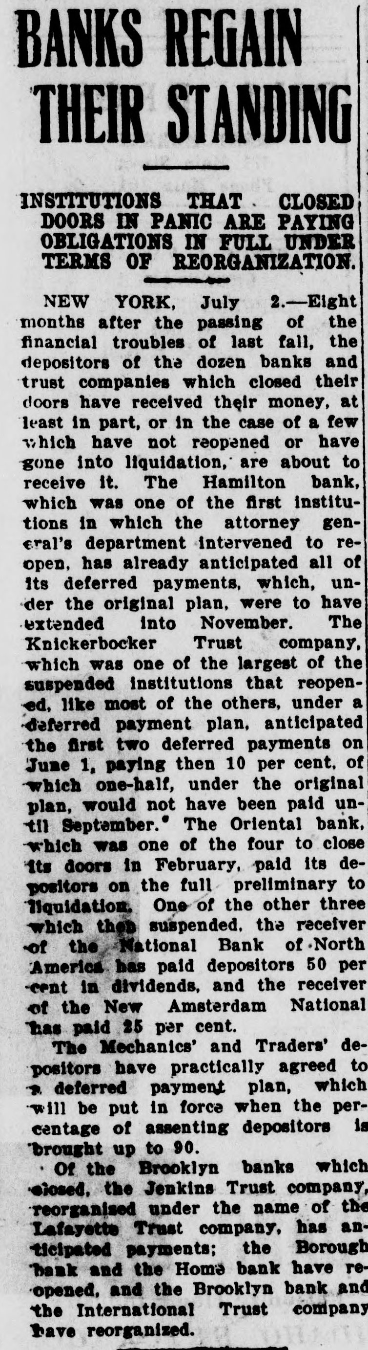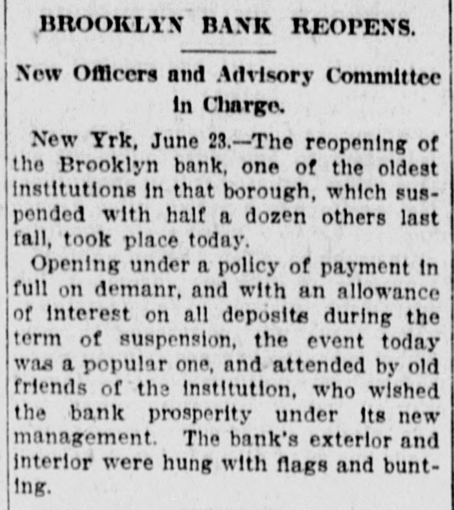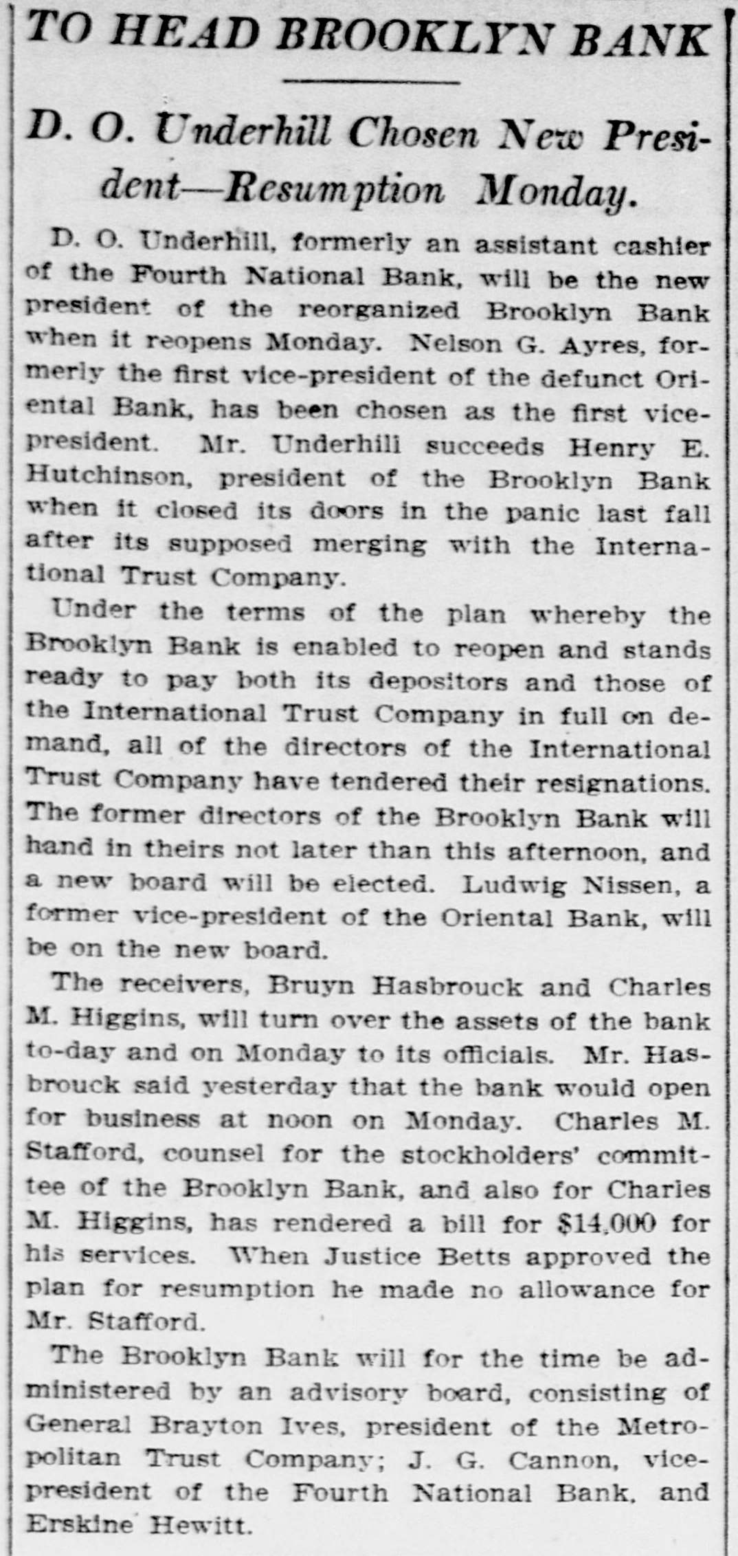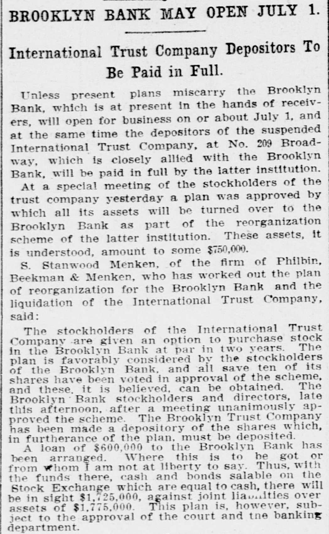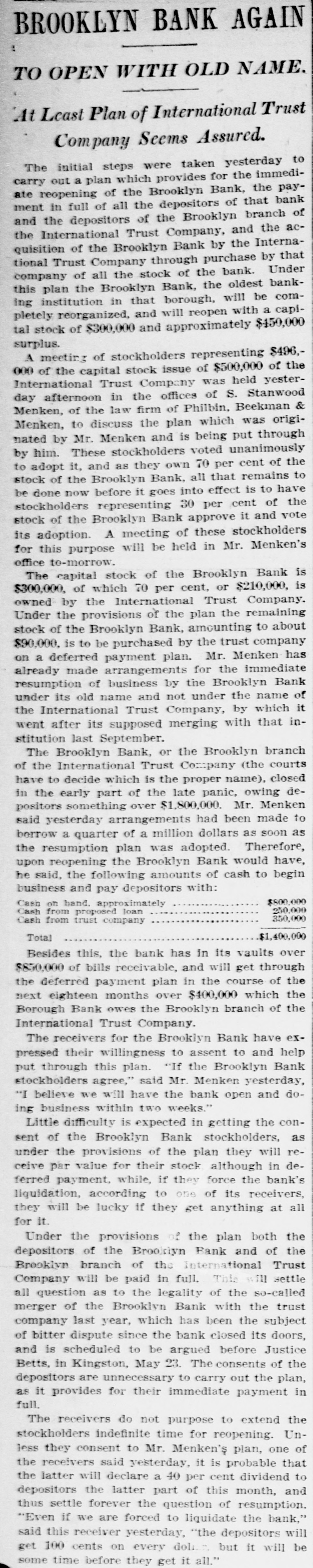 BROOKLYN BANK AGAIN : TO OPEN WITH OLD NAME. At Least Plan of International Trust Company Seems Assured. The initial steps were taken yesterday to carry out a plan which provides for the immediate reopening of the Brooklyn Bank, the payment in full of all the depositors of that bank and the depositors of the Brooklyn branch of the International Trust Company, and the acquisition of the Brooklyn Bank by the International Trust Company through purchase by that company of all the stock of the bank. Under this plan the Brooklyn Bank, the oldest banking institution in that borough, will be completely reorganized, and will reopen with a capital stock of $300,000 and approximately $450,000 surplus. A meeting of stockholders representing $496,000 of the capital stock issue of $500,000 of the International Trust Company was held yesterday afternoon in the offices of S. Stanwood Menken, of the law firm of Philbin. Beekman & Menken, to discuss the plan which was originated by Mr. Menken and is being put through by him. These stockholders voted unanimously to adopt it, and as they own 70 per cent of the stock of the Brooklyn Bank, all that remains to be done now before it goes into effect is to have stockholders representing 30 per cent of the stock of the Brooklyn Bank approve it and vote its adoption. A meeting of these stockholders for this purpose will be held in Mr. Menken's office to-morrow. The capital stock of the Brooklyn Bank is $300,000, of which 70 per cent. or $210,000, is owned by the International Trust Company. Under the provisions of the plan the remaining stock of the Brooklyn Bank, amounting to about $90,000. is to be purchased by the trust company on a deferred payment plan. Mr. Menken has already made arrangements for the immediate resumption of business by the Brooklyn Bank under its old name and not under the name of the International Trust Company, by which it went after its supposed merging with that institution last September. The Brooklyn Bank, or the Brooklyn branch of the International Trust Company (the courts have to decide which is the proper name), closed in the early part of the late panic, owing depositors something over $1,800,000. Mr. Menken said yesterday arrangements had been made to borrow a quarter of a million dollars as soon as the resumption plan was adopted. Therefore, upon reopening the Brooklyn Bank would have, he said, the following amounts of cash to begin business and pay depositors with: $800,000 Cash on hand. approximately 250.000 Cash from proposed loan 350,000 Cash from trust company $1,400,000 Total Besides this, the bank has in its vaults over $850,000 of bills receivable, and will get through the deferred payment plan in the course of the next eighteen months over $400,000 which the Borough Bank owes the Brooklyn branch of the International Trust Company The receivers for the Brooklyn Bank have expressed their willingness to assent to and help put through this plan. "If the Brooklyn Bank stockholders agree," said Mr. Menken yesterday, "I believe we will have the bank open and doing business within two weeks." Little difficulty is expected in getting the consent of the Brooklyn Bank stockholders, as under the provisions of the plan they will receive par value for their stock although in deferred payment, while, if they force the bank's liquidation, according to one of its receivers, they will be lucky if they get anything at all for it. Under the provisions of the plan both the depositors of the Brookiyn Bank and of the Brooklyn branch of the International Trust Company will be paid in full. This will settle all question as to the legality of the so-called merger of the Brooklyn Bank with the trust company last year, which has been the subject of bitter dispute since the bank closed its doors, and is scheduled to be argued before Justice Betts, in Kingston, May 23. The consents of the depositors are unnecessary to carry out the plan, as it provides for their immediate payment in full. The receivers do not purpose to extend the stockholders indefinite time for reopening. Unless they consent to Mr. Menken's plan, one of the receivers said yesterday, it is probable that the latter will declare a 40 per cent dividend to depositors the latter part of this month, and thus settle forever the question of resumption. "Even if we are forced to liquidate the bank," said this receiver yesterday, "the depositors will get 100 cents on every dols but it will be some time before they get it all."