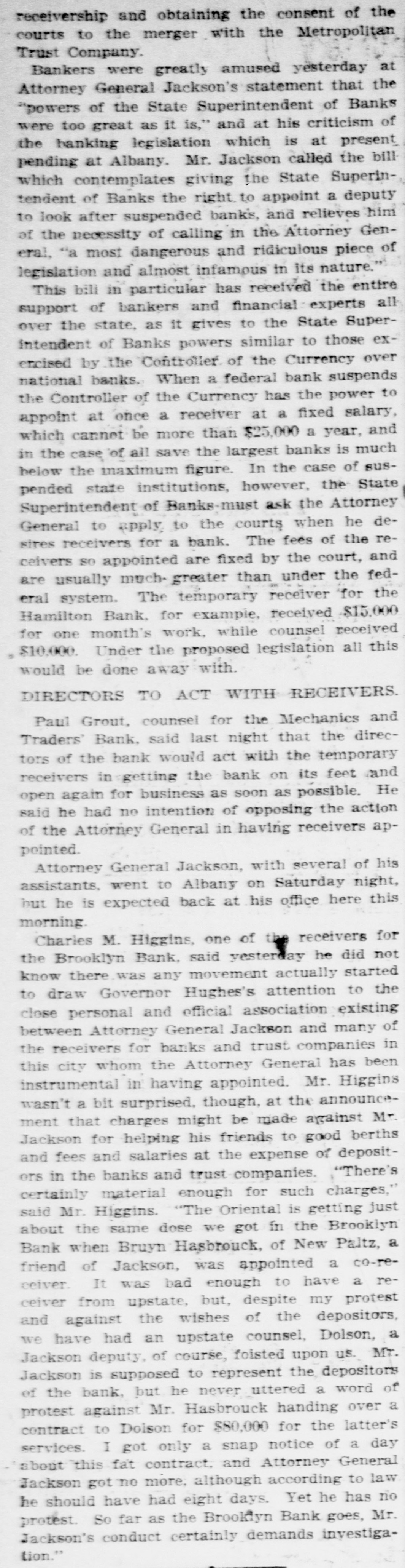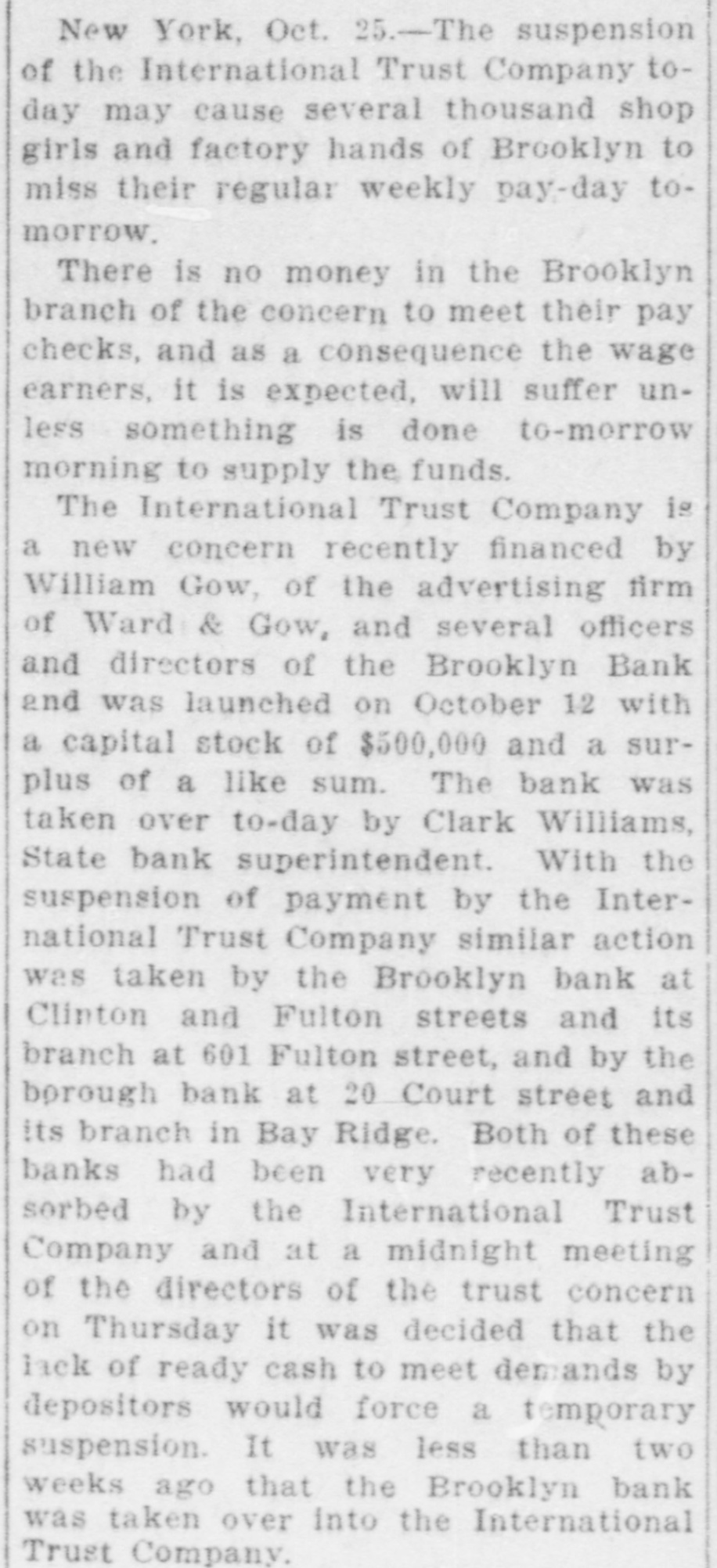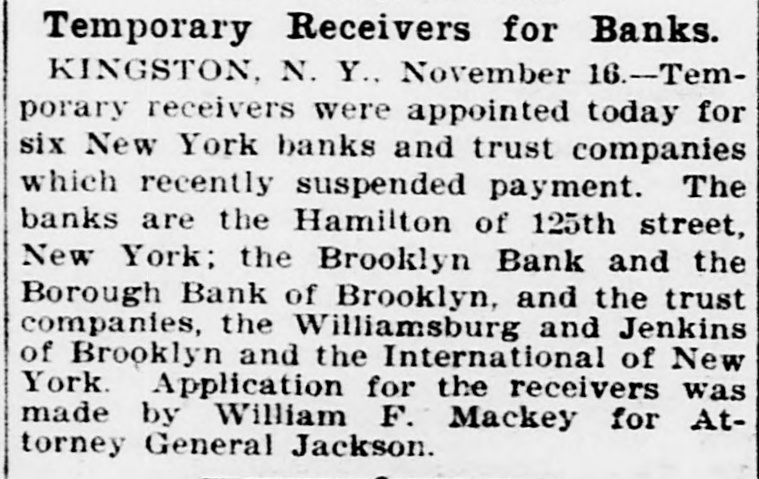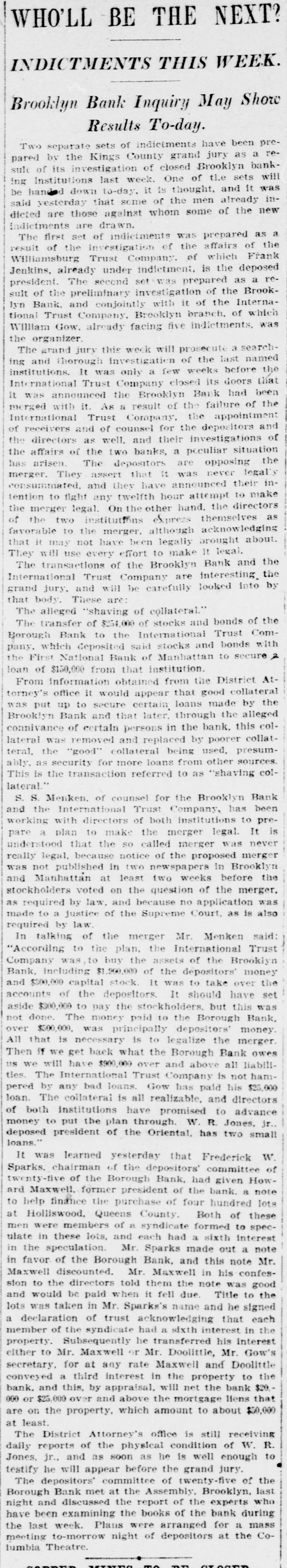 BROOKLYN BANK AGAIN : TO OPEN WITH OLD NAME. At Least Plan of International Trust Company Seems Assured. The initial steps were taken yesterday to carry out a plan which provides for the immediate reopening of the Brooklyn Bank, the payment in full of all the depositors of that bank and the depositors of the Brooklyn branch of the International Trust Company, and the acquisition of the Brooklyn Bank by the International Trust Company through purchase by that company of all the stock of the bank. Under this plan the Brooklyn Bank, the oldest banking institution in that borough, will be completely reorganized, and will reopen with a capital stock of $300,000 and approximately $450,000 surplus. A meeting of stockholders representing $496,000 of the capital stock issue of $500,000 of the International Trust Company was held yesterday afternoon in the offices of S. Stanwood Menken, of the law firm of Philbin. Beekman & Menken, to discuss the plan which was originated by Mr. Menken and is being put through by him. These stockholders voted unanimously to adopt it, and as they own 70 per cent of the stock of the Brooklyn Bank, all that remains to be done now before it goes into effect is to have stockholders representing 30 per cent of the stock of the Brooklyn Bank approve it and vote its adoption. A meeting of these stockholders for this purpose will be held in Mr. Menken's office to-morrow. The capital stock of the Brooklyn Bank is $300,000, of which 70 per cent. or $210,000, is owned by the International Trust Company. Under the provisions of the plan the remaining stock of the Brooklyn Bank, amounting to about $90,000. is to be purchased by the trust company on a deferred payment plan. Mr. Menken has already made arrangements for the immediate resumption of business by the Brooklyn Bank under its old name and not under the name of the International Trust Company, by which it went after its supposed merging with that institution last September. The Brooklyn Bank, or the Brooklyn branch of the International Trust Company (the courts have to decide which is the proper name), closed in the early part of the late panic, owing depositors something over $1,800,000. Mr. Menken said yesterday arrangements had been made to borrow a quarter of a million dollars as soon as the resumption plan was adopted. Therefore, upon reopening the Brooklyn Bank would have, he said, the following amounts of cash to begin business and pay depositors with: $800,000 Cash on hand. approximately 250.000 Cash from proposed loan 350,000 Cash from trust company $1,400,000 Total Besides this, the bank has in its vaults over $850,000 of bills receivable, and will get through the deferred payment plan in the course of the next eighteen months over $400,000 which the Borough Bank owes the Brooklyn branch of the International Trust Company The receivers for the Brooklyn Bank have expressed their willingness to assent to and help put through this plan. "If the Brooklyn Bank stockholders agree," said Mr. Menken yesterday, "I believe we will have the bank open and doing business within two weeks." Little difficulty is expected in getting the consent of the Brooklyn Bank stockholders, as under the provisions of the plan they will receive par value for their stock although in deferred payment, while, if they force the bank's liquidation, according to one of its receivers, they will be lucky if they get anything at all for it. Under the provisions of the plan both the depositors of the Brookiyn Bank and of the Brooklyn branch of the International Trust Company will be paid in full. This will settle all question as to the legality of the so-called merger of the Brooklyn Bank with the trust company last year, which has been the subject of bitter dispute since the bank closed its doors, and is scheduled to be argued before Justice Betts, in Kingston, May 23. The consents of the depositors are unnecessary to carry out the plan, as it provides for their immediate payment in full. The receivers do not purpose to extend the stockholders indefinite time for reopening. Unless they consent to Mr. Menken's plan, one of the receivers said yesterday, it is probable that the latter will declare a 40 per cent dividend to depositors the latter part of this month, and thus settle forever the question of resumption. "Even if we are forced to liquidate the bank," said this receiver yesterday, "the depositors will get 100 cents on every dols but it will be some time before they get it all."