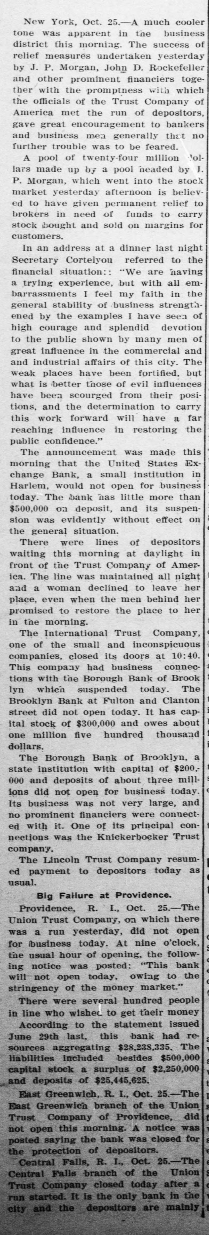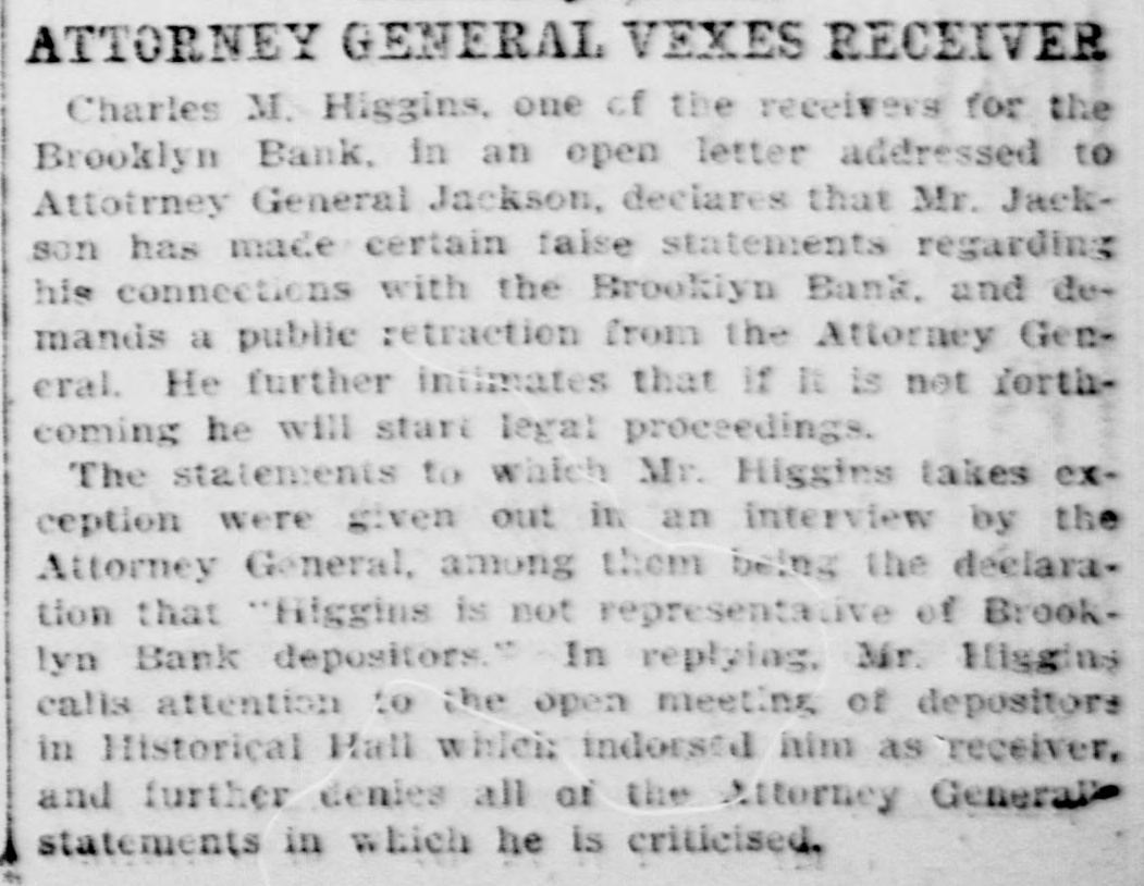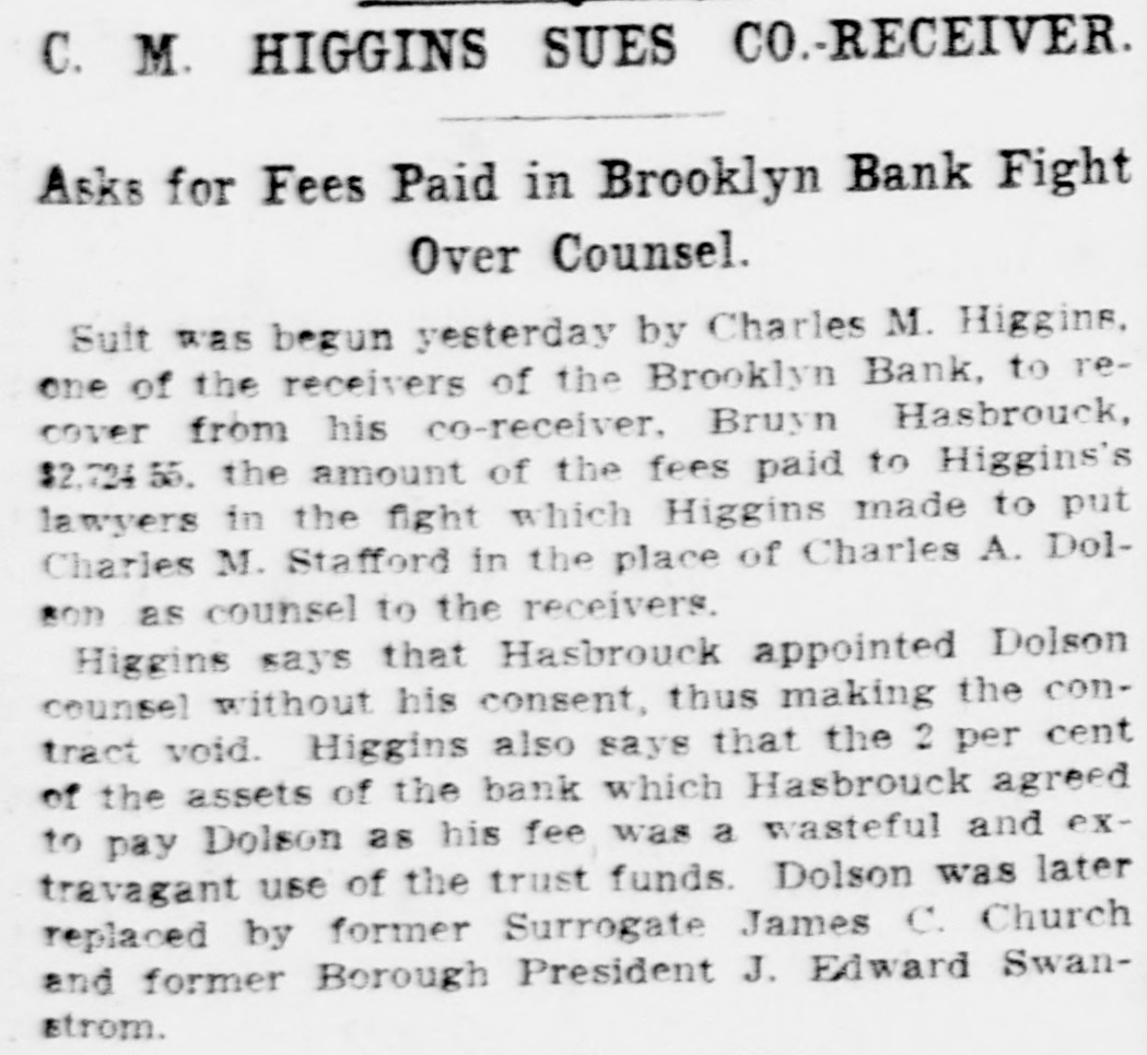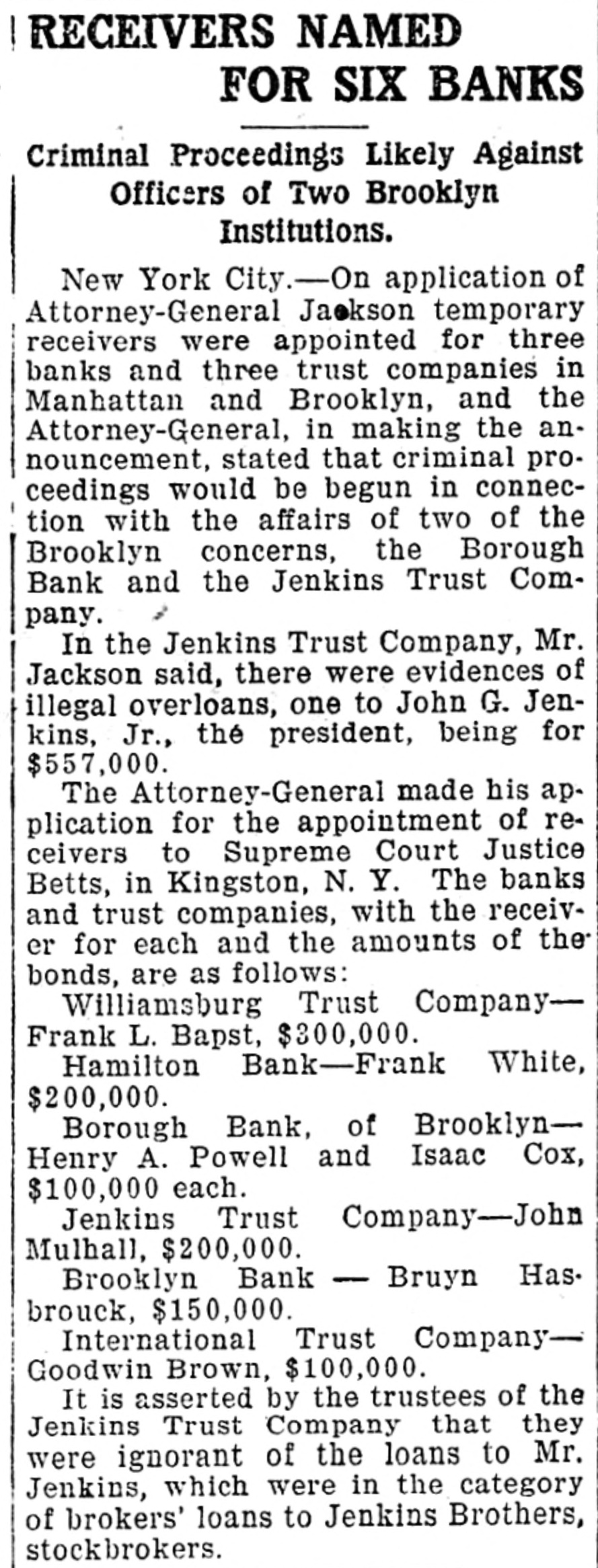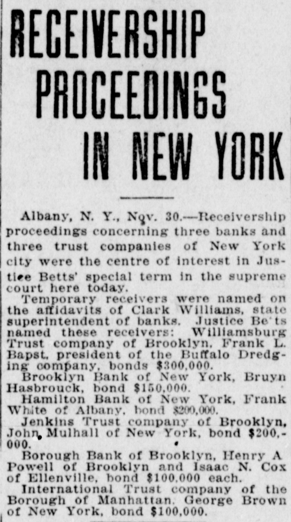BROOKLYN BANK AGAIN : TO OPEN WITH OLD NAME. At Least Plan of International Trust Company Seems Assured. The initial steps were taken yesterday to carry out a plan which provides for the immediate reopening of the Brooklyn Bank, the payment in full of all the depositors of that bank and the depositors of the Brooklyn branch of the International Trust Company, and the acquisition of the Brooklyn Bank by the International Trust Company through purchase by that company of all the stock of the bank. Under this plan the Brooklyn Bank, the oldest banking institution in that borough, will be completely reorganized, and will reopen with a capital stock of $300,000 and approximately $450,000 surplus. A meeting of stockholders representing $496,000 of the capital stock issue of $500,000 of the International Trust Company was held yesterday afternoon in the offices of S. Stanwood Menken, of the law firm of Philbin. Beekman & Menken, to discuss the plan which was originated by Mr. Menken and is being put through by him. These stockholders voted unanimously to adopt it, and as they own 70 per cent of the stock of the Brooklyn Bank, all that remains to be done now before it goes into effect is to have stockholders representing 30 per cent of the stock of the Brooklyn Bank approve it and vote its adoption. A meeting of these stockholders for this purpose will be held in Mr. Menken's office to-morrow. The capital stock of the Brooklyn Bank is $300,000, of which 70 per cent. or $210,000, is owned by the International Trust Company. Under the provisions of the plan the remaining stock of the Brooklyn Bank, amounting to about $90,000. is to be purchased by the trust company on a deferred payment plan. Mr. Menken has already made arrangements for the immediate resumption of business by the Brooklyn Bank under its old name and not under the name of the International Trust Company, by which it went after its supposed merging with that institution last September. The Brooklyn Bank, or the Brooklyn branch of the International Trust Company (the courts have to decide which is the proper name), closed in the early part of the late panic, owing depositors something over $1,800,000. Mr. Menken said yesterday arrangements had been made to borrow a quarter of a million dollars as soon as the resumption plan was adopted. Therefore, upon reopening the Brooklyn Bank would have, he said, the following amounts of cash to begin business and pay depositors with: $800,000 Cash on hand. approximately 250.000 Cash from proposed loan 350,000 Cash from trust company $1,400,000 Total Besides this, the bank has in its vaults over $850,000 of bills receivable, and will get through the deferred payment plan in the course of the next eighteen months over $400,000 which the Borough Bank owes the Brooklyn branch of the International Trust Company The receivers for the Brooklyn Bank have expressed their willingness to assent to and help put through this plan. "If the Brooklyn Bank stockholders agree," said Mr. Menken yesterday, "I believe we will have the bank open and doing business within two weeks." Little difficulty is expected in getting the consent of the Brooklyn Bank stockholders, as under the provisions of the plan they will receive par value for their stock although in deferred payment, while, if they force the bank's liquidation, according to one of its receivers, they will be lucky if they get anything at all for it. Under the provisions of the plan both the depositors of the Brookiyn Bank and of the Brooklyn branch of the International Trust Company will be paid in full. This will settle all question as to the legality of the so-called merger of the Brooklyn Bank with the trust company last year, which has been the subject of bitter dispute since the bank closed its doors, and is scheduled to be argued before Justice Betts, in Kingston, May 23. The consents of the depositors are unnecessary to carry out the plan, as it provides for their immediate payment in full. The receivers do not purpose to extend the stockholders indefinite time for reopening. Unless they consent to Mr. Menken's plan, one of the receivers said yesterday, it is probable that the latter will declare a 40 per cent dividend to depositors the latter part of this month, and thus settle forever the question of resumption. "Even if we are forced to liquidate the bank," said this receiver yesterday, "the depositors will get 100 cents on every dols but it will be some time before they get it all."