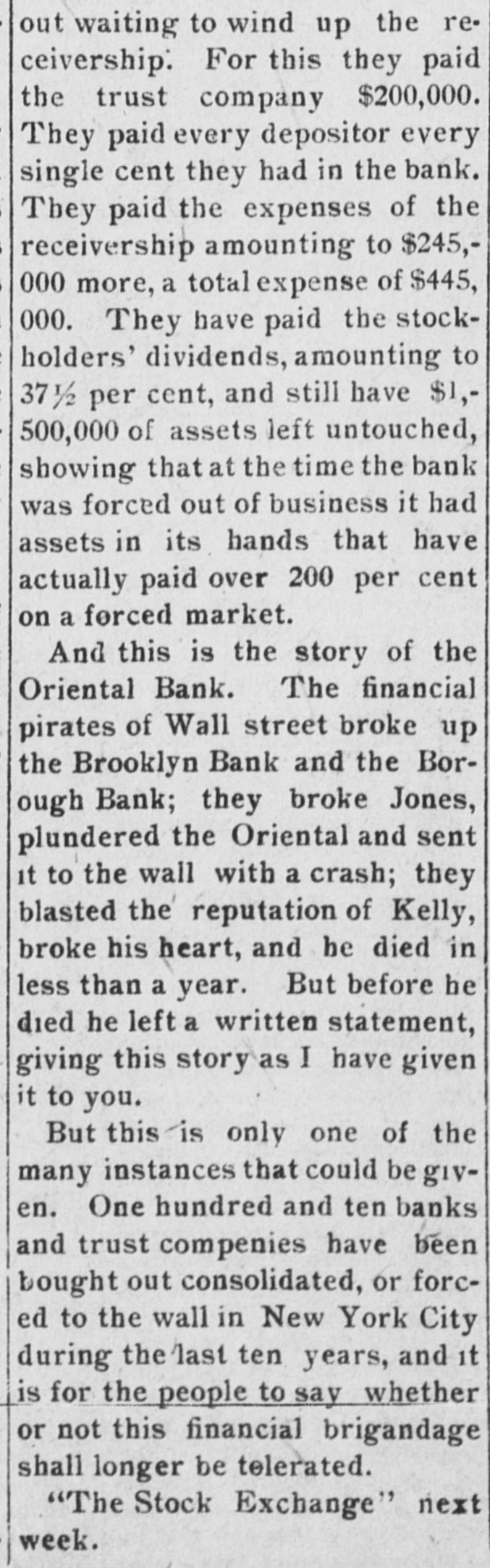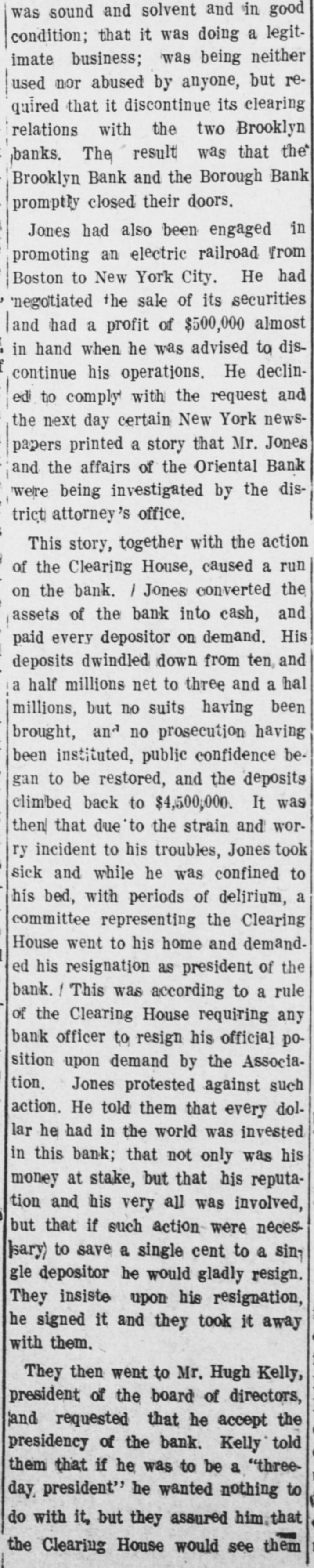 "Might Ruin Us," Jones Said. "I protested at this. saying that it would mean trouble for us; in fact, might ruin us," said the witness. "They told me that these three banks must bring their balances up to $500,000, or I should stop clearing for them. So the Chelsea bank brought up its balance, but the Brooklyn banks did not. Then the Clearing House told me to stop clearing for the two Brooklyn banks. "I protested. and asked for a committee to look into my books. They sent a committee with accountants and stayed up all night examining the bank. When they finished they said my bank was in good condition and complimented me. But they told me to stop clearing for the Borough Bank and the Brooklyn Bank. I sent out the notices, and the two banks closed their doors. The publicity caused a run on my bank. "I had about $9,500,000 on deposit, and the run decreased this. I went to the Clearing House for a loan. I got altogether $2,800,000. That was in January, 1907. I was taken ill about this time, with pneumonia, having been unconscious for long periods, and when I got back Mr. Kelly had been elected president of the bank. I resigned. Shortly afterward the Clearing House sent out a notice calling in the loans of the Oriental, and the bank had to close." The witness said he understood that Mr. Kelly had been made president at the suggestion of the Clearing House committee. He produced the Kelly letter at this point. and Mr. Untermyer read it. Erskine Hewitt, formerly vice-president of the Oriental Bank. and Charles K. Beekman. a former director and counsel for the bank, testified in regard to several conferences they, together with Mr. Kelly,