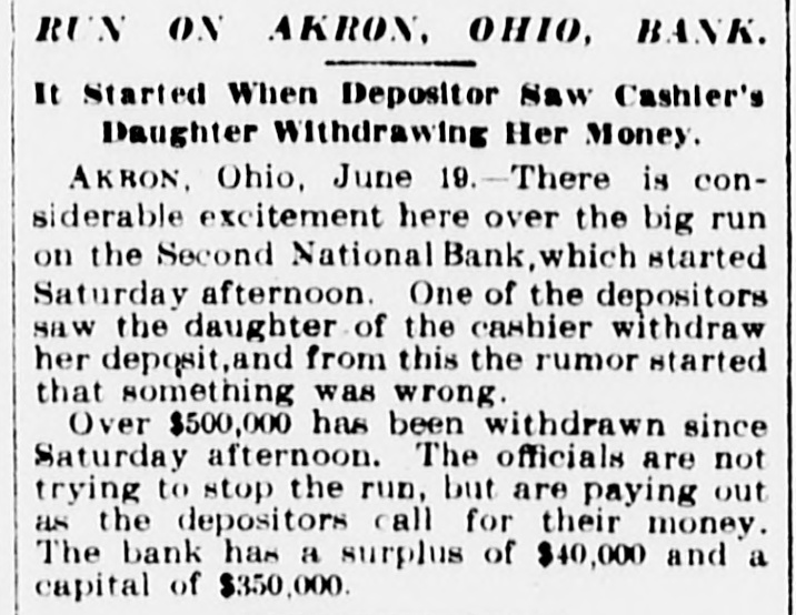 NATIONAL BANK IS INSOLVENT Comptroller of the Currency Closes a Financial Institution in Fredonia, N. Y. FIRM FAILS CHICAGO Error of Judgment in the Corn Pit Results in Applia Receiver for cation WASHINGTON, June 9.-The Fredonia National Bank of Fredonia, N. Y., was closed to-day by order of the Comptroller of the Currency on information received from the examiner that it is insolvent. J. W. Schofield has been appointed receiver. FREDONIA, June 19.-Ralph H. Hall, president of the Fredonia National Bank, met with the directors and cashier in the bank to-night. At the close of the meeting the following statement was given out: "Three months ago an unwarranted rumor got abroad that there was bad paper in the bank. This started heavy withdrawal of deposits, and $250,000 was taken out in the last three months. The bank was unable to realize on its securities immediately, so failure was inevitable." NEW YORK, June 19.-The directors of the suspended Merchants' Trust Company to-day voted to accept the offer of $850,000 made by a syndicate for the Hudson Valley Railway Company stock which is held by the trust company. An official statement, which was given out after to-day's meeting, says that it now remains only for the consent of the court to permit the sale to be made. It adds that in event of the sale being completed the $850,000 thus obtained, added to $300,000 in cash on hand, $500,000 in New York City bonds held by the company and $300,000 promised by certain of the officials to be advanced for the purpose, will enable the creditors to be paid off immediately. CHICAGO, June 19.-Fyfe, Manson & Co., a grain commission firm prominent on the Chicago Board of Trade, went into the hands of a receiver to-day. The application was made voluntarily by the firm, which is said to be involved to the extent of between $70,000 and $80,000. The failure is attributed to the fact that the firm has recently favored the "bear" side of the corn market. Quotations for corn have shown an upward tendency since the "bull" deal in corn for May delivery was successfully completed. AKRON, Ohio, June 19.-There is much excitement here over the continued big "run" to-day on the Second National Bank. One of the depositors saw the daughter of one of the officials of the bank withdraw her deposit and from this the rumor started that something was wrong. Five hundred thousand dollars has been withdrawn since Saturday afternoon. The officials are not trying to stop the "run," but are paying out as the depositors call for their money. The bank has a surplus of $40,000 and a capital of $350,000.