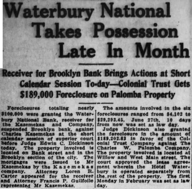 Foreclosures totaling nearly $100,000 were granted the WaterNational Bank, receiver for Company, against Charles Kasemekas at short court before Judge Edwin Dickinson today. The property involved located on Bank and in the Brooklyn section the city. mortgages were issued to Kazemekas by the company. Attorney Loren Carter appeared for the receiver Attorney Francis represented Mr Kazemekas