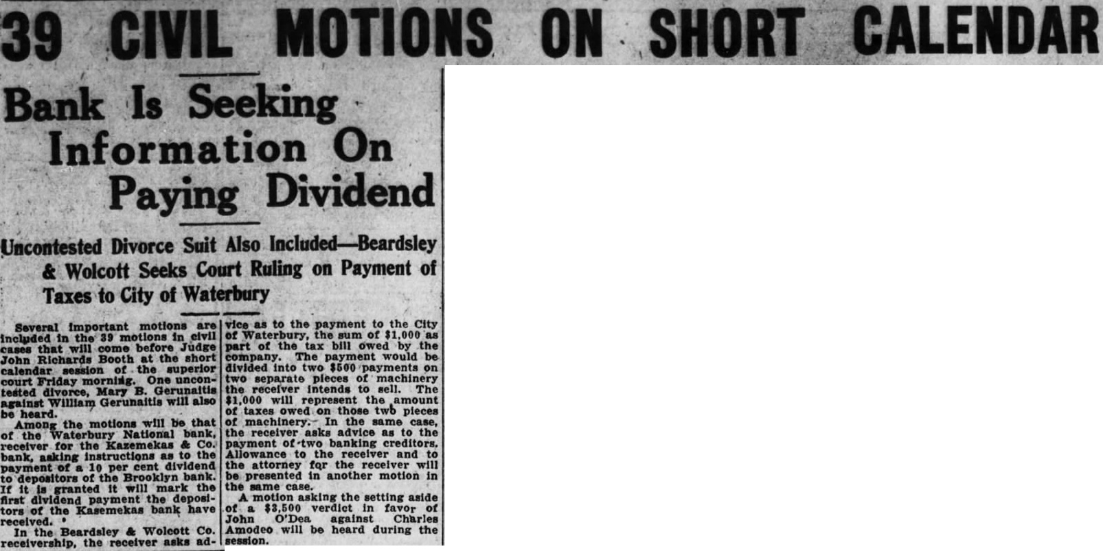 Several motions are the motions in civil included in cases that will come before Judge John Richards Booth at the short calendar of the superior court Friday One uncontested divorce, Mary Gerunaitis against William Gerunaitis will also be heard. Among the motions will be that of the National bank, for the Kazemekas bank, instructions as to payment 10 per cent dividend depositors the Brooklyn bank. it granted It will mark the first payment the the Kasemekas bank have received. In the Beardsley & Wolcott Co. receivership, the receiver asks vice as to the payment to the City of sum of part of the bill owed by the company The payment would divided into two $500 separate pieces of machinery receiver intends to sell. will represent the amount taxes on those twb pieces machinery. the case, the receiver asks advice as the payment of banking Allowance to the receiver and the attorney for the receiver will be presented in another motion in the same case. the setting aside $3,500 favor John O'Dea against Charles Amodeo will be heard during the session.
