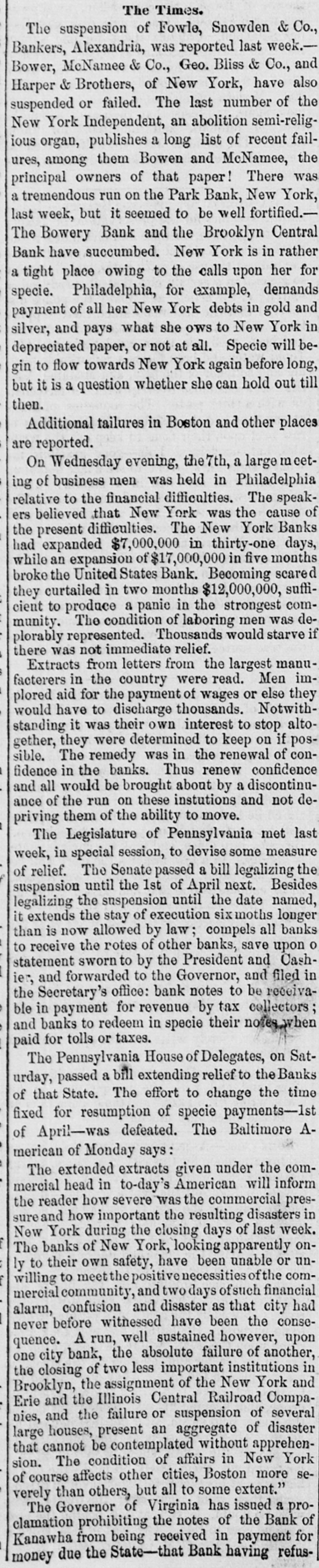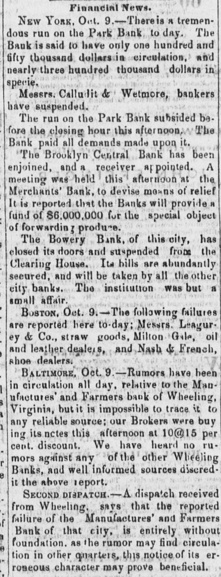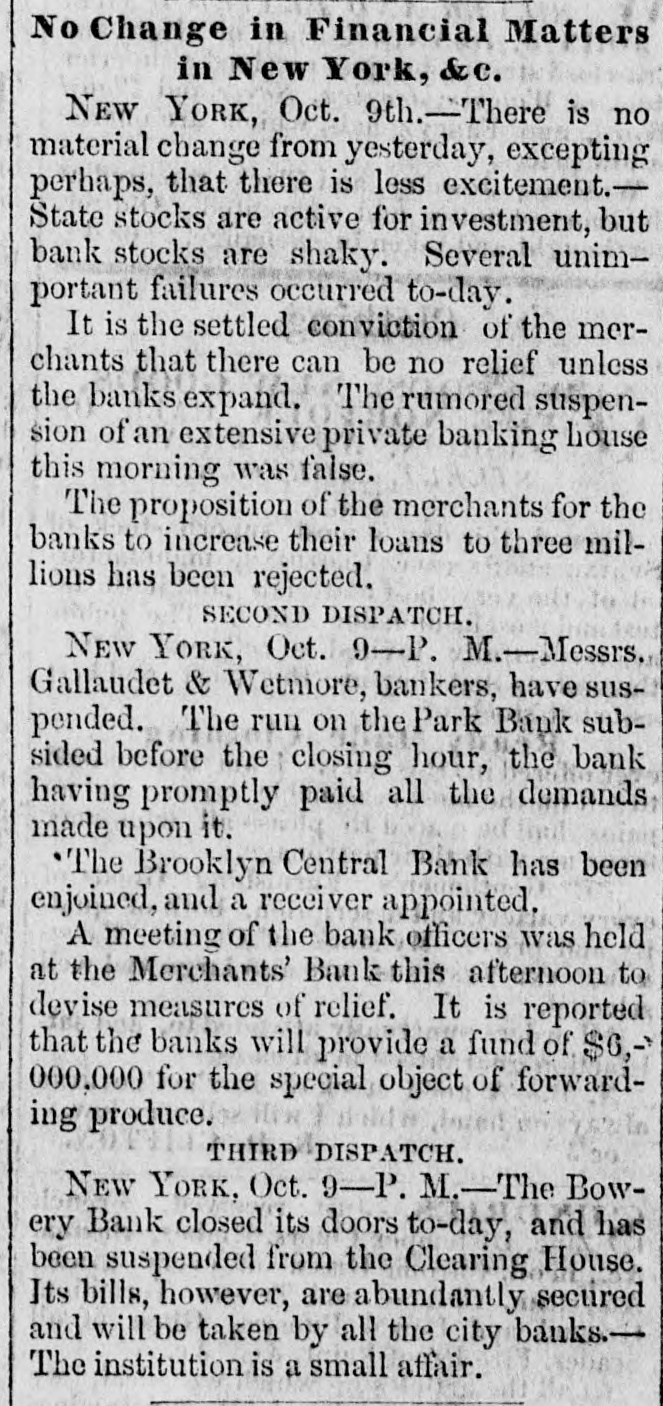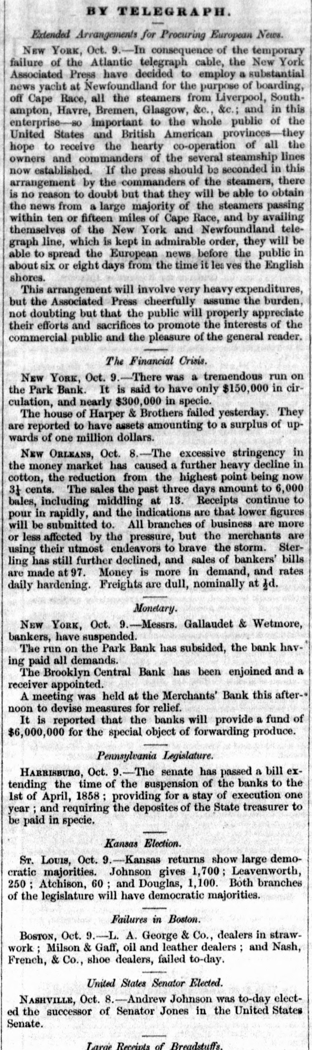 BY TELEGRAPH. Extended Arrangements for Procuring European News. New YORK, Oct. 9.-In consequence of the temporary failure of the Atlantic telegraph cable, the New York Associated Press have decided to employ a substantial news yacht at Newfoundland for the purpose of boarding, off Cape Race, all the steamers from Liverpool, Southampton, Havre, Bremen, Glasgow, &c., &c.; and in this enterprise-so important to the whole public of the United States and British American provinces-they hope to receive the hearty co-operation of all the owners and commanders of the several steamship lines now established. If the press should be seconded in this arrangement by the commanders of the steamers, there is no reason to doubt but that they will be able to obtain the news from a large majority of the steamers passing within ten or fifteen miles of Cape Race, and by availing themselves of the New York and Newfoundland telegraph line, which is kept in admirable order, they will be able to spread the European news before the public in about six or eight days from the time it les ves the English shores. This arrangement will involve very heavy expenditures, but the Associated Press cheerfully assume the burden, not doubting but that the public will properly appreciate their efforts and sacrifices to promote the interests of the commercial public and the pleasure of the general reader. The Financial Crisis. NEW YORK, Oct. 9.-There was a tremendous run on the Park Bank. It is said to have only $150,000 in circulation, and nearly $300,000 in specie. The house of Harper & Brothers failed yesterday. They are reported to have assets amounting to a surplus of upwards of one million dollars. NEW ORLEANS, Oct. 8.-The excessive stringency in the money market has caused a further heavy decline in cotton, the reduction from the highest point being now 3t cents. The sales the past three days amount to 6,000 bales, including middling at 13. Receipts continue to pour in rapidly, and the indications are that lower figures will be submitted to. All branches of business are more or less affected by the pressure, but the merchants are using their utmost endeavors to brave the storm. Sterling has still further declined, and sales of bankers' bills are made at 97. Money is more in demand, and rates daily hardening. Freights are dull, nominally at âĞd. Monetary. New YORK, Oct. 9.-Messrs. Gallaudet & Wetmore, bankers, have suspended. The run on the Park Bank has subsided, the bank having paid all demands. The Brooklyn Central Bank has been enjoined and a receiver appointed. A meeting was held at the Merchants' Bank this afternoon to devise measures for relief. It is reported that the banks will provide a fund of $6,000,000 for the special object of forwarding produce. Pennsylvania Legislature. HARRISBURG, Oct. 9.-The senate has passed a bill extending the time of the suspension of the banks to the 1st of April, 1858 providing for a stay of execution one year ; and requiring the deposites of the State treasurer to be paid in specie. Kansas Election. Sr. LOUIS, Oct. 9.-Kansas returns show large democratic majorities. Johnson gives 1,700; Leavenworth, 250 Atchison, 60 ; and Douglas, 1,100. Both branches of the legislature will have democratic majorities. Failures in Boston. BOSTON, Oct. 9.-L. A. George & Co., dealers in strawwork Milson & Gaff, oil and leather dealers and Nash, French, & Co., shoe dealers, failed to-day. United States Senator Elected. NASHVILLE, Oct. 8.-Andrew Johnson was to-day elected the successor of Senator Jones in the United States Senate. Large Receipts of Breadstuffs.