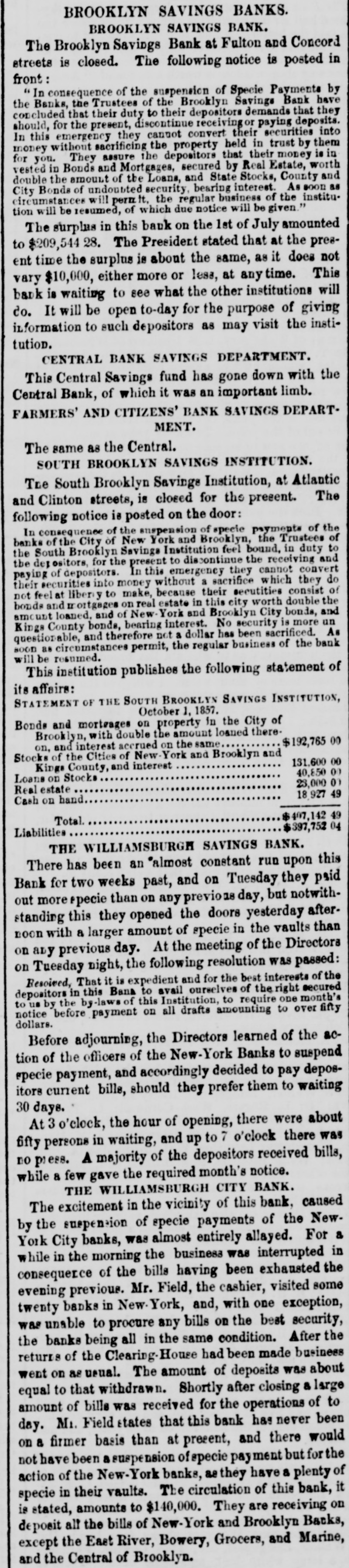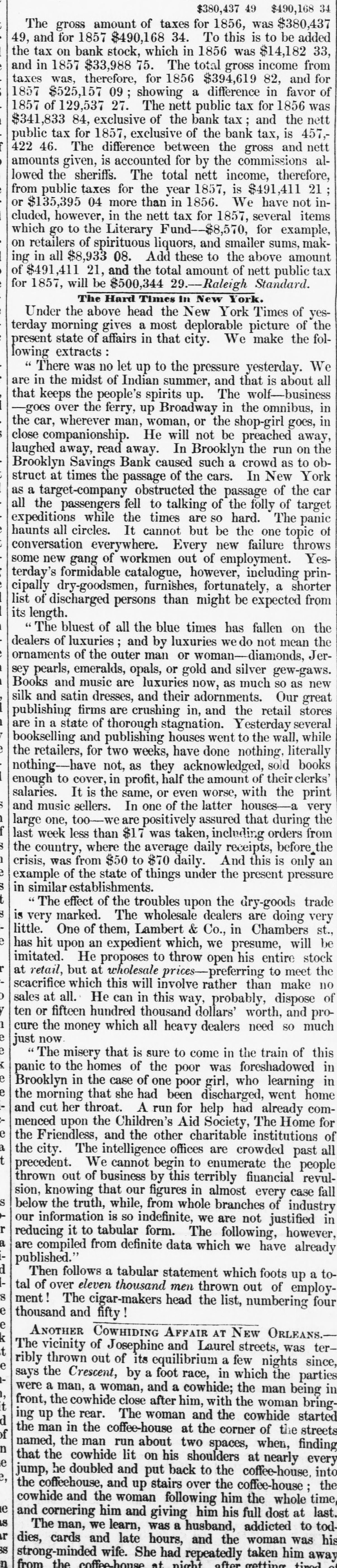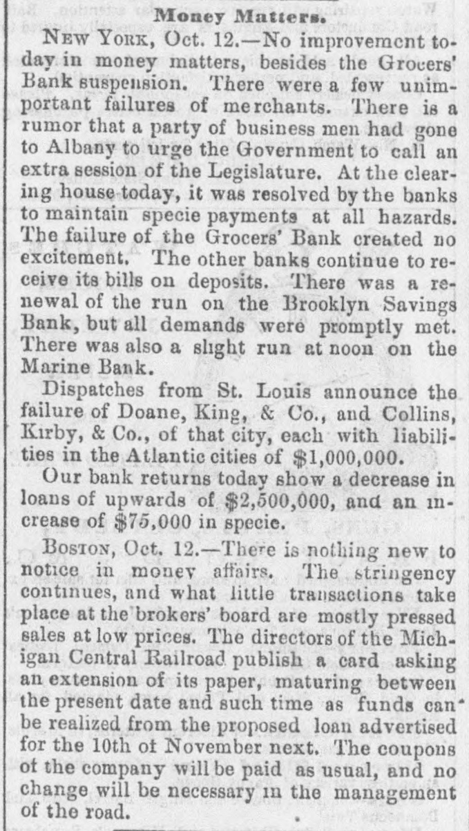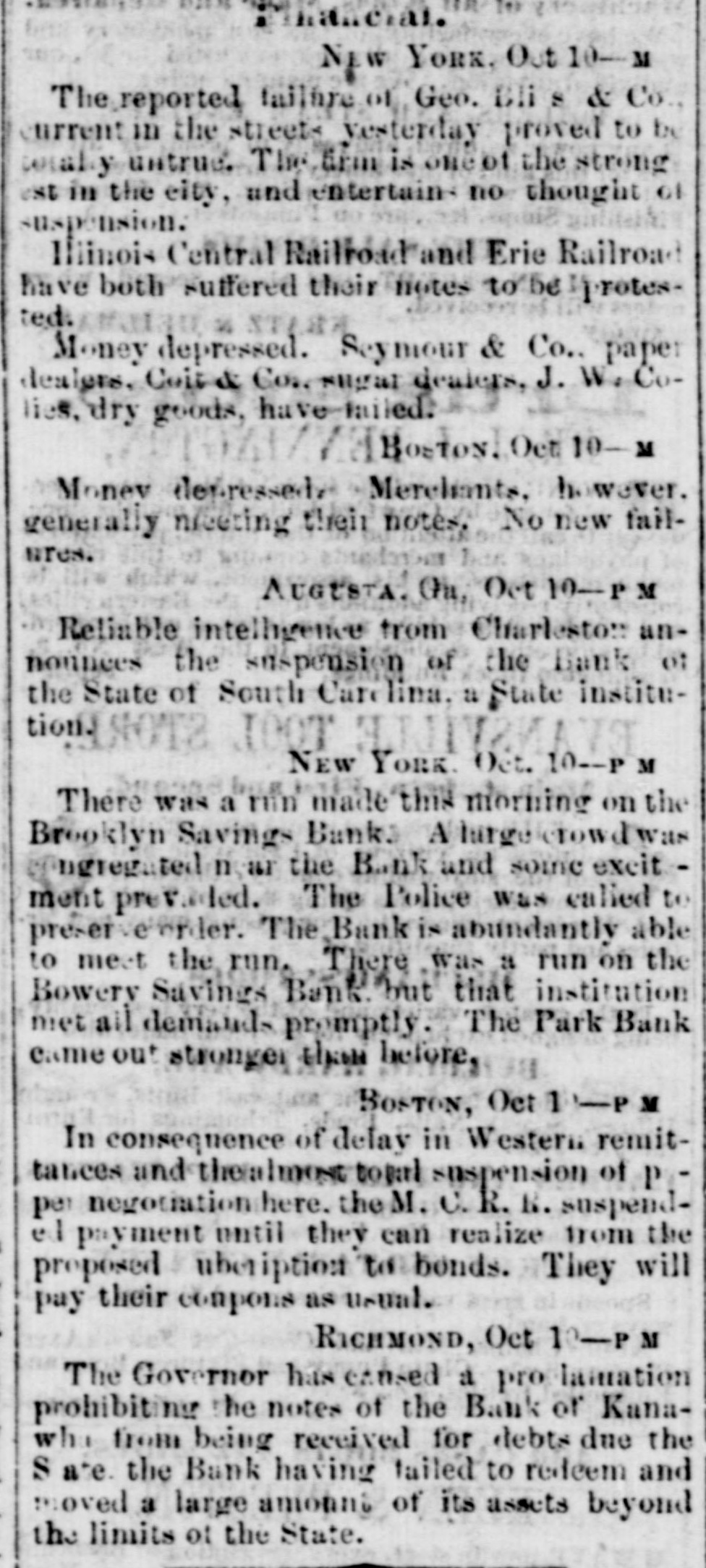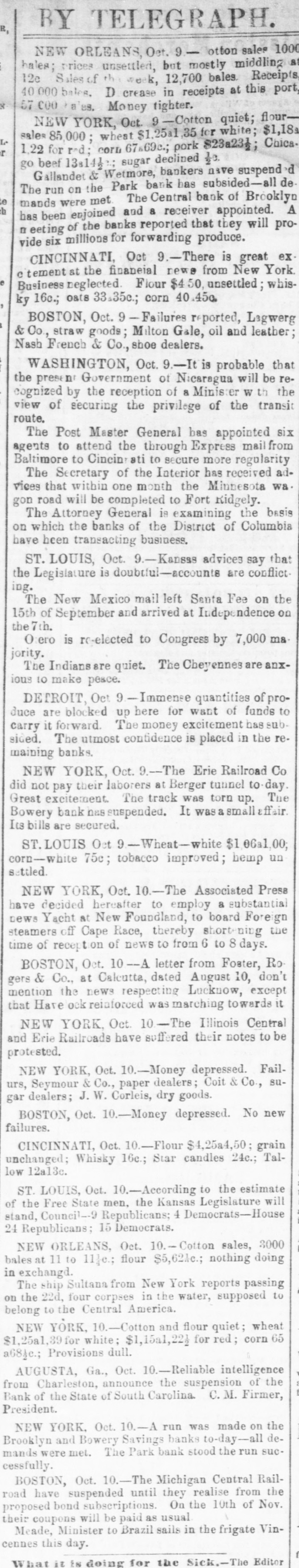 BY TELEGRAPH. NEW ORLEANS, Oct. 9 - otton sales 1000 hales; prices unsettled, but mostly middling at 12c Sales of the week, 12,700 bales. Receipts 40 000 bales. D crease in receipts at this port, 57 000 hales. Money tighter. NEW YORK, Oct. 9 -Cotton quiet; floursales 85,000; wheat $1,25a1 for white; $1,18a 1.22 for red; corn 67a69c.; pork $23a23, Chicago beef 138141 sugar declined 10. Gallandet & Wetmore, bankers nave suspend d The run on the Park bank has subsided-all de mands were met The Central bank of Brooklyn has been enjoined and 8 receiver appointed. A n eeting of the banks reported that they will provide six millions for forwarding produce. CINCINNATI, Oct 9.-There is great ex C tement at the financial news from New York. Business neglected. Flour $450, unsettled whisky 16c.; oats 33.35c.; corn 40.45c. BOSTON, Oct. 9 Failures reported, Lagwerg & Co., straw goods; Milton Gale, oil and leather; Nash French & Co., shoe dealers. WASHINGTON, Oct. 9.-It is probable that the present Government of Nicaragua will be recognized by the reception of a Minister W th the view of securing the privilege of the transit route. The Post Master General has appointed six agents to attend the through Express mail from Baltimore to Cincin ati to secure more regularity The Secretary of the Interior has received advices that within one month the Minnesota wa. gon road will be completed to Fort Ridgely. The Attorney General is examining the basis on which the banks of the District of Columbia have been transacting business. ST. LOUIS, Oct. 9.-Kansas advices say that the Legislature is doubtful-accounts are conflict. ing. The New Mexico mail left Santa Fee on the 15th of September and arrived at Independence on the7th. Otero is re-elected to Congress by 7,000 ma. jority. The Indians quiet. The Cheyennes are anxious to make peace. DETROIT, Oct 9 -Immense quantities of produce are blocked up here for want of funds to carry it forward. The money excitement has subsided. The utmost confidence is placed in the remaining banks. NEW YORK, Oct. 9.-The Erie Railroad Co did not pay their laborers at Berger tunnel to-day. Grest excitement. The track was torn up. The Bowery bank has suspended. It wasasmallaffair. Its bills are secured. ST.LOUIS Oct -Wheat-white $1,06a1,00; corn-white 75c; tobacco improved; hemp un settled. NEW YORK, Oct. 10.-The Associated Press have decided hereafter to employ a substantial news Yacht at New Foundland, to board Foreign steamers off Cape Race, thereby shortening the time of reception of news to from 6 to 8 days. BOSTON, Oct. 10-A letter from Foster, Ro. gers & Co., at Calcutta, dated August 10, don't mention the news respecting Lucknow, except that Have ock reinforced was marching towards it NEW YORK, Oct. 10-The Illinois Central and Erie Railroads have suffered their notes to be protested. NEW YORK, Oct. 10.-Money depressed. Failurs, Seymour & Co., paper dealers; Coit & Co., sugar dealers; J. W. Corleis, dry goods. BOSTON, Oct. 10.-Money depressed. No new failures. CINCINNATI, Oct. 10.-Flour $4,25a4,50; grain unchanged; Whisky 16c.; Star candles 24c.; Tallow 12a13c. ST. LOUIS, Oct. 10.-According to the estimate of the Free State men. the Kansas Legislature will stand, Council--9 Republicans; 4 Democrats-House 24 Republicans; 15 Democrats. NEW ORLEANS, Oct. 10.-Cotton sales, 3000 bales at 11 to 11}c.; flour $5,624c.; nothing doing in exchangd. The ship Sultana from New York reports passing on the 22d, four corpses in the water, supposed to belong to the Central America. NEW YORK, 10.-Cotton and flour quiet; wheat $1,25a1,39 for white; $1,15a1,22} for red; corn 65 a68&c.; Provisions dull. AUGUSTA, Ga., Oct. 10.-Reliable intelligence from Charleston, announce the suspension of the Bank of the State of South Carolina. C.M. Firmer, President. NEW YORK, Oct. 10.-A run was made on the Brooklyn and Bowery Savings banks to-day-all demands were met. The Park bank stood the run successfully. BOSTON, Oct. 10.-The Michigan Central Railroad have suspended until they realise from the proposed bond subscriptions. On the 10th of Nov. their coupons will be paid as usual Meade, Minister to Brazil sails in the frigate Vincennes this day. f What it is doing for the Sick.-The Editor