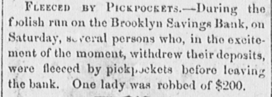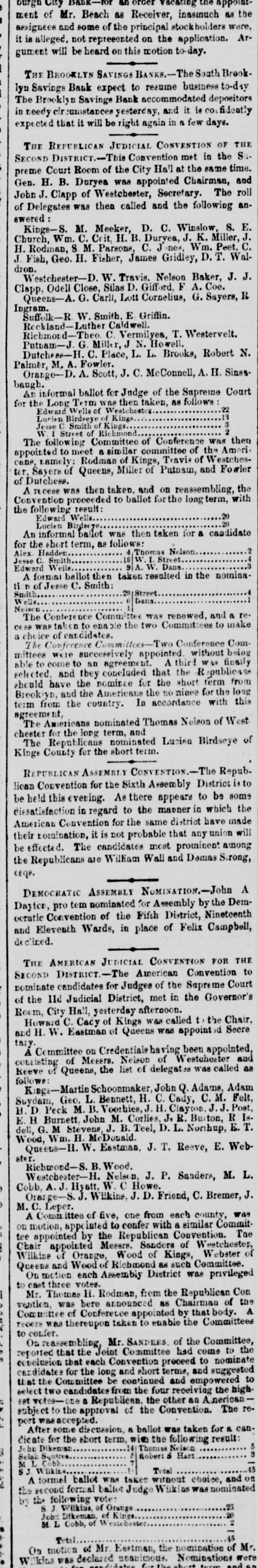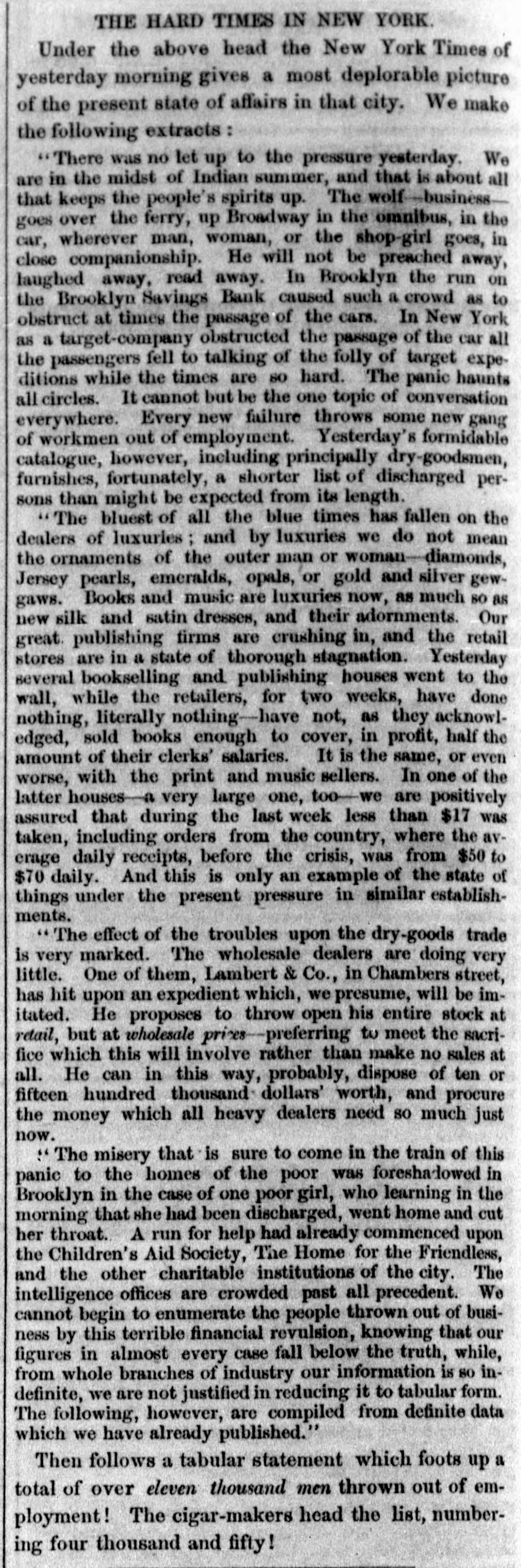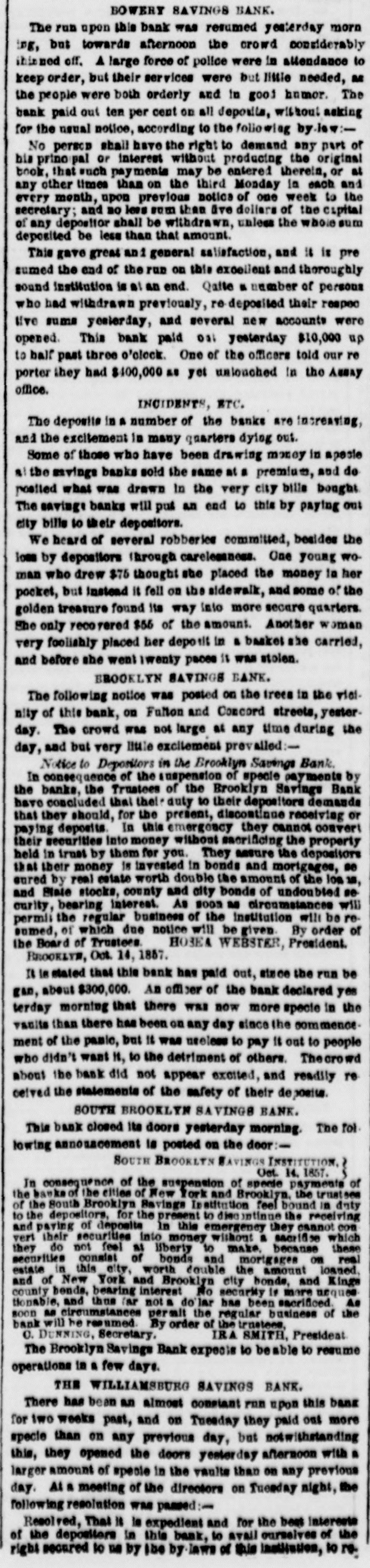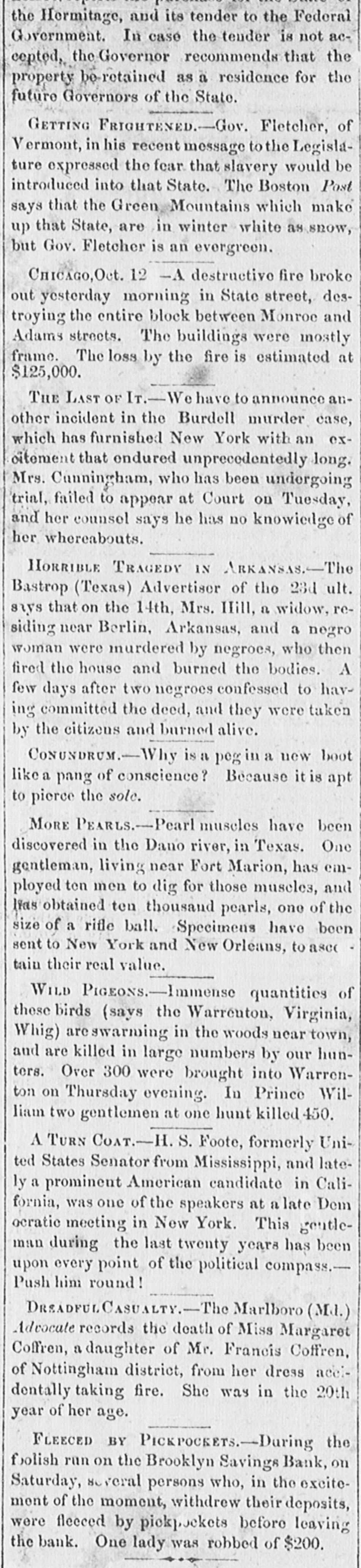 BY TELEGRAPH. NEW ORLEANS, Oct. 9 - otton sales 1000 hales; prices unsettled, but mostly middling at 12c Sales of the week, 12,700 bales. Receipts 40 000 bales. D crease in receipts at this port, 57 000 hales. Money tighter. NEW YORK, Oct. 9 -Cotton quiet; floursales 85,000; wheat $1,25a1 for white; $1,18a 1.22 for red; corn 67a69c.; pork $23a23, Chicago beef 138141 sugar declined 10. Gallandet & Wetmore, bankers nave suspend d The run on the Park bank has subsided-all de mands were met The Central bank of Brooklyn has been enjoined and 8 receiver appointed. A n eeting of the banks reported that they will provide six millions for forwarding produce. CINCINNATI, Oct 9.-There is great ex C tement at the financial news from New York. Business neglected. Flour $450, unsettled whisky 16c.; oats 33.35c.; corn 40.45c. BOSTON, Oct. 9 Failures reported, Lagwerg & Co., straw goods; Milton Gale, oil and leather; Nash French & Co., shoe dealers. WASHINGTON, Oct. 9.-It is probable that the present Government of Nicaragua will be recognized by the reception of a Minister W th the view of securing the privilege of the transit route. The Post Master General has appointed six agents to attend the through Express mail from Baltimore to Cincin ati to secure more regularity The Secretary of the Interior has received advices that within one month the Minnesota wa. gon road will be completed to Fort Ridgely. The Attorney General is examining the basis on which the banks of the District of Columbia have been transacting business. ST. LOUIS, Oct. 9.-Kansas advices say that the Legislature is doubtful-accounts are conflict. ing. The New Mexico mail left Santa Fee on the 15th of September and arrived at Independence on the7th. Otero is re-elected to Congress by 7,000 ma. jority. The Indians quiet. The Cheyennes are anxious to make peace. DETROIT, Oct 9 -Immense quantities of produce are blocked up here for want of funds to carry it forward. The money excitement has subsided. The utmost confidence is placed in the remaining banks. NEW YORK, Oct. 9.-The Erie Railroad Co did not pay their laborers at Berger tunnel to-day. Grest excitement. The track was torn up. The Bowery bank has suspended. It wasasmallaffair. Its bills are secured. ST.LOUIS Oct -Wheat-white $1,06a1,00; corn-white 75c; tobacco improved; hemp un settled. NEW YORK, Oct. 10.-The Associated Press have decided hereafter to employ a substantial news Yacht at New Foundland, to board Foreign steamers off Cape Race, thereby shortening the time of reception of news to from 6 to 8 days. BOSTON, Oct. 10-A letter from Foster, Ro. gers & Co., at Calcutta, dated August 10, don't mention the news respecting Lucknow, except that Have ock reinforced was marching towards it NEW YORK, Oct. 10-The Illinois Central and Erie Railroads have suffered their notes to be protested. NEW YORK, Oct. 10.-Money depressed. Failurs, Seymour & Co., paper dealers; Coit & Co., sugar dealers; J. W. Corleis, dry goods. BOSTON, Oct. 10.-Money depressed. No new failures. CINCINNATI, Oct. 10.-Flour $4,25a4,50; grain unchanged; Whisky 16c.; Star candles 24c.; Tallow 12a13c. ST. LOUIS, Oct. 10.-According to the estimate of the Free State men. the Kansas Legislature will stand, Council--9 Republicans; 4 Democrats-House 24 Republicans; 15 Democrats. NEW ORLEANS, Oct. 10.-Cotton sales, 3000 bales at 11 to 11}c.; flour $5,624c.; nothing doing in exchangd. The ship Sultana from New York reports passing on the 22d, four corpses in the water, supposed to belong to the Central America. NEW YORK, 10.-Cotton and flour quiet; wheat $1,25a1,39 for white; $1,15a1,22} for red; corn 65 a68&c.; Provisions dull. AUGUSTA, Ga., Oct. 10.-Reliable intelligence from Charleston, announce the suspension of the Bank of the State of South Carolina. C.M. Firmer, President. NEW YORK, Oct. 10.-A run was made on the Brooklyn and Bowery Savings banks to-day-all demands were met. The Park bank stood the run successfully. BOSTON, Oct. 10.-The Michigan Central Railroad have suspended until they realise from the proposed bond subscriptions. On the 10th of Nov. their coupons will be paid as usual Meade, Minister to Brazil sails in the frigate Vincennes this day. f What it is doing for the Sick.-The Editor