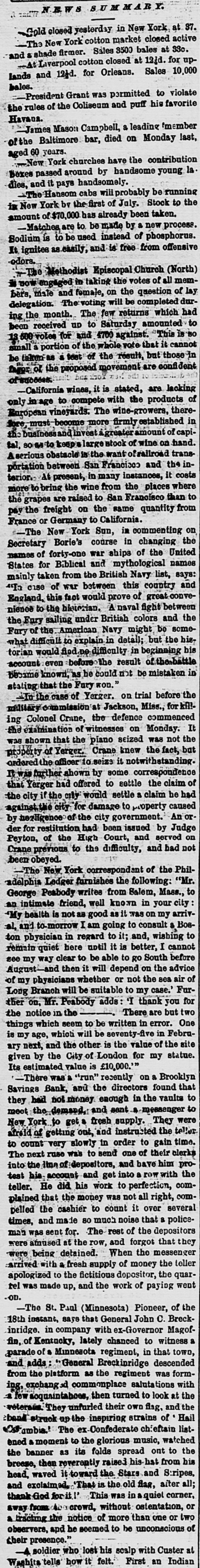 8 S U M M Y. Gold closed yesterday in New York at 37. -The New York cotton market closed active and shade firmer. Sales 3500 bales at 33c. At Liverpool cotton closed at 12id. for upLands and 12d. for Orleans. Sales 10,000 bales. President Grant was permitted to violate the rules of the Coliseum and puff his favorite Havana. James Mason Campbell, a leading member of the Baltimore bar, died on Monday last, aged years. -New York churches have the contribution Boxes passed around by handsome young la dies, and it pays handsomely. -The [ansom cabs will probably be running is New York by the first of July. Stock to the amount of $70,000 has already been taken. -Matches are to be made by a new process. Sodium is to be used instead of phosphorus. It ignites as easily, and is free from offensive odors. The Methodist Episcopal Church (North) now engaged in taking the votes of all members, male and female, on the question of lay delegation. The voting will be completed during the month. The few returns which had been received up to Saturday amounted to 13 600 votes for and 4700 against This is BO small a portion of the whole vote that it cannot be taken-as a test of the result, but those in fagor of the proposed movement are confi dent of success. California wines, it is stated, are lacking only image to compete with the products of European vineyards. The wine-growers, there fore, must-become more firmly established in the businessand invest agreater amount of capital, 80 to keep's large stock of wine on hand A serious obstacle is the want of railroad transportation between San Francisco and the interior.- At present, in many instances, it costs more to bring the wine from the places where the grapes are raised to San Francisco than to pay the freight on the same quantity from France or Germany to California. The New York Sun, in commenting on Secretary Borie's course in changing the names of forty-one war ships of the United States for Biblical and mythological names mainly taken from the British Navy list, says: "In case of war between this country and England, this fact would prove of great convenience to the hietorian. A naval fight between the Fury sailing under British colors and the Fary of the American Navy might be somewhat difficult to explain in detail: but the historian would fioda difficulty in beginning his account even before the result of the battle became known, as he could not be mistaken in stating that the Fury kon. To the case of Yerger. on trial before the military commission at Jackson, Miss., for killing Colonel Crane, the defence commenced It the examination of witnesses on Monday was shown that the piano seized was not the property of Yerger. Crane knew the fact, but ordered the officer to seize it notwithstanding. It was further shown by some correspondence that Yerger had offered to settle the claim of the city if the city would settle a claim he had against.the city for damage to property caused by trezligence of the city government. An or der for restitution had been issued by Judge Peyton, of the High Court, and served on Crane previous to the difficulty, and had not been obeyed. -The New York correspondant of the Philadelphia Ledger furnishes the following: "Mr. George Peabody writes from Salem, Mass., to an intimate friend, well known in your city 'My health is not as good as it was on my arrival. and to-morrow I am going to consult a Boston physician in regard to it; and, wishing to remain quiet here until it is better, I cannot see my way clear to be able to go South before August and then it will depend on the advice of my physicians whether or not the sea air of Long Branch will be suitable to my case. Further on, Mr. Peabody adds 'I thank you for There are but two the notice in the things which seem to be written in error. One is my age, which will be seventy-five in February next, and the other is the value of the site given by the City of London for my statue. Its estimated value is £10,000. -There was a "run" recently on a Brooklyn Savings Bank, and the directors found that they had not money enough in the vaults to meet the demand, and sent a messenger to New York to get a fresh supply. They were afroid of getting out, and instructed the teller to count very slowly in order to gain time. The next ruse was to send one of their clerks into the line of depositors, and baye him protest his. account and get into a row with the teller. He did his work to perfection, complained that the money was not all right, comDelled the cashier to count it over several times, and made 80 much noise that policeman was sent for. The rest of the depositors were amused at the row, and forgot that they were being detained. When the messenger arrived with a fresh supply of money the teller apologized to the fictitious depositor, the quarrel was made up, and the work of paying went OD. -The St. Paul (Minnesota) Pioneer, of the 18th instant, save that General John C. Breck inridge. in company with ex-Governor Magoffin. of Kentucky, lately chanced to witness parade of a Minneaota regiment, in that town, and adds General Breckinridge descended from the platform as the regiment was forming, exchang d commonplace salutations with & few acquaintables, then turned to look at the veterais They unfurled their OWD flag, and the bank struck up the inspiring strains of Hail ambia. The ex Confederate chieftain list. ened moment to the glorious music, watched the banner as its folds spread ont to the breese, then reverently raised his hst from his head, waved it toward the Stars and S:ripes, and exclaimed. That is the old flag, after all; thank God for it This was in quiet corner, away from to crowd, without ostentation, or a tracting the notice of more than one or two observers, and he seemed to be unconscious of their presence." soldier who lost his scalp with Custer at Washita tells how it felt. First an Indian