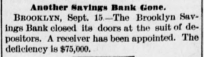 Another Savings Bank Gone. BROOKLYN, Sept. 15-The Brooklyn Savings Bank closed its doors at the suit of depositors. A receiver has been appointed. The deficiency is $75,000.