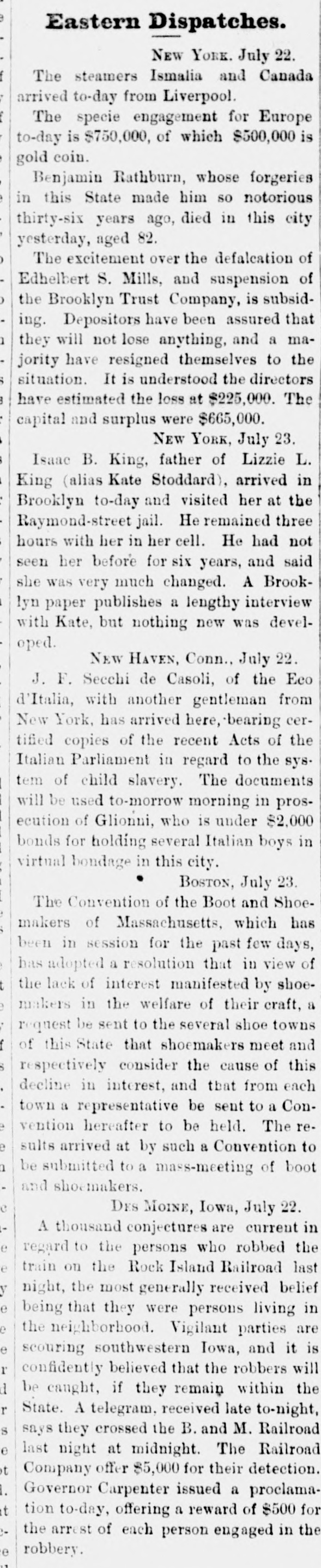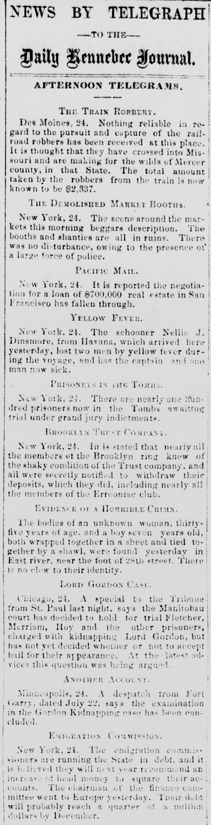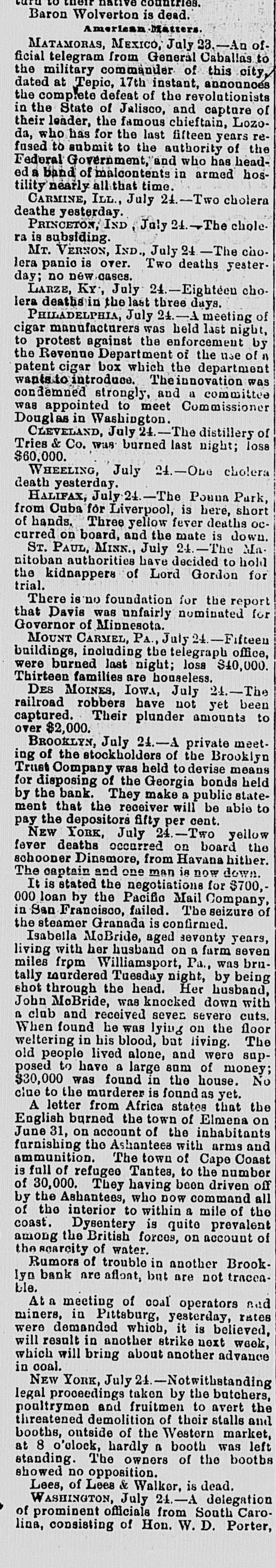 LO men native countries. Baron Wolverton is dead. American-Malzers. MATAMORAS, MEXICO, July 23.-An official telegram from General Caballas to the military commander of this city, dated at Tepic, 17th instant, announces the complete defeat of the revolutionists in the State of Jalisco, and capture of their leader, the famous chieftain, Lozoda, who has for the last fifteen years refused to submit to the authority of the Federal Government, and who has headed a band of malcontents in armed hostility nearly all that time. CARMINE, ILL., July 2£.-Two cholera deathe yesterday PRINCETON, IND July The cholera is subsiding. Mr. VERNON, IND., July -The cholera panic is over. Two deaths yesterday; no new cases. LARZE, KY, July 24.-Eighteen cholera deathsin the last three days. PHILADELPHIA, July 24.-Ameeting of cigar manufacturers was held last night, to protest against the enforcement by the Revenue Department of the use of patent cigar box which the department wants.to introduce. Theinnovation was condemned strongly, and a committee was appointed to meet Commissioner Douglas in Washington. CLEVELAND, July 24.-The distillery of Tries & Co. was burned last night; loss $60,000. WHEELING, July 24.-Obe cholera death yesterday. HALIFAX, July 24.-The Pouna Park, from Cuba for Liverpool, is here, short of hands. Three yellow fever deaths occurred on board, and the mate is down. ST. PAUL, MINN., July 24.-The Ma nitoban authorities have decided to hold the kidnappers of Lord Gordon for trial. There is no foundation for the report that Davis was unfairly nominated for Governor of Minnesota. MOUNT CARMEL, PA., July 24. .Fifteen buildings, including the telegraph office, were burned last night; losa $40,000. Thirteen families are houseless. DES MOINES, IOWA, July 24.-The railroad robbers have not yet been captured. Their plunder amounts to over $2,000. BROOKLYN, July 24.-A private meeting of the stockholders of the Brooklyn Trust Company was held to devise means for disposing of the Georgia bonds held by the bank. They make a public statement that the receiver will be able to pay the depositors fifty per cent. NEW YORK, July 24.-Two yellow fever deaths occurred on board the schooner Dinsmore, from Havana hither. The captain and one man is now down. It is stated the negotiations for $700,000 loan by the Pacific Mail Company, of in San Francisco, failed. The seizure the steamer Granada is confirmed. Isabella McBride, aged seventy years, living with her husband on a farm seven miles from Williamsport, Pa., was brntally mardered Tuesday night, by being shot through the head. Her husband, John McBride, was knocked down with a club and received seven severe cuts. When found he was lying on the floor weltering in his blood, bat living. The old people lived alone, and were supposed to have a large sum of money; $30,000 was found in the house. No clue to the murderer is found as yet. A letter from Africa states that the English burned the town of Elmena on June 31, on account of the inhabitants furnishing the Ashantees with arms and ammunition. The town of Cape Coast is full of refugee Tantea, to the number of 30,000. They having been driven off by the Ashantees, who now command all of the interior to within a mile of the coast. Dysentery is quite prevalent among the British forces, on account of the scarcity of water. Rumors of trouble in another Brooklyn bank are aflont, but are not traceable. At a meeting of coal operators and miners, in Pittsburg, yesterday, rates were demanded which, it is believed, will result in another strike next week, which will bring about another advance in coal. NEW YORK, July 34.-Notwithstanding legal proceedings taken by the butchers, poultrymen and fruitmen to avert the threatened demolition of their stalls and booths, outside of the Western market, at 8 o'olock, hardly a booth was left standing. The owners of the bootbs showed no opposition. Lees, of Lees & Walker, is dead. WASHINGTON, July 24.-A delegation of prominent officials from South Carolina, consisting of Hon. W. D. Porter,
