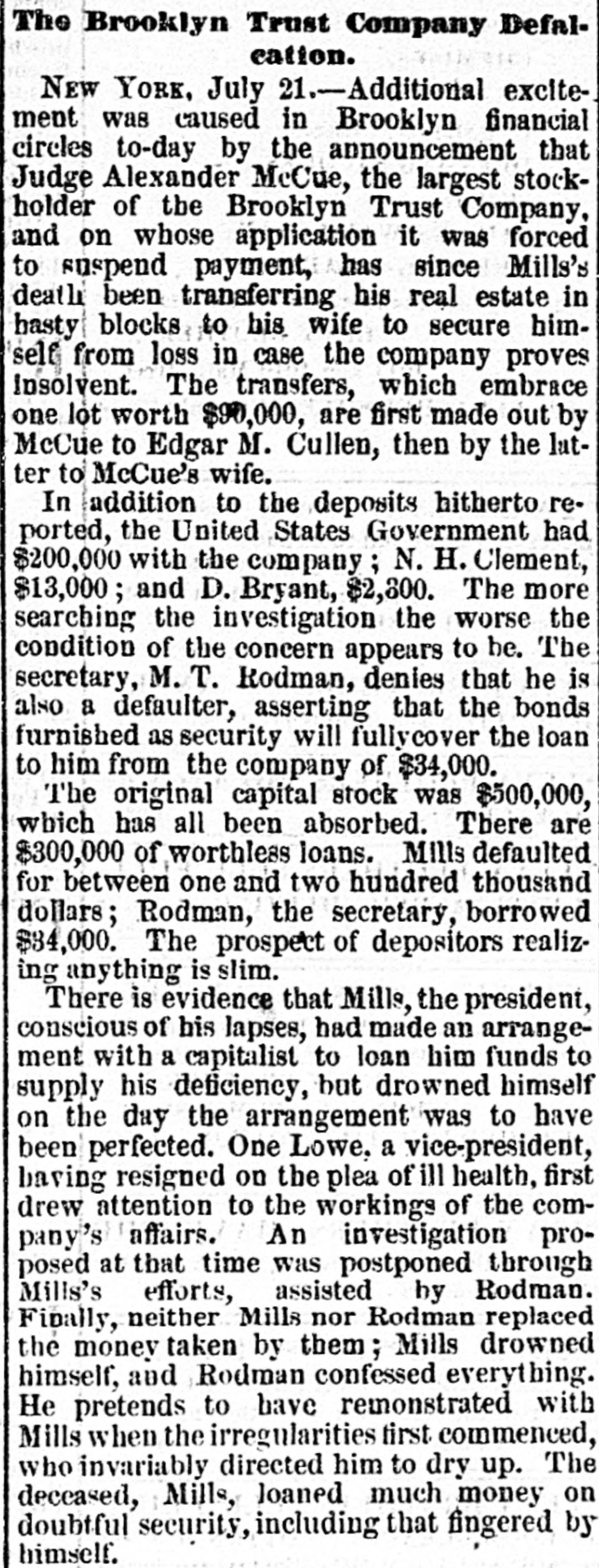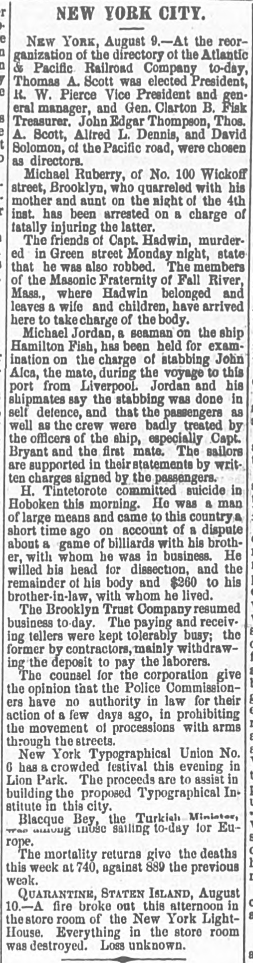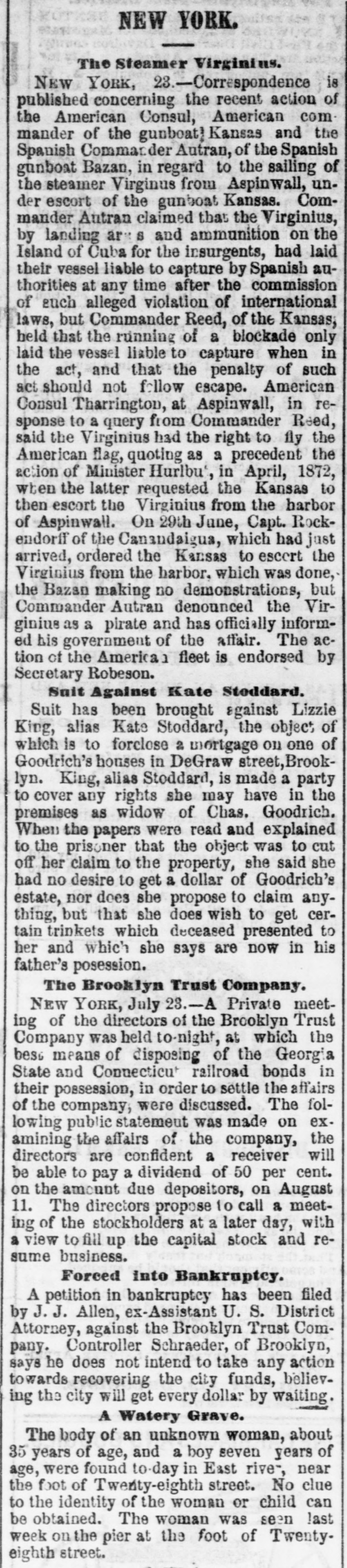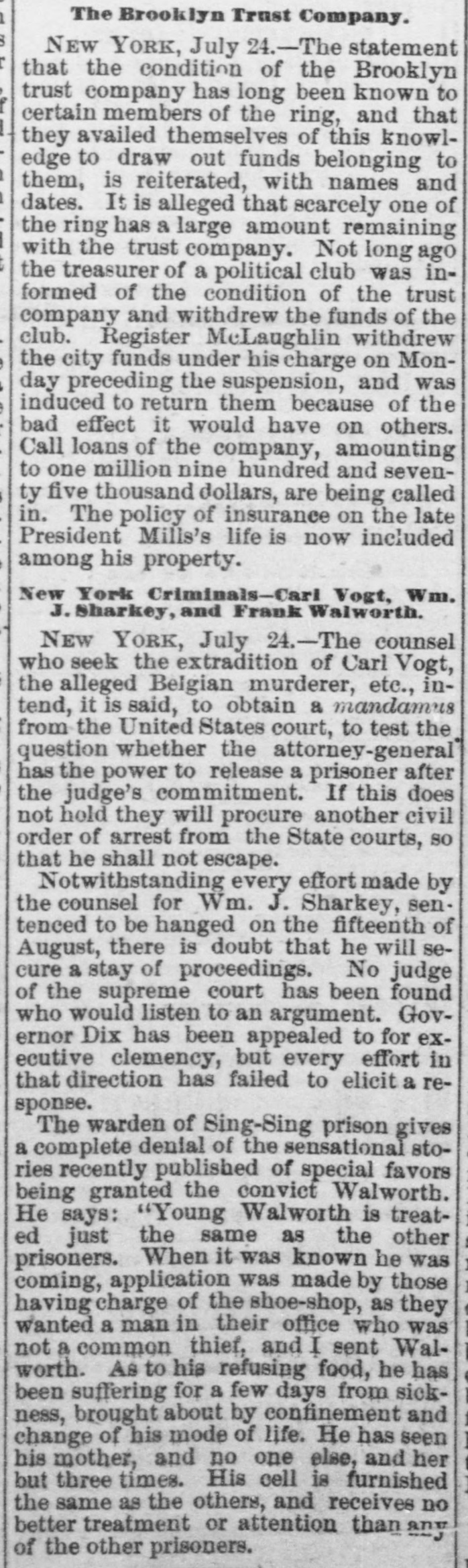 LO men native countries. Baron Wolverton is dead. American-Malzers. MATAMORAS, MEXICO, July 23.-An official telegram from General Caballas to the military commander of this city, dated at Tepic, 17th instant, announces the complete defeat of the revolutionists in the State of Jalisco, and capture of their leader, the famous chieftain, Lozoda, who has for the last fifteen years refused to submit to the authority of the Federal Government, and who has headed a band of malcontents in armed hostility nearly all that time. CARMINE, ILL., July 2£.-Two cholera deathe yesterday PRINCETON, IND July The cholera is subsiding. Mr. VERNON, IND., July -The cholera panic is over. Two deaths yesterday; no new cases. LARZE, KY, July 24.-Eighteen cholera deathsin the last three days. PHILADELPHIA, July 24.-Ameeting of cigar manufacturers was held last night, to protest against the enforcement by the Revenue Department of the use of patent cigar box which the department wants.to introduce. Theinnovation was condemned strongly, and a committee was appointed to meet Commissioner Douglas in Washington. CLEVELAND, July 24.-The distillery of Tries & Co. was burned last night; loss $60,000. WHEELING, July 24.-Obe cholera death yesterday. HALIFAX, July 24.-The Pouna Park, from Cuba for Liverpool, is here, short of hands. Three yellow fever deaths occurred on board, and the mate is down. ST. PAUL, MINN., July 24.-The Ma nitoban authorities have decided to hold the kidnappers of Lord Gordon for trial. There is no foundation for the report that Davis was unfairly nominated for Governor of Minnesota. MOUNT CARMEL, PA., July 24. .Fifteen buildings, including the telegraph office, were burned last night; losa $40,000. Thirteen families are houseless. DES MOINES, IOWA, July 24.-The railroad robbers have not yet been captured. Their plunder amounts to over $2,000. BROOKLYN, July 24.-A private meeting of the stockholders of the Brooklyn Trust Company was held to devise means for disposing of the Georgia bonds held by the bank. They make a public statement that the receiver will be able to pay the depositors fifty per cent. NEW YORK, July 24.-Two yellow fever deaths occurred on board the schooner Dinsmore, from Havana hither. The captain and one man is now down. It is stated the negotiations for $700,000 loan by the Pacific Mail Company, of in San Francisco, failed. The seizure the steamer Granada is confirmed. Isabella McBride, aged seventy years, living with her husband on a farm seven miles from Williamsport, Pa., was brntally mardered Tuesday night, by being shot through the head. Her husband, John McBride, was knocked down with a club and received seven severe cuts. When found he was lying on the floor weltering in his blood, bat living. The old people lived alone, and were supposed to have a large sum of money; $30,000 was found in the house. No clue to the murderer is found as yet. A letter from Africa states that the English burned the town of Elmena on June 31, on account of the inhabitants furnishing the Ashantees with arms and ammunition. The town of Cape Coast is full of refugee Tantea, to the number of 30,000. They having been driven off by the Ashantees, who now command all of the interior to within a mile of the coast. Dysentery is quite prevalent among the British forces, on account of the scarcity of water. Rumors of trouble in another Brooklyn bank are aflont, but are not traceable. At a meeting of coal operators and miners, in Pittsburg, yesterday, rates were demanded which, it is believed, will result in another strike next week, which will bring about another advance in coal. NEW YORK, July 34.-Notwithstanding legal proceedings taken by the butchers, poultrymen and fruitmen to avert the threatened demolition of their stalls and booths, outside of the Western market, at 8 o'olock, hardly a booth was left standing. The owners of the bootbs showed no opposition. Lees, of Lees & Walker, is dead. WASHINGTON, July 24.-A delegation of prominent officials from South Carolina, consisting of Hon. W. D. Porter,
