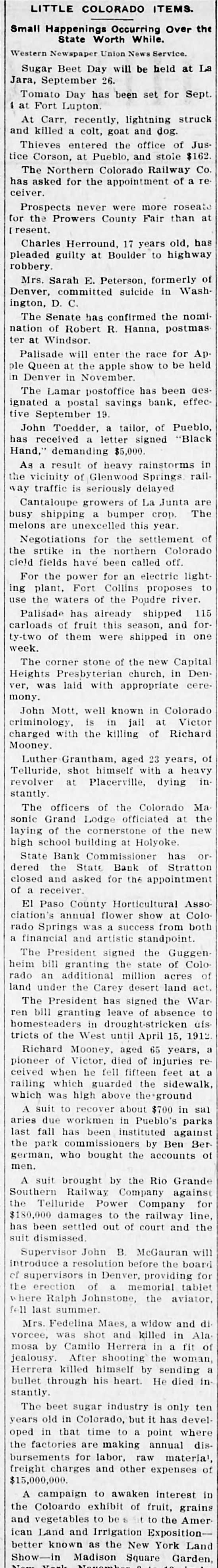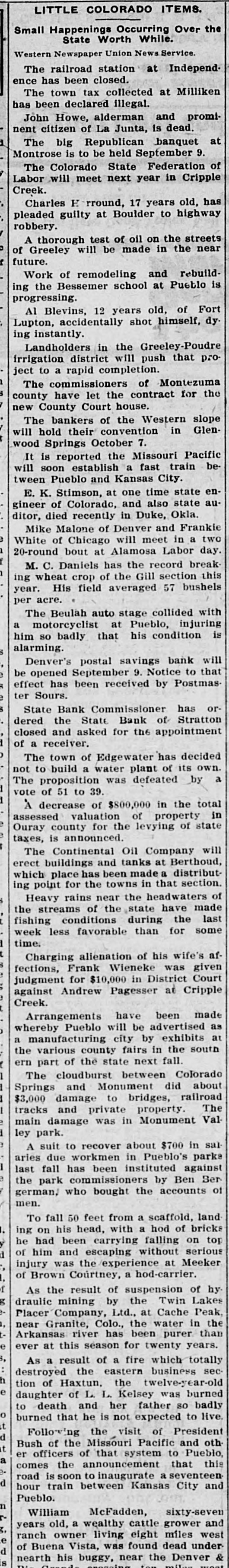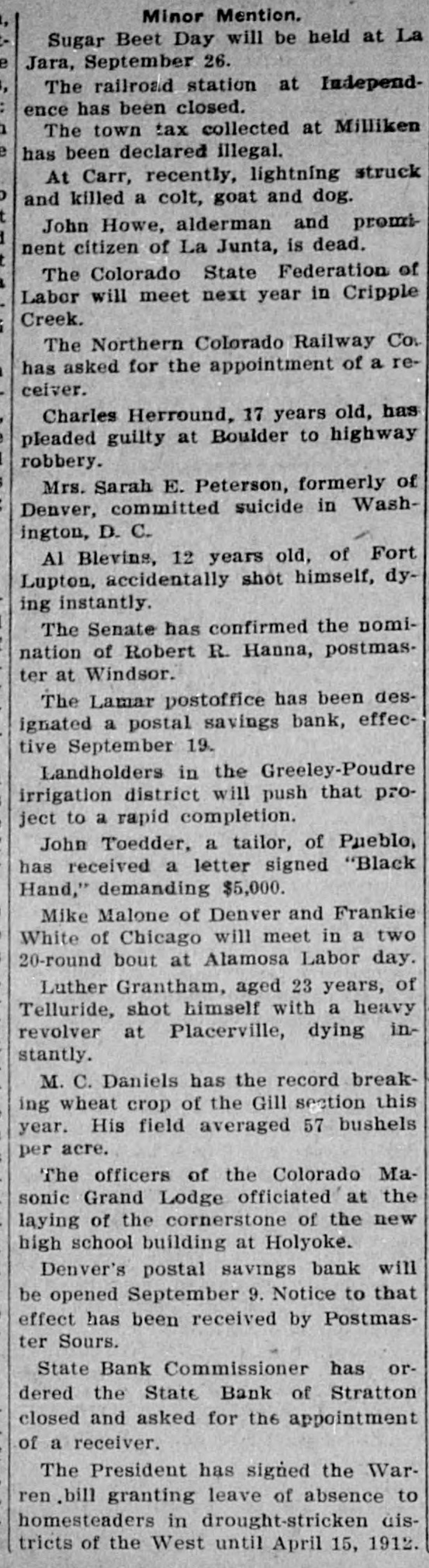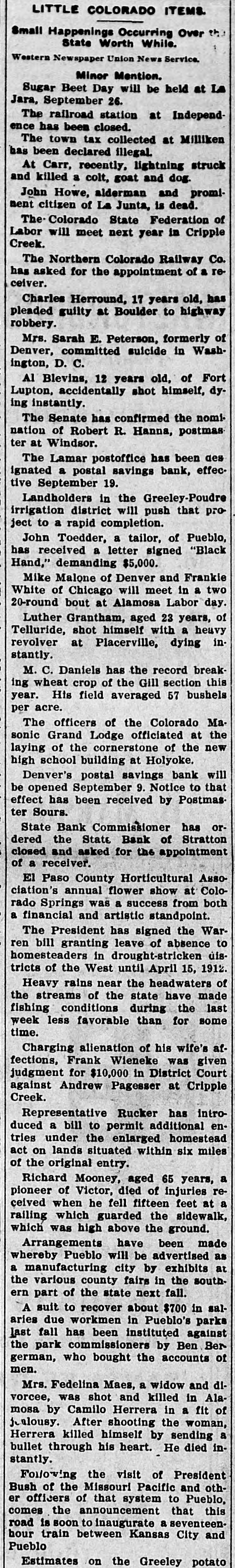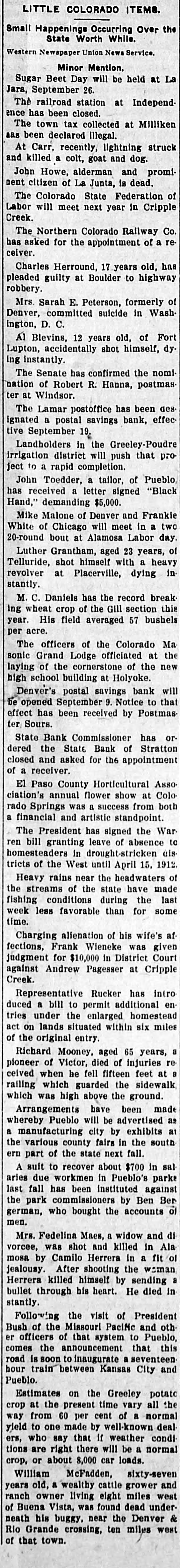 LITTLE COLORADO ITEMS. Small Happening Occurring Over the State Worth While. Western Newspaper Union News Service. Minor Mention. Sugar Beet Day will be held at La Jara, September 26. The railroad station at Independ ence has been closed. The town tax collected at Milliken 125 been declared illegal. struck At Carr, recently, lightning and dog. and killed a colt, goat John Howe, alderman and promi nent citizen of La Junta, is dead. The Colorado State Federation of Labor will meet next year in Cripple Creek. The Northern Colorado Railway Co. has asked for the appointment of a re ceiver. Charles Herround, 17 years old, has pleaded guilty at Boulder to highway robbery. Mrs. Sarah E. Peterson, formerly of Denver, committed suicide in Wash ington, D. C. Al Blevins, 12 years old, of Fort Lupton, accidentally shot himself, dy ing instantly. The Senate has confirmed the nomi nation of Robert R. Hanna, postmas ter at Windsor. The Lamar postoffice has been des ignated a postal savings bank, effec tive September 19. Landholders in the Greeley-Poudre irrigation district will push that project to a rapid completion. John Toedder, a tailor, of Pueblo has received a letter signed "Black Hand," demanding $5,000. Mike Malone of Denver and Frankle White of Chicago will meet in a two 20-round bout at Alamosa Labor day aged 23 years, shot himself a Telluride, Luther Grantham, with heavy in of revolver at Placerville, dying stantly. M. C. Daniels has the record break ing wheat crop of the Gill section this year. His field averaged 57 bushels per acre. officers of the Colorado Ma Grand Lodge the sonic The officiated of the at new laying of the cornerstone high school building at Holyoke. Denver's postal savings bank will be opened September 9. Notice to that effect has been received by Postmas ter Sours. State Bank Commissioner has or dered the State Bank of Stratton closed and asked for the appointment of receiver. El Paso County Horticultural Asso annual flower show at Colo was a success a and artistic clation's rado financial Springs standpoint from both The President has signed the War ren bill granting leave of absence to homesteaders in drought-stricken dis tricts of the West until April 15. 1912 rains near the of Heavy headwaters have made the streams of the state fishing conditions during the last week less favorable than for some time. Charging alienation of his wife's af fections, Frank Wieneke was given judgment for $10,000 in District Court against Andrew Pagesser at Cripple Creek. Representative Rucker has intro duced a bill to permit additional en tries under the enlarged homestead act on lands situated within six miles of the original entry. Richard Mooney, aged 65 years, a of Victor, died of re pioneer injuries feet at ceived when he fell fifteen railing which guarded the sidewalk which was high above the ground. Arrangements have been made Pueblo will be as city by whereby manufacturing advertised exhibits at a the various county fairs in the south ern part of the state next fall. A suit to recover about $700 in sal due workmen in Pueblo's parks has been commissioners by last aries the park fall instituted Ben against Ber german, who bought the accounts of men. Mrs. Fedelina Maes, a widow and di vorcee, was shot and killed in Ala mosa by Camilo Herrera in a fit of jealousy. After shooting the woman killed himself by his heart. in bullet Herrera through He sending died stantly. Following the visit of President Bush of the Missouri Pacific and oth er officers of that system to Pueblo, this comes the announcement that road is soon to inaugurate a seventeen hour train between Kansas City and Pueblo. Estimates on the Greeley potato crop at the present time vary all the way from 60 per cent of a normal to one made by well-known deal who say that If there will be a tions ers, yield are right weather normal condi crop, or about 8,000 car loads. William McFadden, sixty-seven a wealthy cattle grower owner living years old, eight miles west and was found under ranch of Buena Vista, dead Denver neath his buggy, near the Rio Grande crossing, ten miles west of that town.