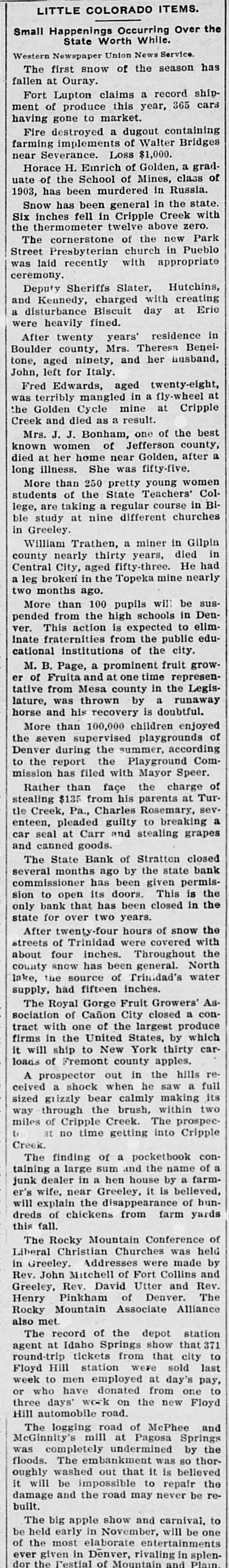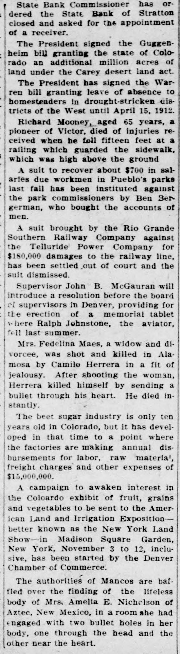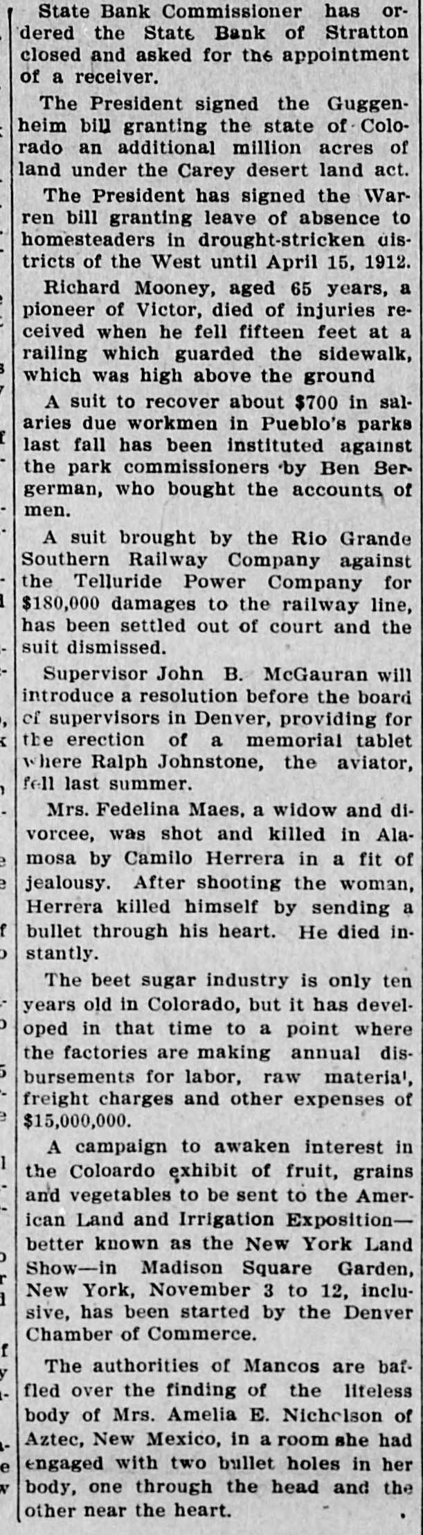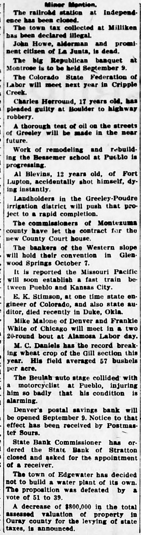 LITTLE COLORADO ITEMS. Small Happening Occurring Over the State Worth While. Western Newspaper Union News Service. Minor Mention. Sugar Beet Day will be held at La Jara, September 26. The railroad station at Independ ence has been closed. The town tax collected at Milliken 125 been declared illegal. struck At Carr, recently, lightning and dog. and killed a colt, goat John Howe, alderman and promi nent citizen of La Junta, is dead. The Colorado State Federation of Labor will meet next year in Cripple Creek. The Northern Colorado Railway Co. has asked for the appointment of a re ceiver. Charles Herround, 17 years old, has pleaded guilty at Boulder to highway robbery. Mrs. Sarah E. Peterson, formerly of Denver, committed suicide in Wash ington, D. C. Al Blevins, 12 years old, of Fort Lupton, accidentally shot himself, dy ing instantly. The Senate has confirmed the nomi nation of Robert R. Hanna, postmas ter at Windsor. The Lamar postoffice has been des ignated a postal savings bank, effec tive September 19. Landholders in the Greeley-Poudre irrigation district will push that project to a rapid completion. John Toedder, a tailor, of Pueblo has received a letter signed "Black Hand," demanding $5,000. Mike Malone of Denver and Frankle White of Chicago will meet in a two 20-round bout at Alamosa Labor day aged 23 years, shot himself a Telluride, Luther Grantham, with heavy in of revolver at Placerville, dying stantly. M. C. Daniels has the record break ing wheat crop of the Gill section this year. His field averaged 57 bushels per acre. officers of the Colorado Ma Grand Lodge the sonic The officiated of the at new laying of the cornerstone high school building at Holyoke. Denver's postal savings bank will be opened September 9. Notice to that effect has been received by Postmas ter Sours. State Bank Commissioner has or dered the State Bank of Stratton closed and asked for the appointment of receiver. El Paso County Horticultural Asso annual flower show at Colo was a success a and artistic clation's rado financial Springs standpoint from both The President has signed the War ren bill granting leave of absence to homesteaders in drought-stricken dis tricts of the West until April 15. 1912 rains near the of Heavy headwaters have made the streams of the state fishing conditions during the last week less favorable than for some time. Charging alienation of his wife's af fections, Frank Wieneke was given judgment for $10,000 in District Court against Andrew Pagesser at Cripple Creek. Representative Rucker has intro duced a bill to permit additional en tries under the enlarged homestead act on lands situated within six miles of the original entry. Richard Mooney, aged 65 years, a of Victor, died of re pioneer injuries feet at ceived when he fell fifteen railing which guarded the sidewalk which was high above the ground. Arrangements have been made Pueblo will be as city by whereby manufacturing advertised exhibits at a the various county fairs in the south ern part of the state next fall. A suit to recover about $700 in sal due workmen in Pueblo's parks has been commissioners by last aries the park fall instituted Ben against Ber german, who bought the accounts of men. Mrs. Fedelina Maes, a widow and di vorcee, was shot and killed in Ala mosa by Camilo Herrera in a fit of jealousy. After shooting the woman killed himself by his heart. in bullet Herrera through He sending died stantly. Following the visit of President Bush of the Missouri Pacific and oth er officers of that system to Pueblo, this comes the announcement that road is soon to inaugurate a seventeen hour train between Kansas City and Pueblo. Estimates on the Greeley potato crop at the present time vary all the way from 60 per cent of a normal to one made by well-known deal who say that If there will be a tions ers, yield are right weather normal condi crop, or about 8,000 car loads. William McFadden, sixty-seven a wealthy cattle grower owner living years old, eight miles west and was found under ranch of Buena Vista, dead Denver neath his buggy, near the Rio Grande crossing, ten miles west of that town.