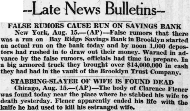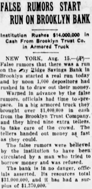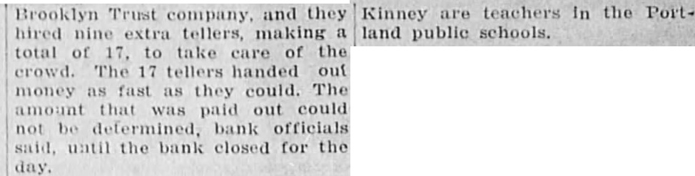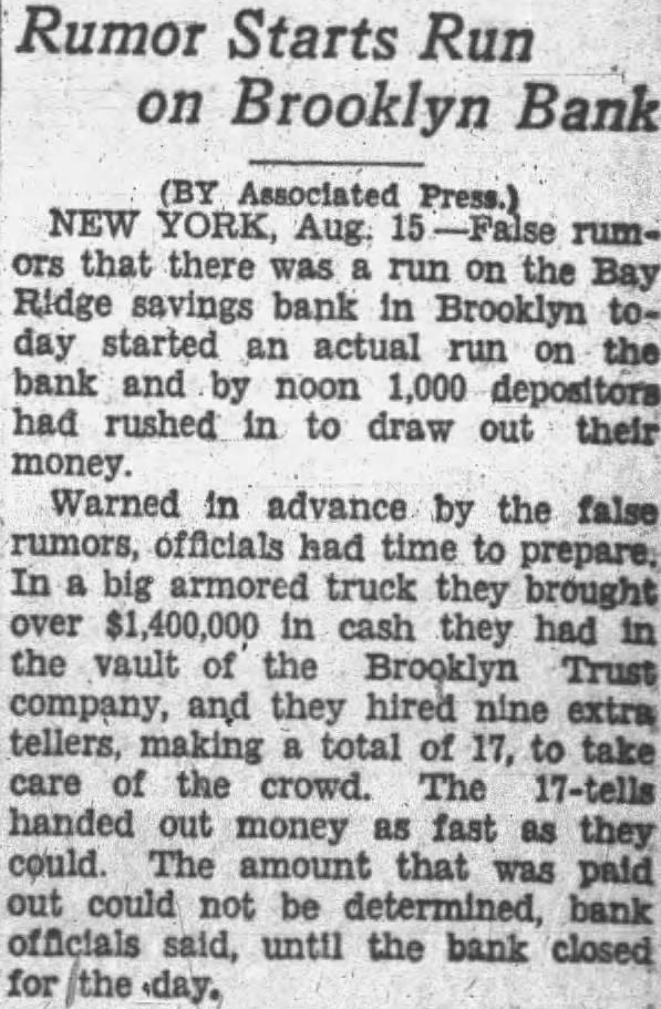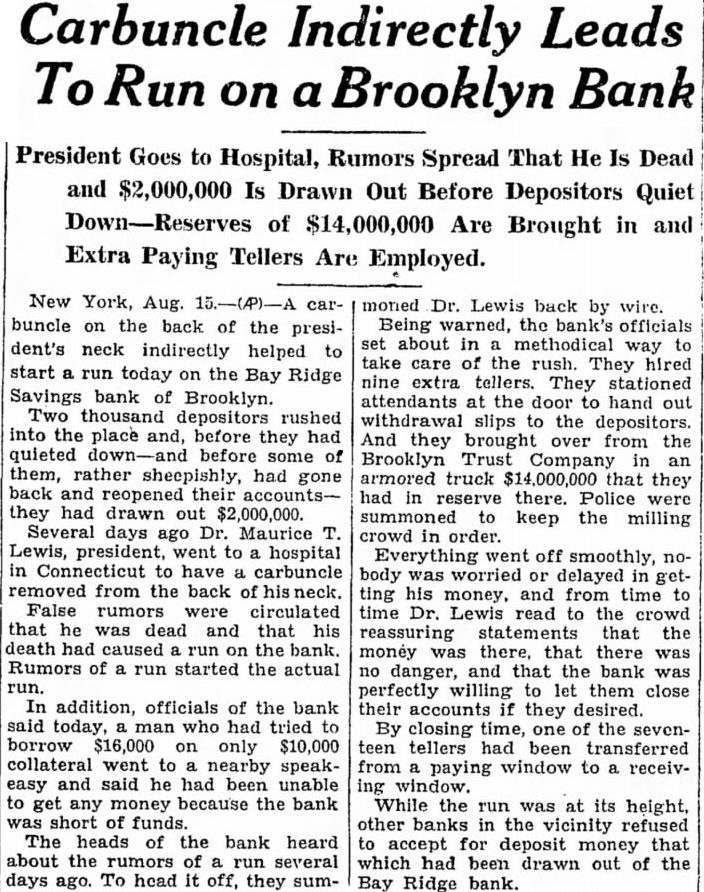 BROOKLYN BANK (Continued) money Warned in advance by the ruofficials had to prepare. truck they cash they had had the Trust Company, and they tellers, take crowd. tellers handed out money fast as they amount that was paid out bank officials could not until the bank closed for the The false rumors that there was on the bank, institution been by money and began to circulate ser One most widely circulated rumor that Lewis, the was dead, anu had started the run. Dr. had gone in Connecticut have carbuncle removed from his summoned by wire and arrived at the bank yesterday Peter Smith attorney the and wanted $16,000 collateral, he turned have told that he went that had tried to borrow money our bank but hadn't get because we have believe that that statement about the we complete investigation and find officials first heard of the the run and out In an effort vent Joseph Broderick, State Super'n tendent Mr. letter, stating bank had found the stitution be in was posted at the bank trance. But failed to prevent the bank is no danger account of the officials Its sources and it has had surplus They help from the Brooklyn Trust Co., Bank friend Dr. and head Duffy Co., contractors.