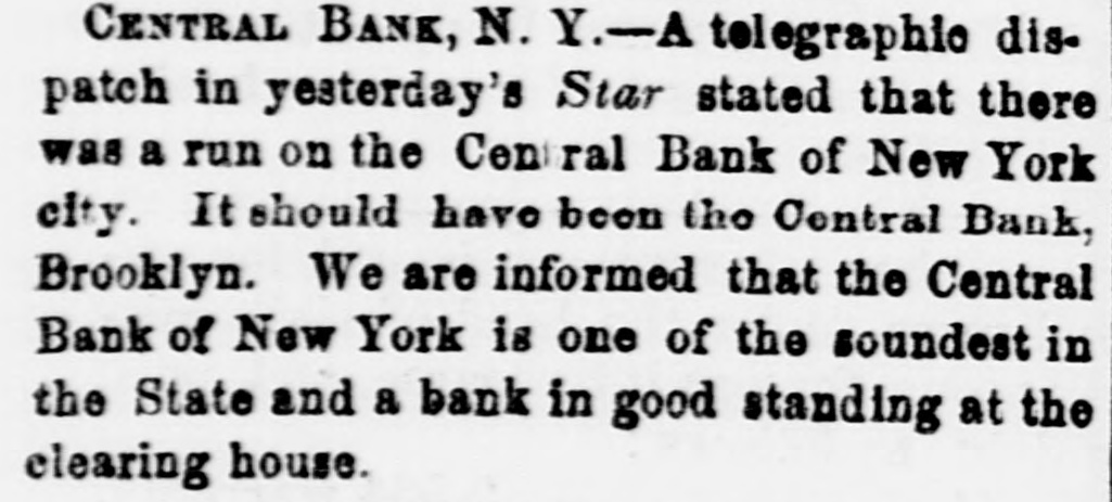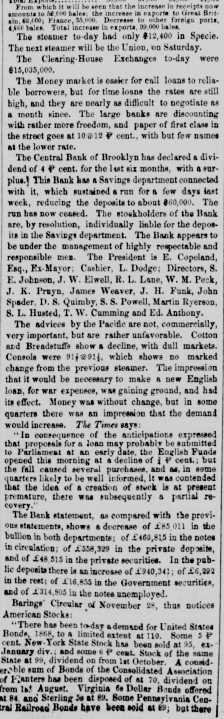 From which it will be seen that the increase in receipts now amounts to 52,000 bales; the increase in exports to Great Britain, 68,000; France, 35,000. Decrease to other foreign porte, 4,000 bales. Total increase in exports, 99,000 bales. The steamer to-day had only $12,400 in Specie. The next steamer will be the Union, on Saturday. The Clearing-House Exchanges to-day were $15,035,000. The Money market is easier for call loans to reliable borrowers, but for time loans the rates are still high, and they are nearly as difficult to negotiate as a month since. The large banks are discounting with rather more freedom, and paper of first class in the street goes at 10@12 P cent., with but few names at the lower rate. The Central Bank of Brooklyn has declared a dividend of 4 P cent. for the last six months, with a surplus.} This Bank has a Savings department connected with it, which sustained a run for 8 few days last week, reducing the deposits to about $60,000. The run has now ceased. The stockholders of the Bank are, by resolution, individually liable for the deposits in the Savings department. The Bank appears to be under the management of highly respectable and responsible men. The President is E. Copeland, Esq., Ex-Mayor; Cashier, L. Dodge; Directors, S. E. Johnson, J. W. Elwell, R. L. Lane, W. M. Peck, J. K. Pruyn, James Weaver, J. H. Funk, John Spader, D.S. Quimby, S.S. Powell, Martin Ryerson, S. L. Husted, T. W. Cumming and Ed. Anthony. The advices by the Pacific are not, commercially, very important, but are rather unfavorable. Cotton and Breadstuffs show a decline, with dull markets. Consols were 91f@91}, which shows no marked change from the previous steamer. The impression that it would be necessary to make 8 new English loan, for war expenses, was gaining ground, and had its effect. Money was without change, but in some quarters there was an impression that the demand would increase. The Times says: In consequence of the anticipations expressed that proposals for a loan may probably be submitted to Parliament at an early date, the English Funds opened this morning at a decline of I P cent.; but the fall caused several purchases, and as, in some quarters likely to be well informed, it was contended that the idea of a creation of stock is at present premature, there was subsequently a partial recovery." The Bank statement, as compared with the previous statements, shows a decrease of £85,011 in the bullion in both departments; of £460,815 in the notes in circulation; of £558,329 in the private deposite, and of £48,515 in the private securities. In the public deposits there is an increase of £940,341; of £6,292 in the rest; of £16,855 in the Government securities, and of £314,805 in the notes unemployed. Barings' Circular of November 28, thus notices American Stocks: "There has been to-day a demand for United States Bonds, 1868, to a limited extent at 110. Some 5 P cent. New-York State Stock has been sold at 95, 6xJanuary div.: and some 6 P cent. Stock of the same State at 99, dividend on from 1st October. A considerable sum of Bonds of the Consolidated Association of Flanters has been disposed of at 70, dividend on from lat August. Virginia 6s Dollar Bends offered at 84. and Sterling 5s at 89. Some Pennsylvania Central Railroad Bonds have been sold at 89; but there