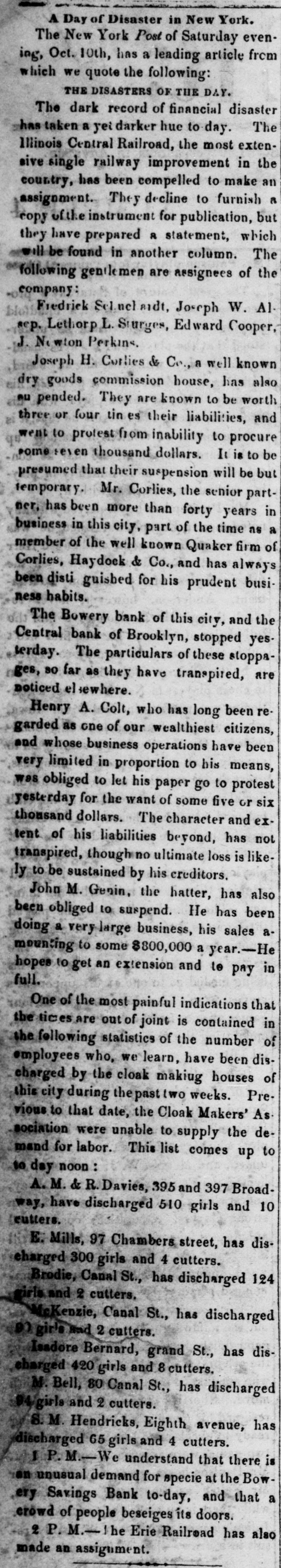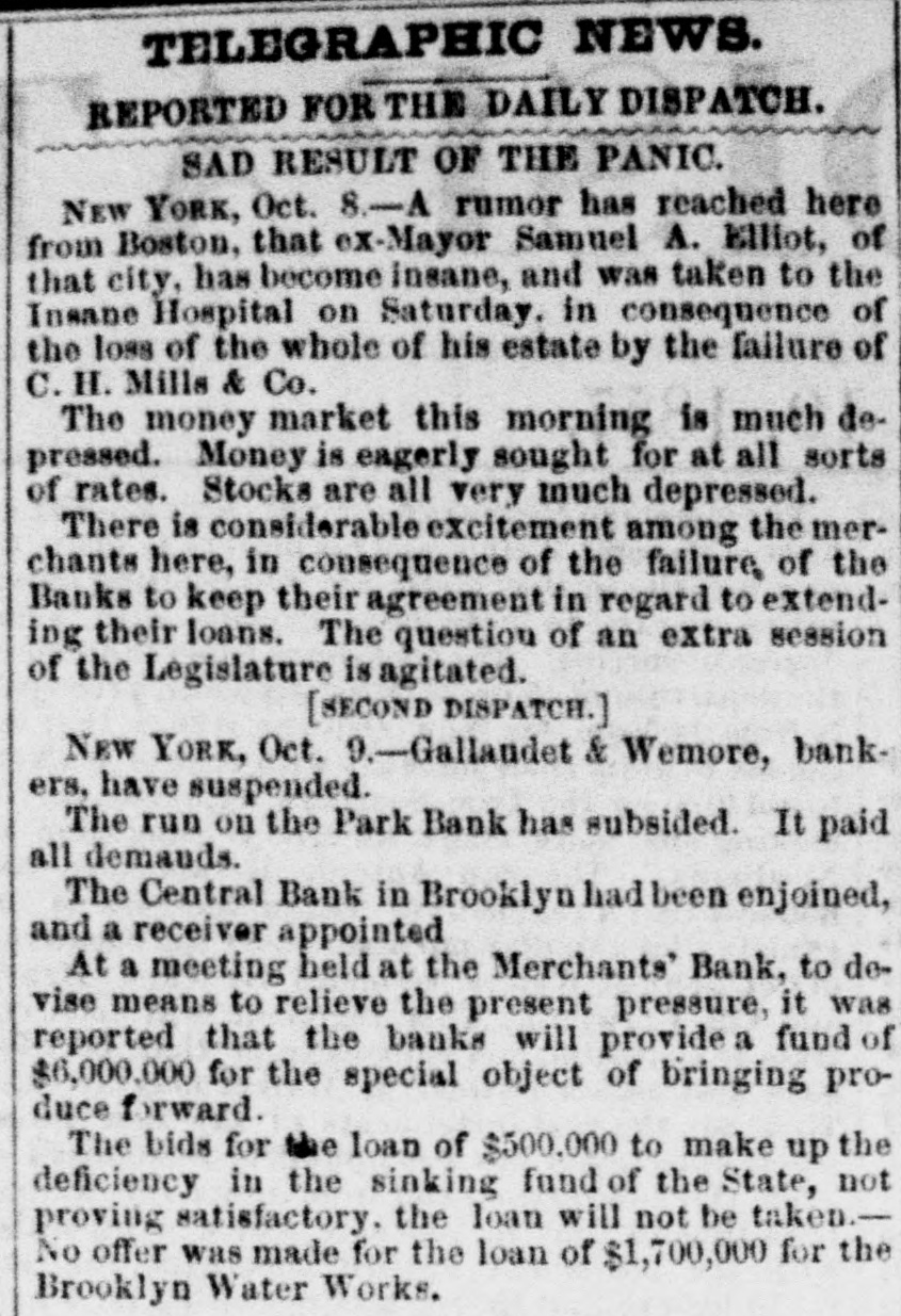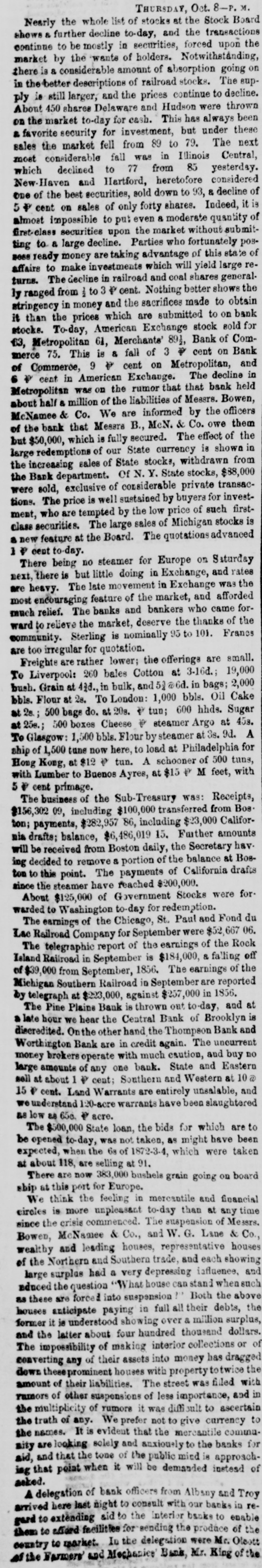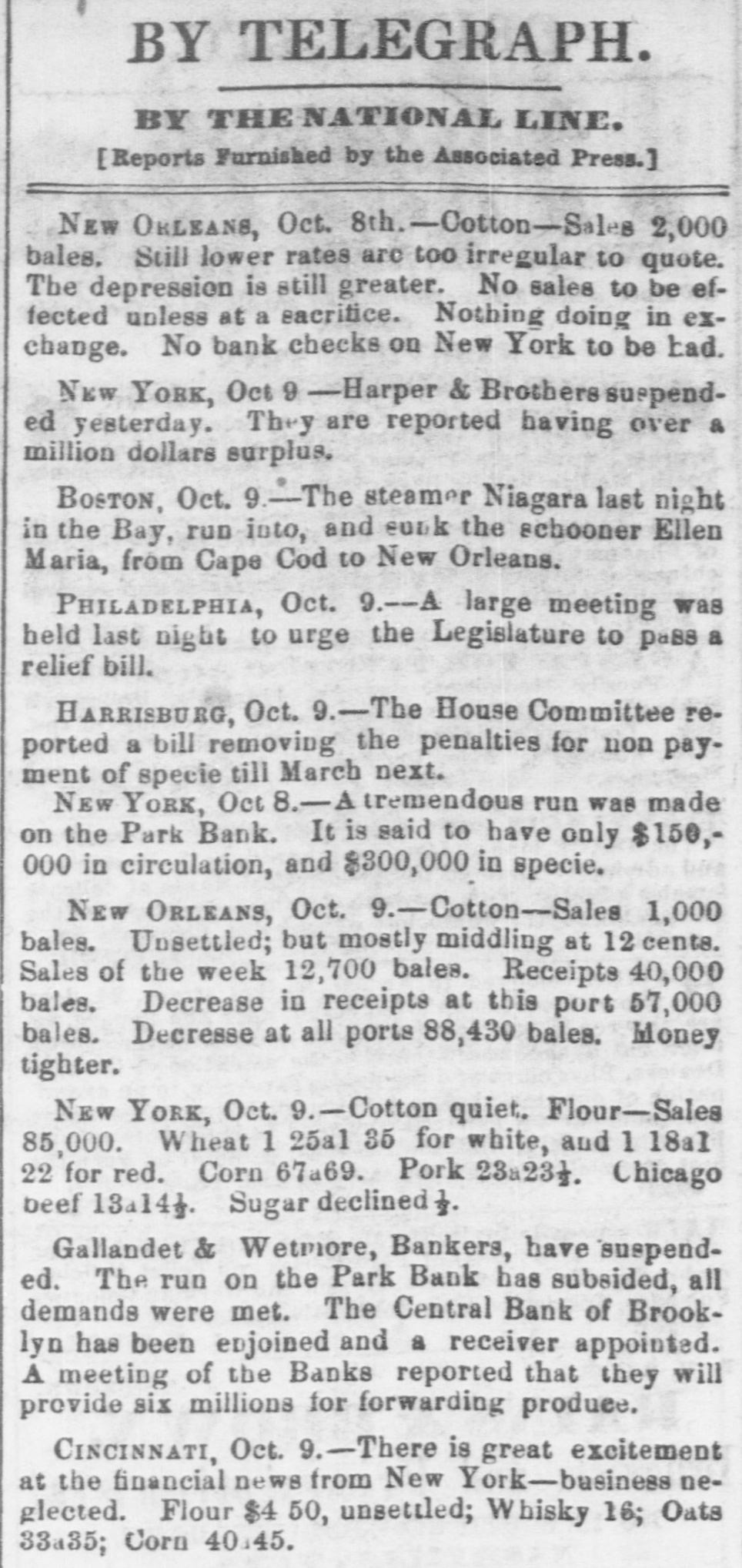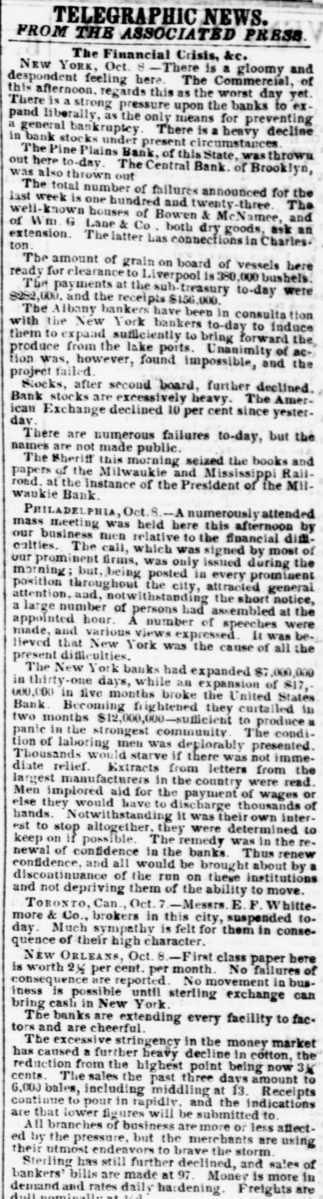 TELEGRAPHIC NEWS. FROM THE ASSOCIATED PRESS. The Financial Crisis, &c. NEW YORK, Oct. -There is a gloomy and despondent feeling here. The Commercial, of this afternoon. regards this as the worst day yet. There is a strong pressure upon the banks to expand liberally, as the only means for preventing a general bankruptcy. There is a heavy decline in bank stocks under present circumstances. The Pine Plains Bank, of this State, was thrown out here to-day. The Central Bank. of Brooklyn, was also thrown out The total number of failures announced for the last week is one hundred and twenty-three. The well-known houses of Bowen & McNamee, and of Wm G Lane & Co., both dry goods, ask an extension. ton. The latter has connections in Charles. The amount of grain on board of vessels here ready for clearance to Liverpool is 380,000 bushels. The payments at the sub-treasury to-day were $282,000, and the receipts $156,000. The Albany bankers have been in consulta tion with the New York bankers to-day to induce them to expand sufficiently to bring forward the produce from the lake ports. Unanimity of action was, however, found impossible, and the project failed. Stocks, after second board, further declined. Bank stocks are excessively heavy. The Amerday. ican Exchange declined 10 per cent since yesterThere are numerous failures to-day, but the names are not made public. The Sheriff this morning seized the books and papers of the Milwaukie and Mississippi Railroad. at the instance of the President of the Milwaukie Bank. PHILADELPHIA, Oct. 8.-A numerously attended mass meeting was held here this afternoon by our business men relative to the financial difficulties. The call, which was signed by most of our prominent firms, was only issued during the morning; but, being posted in every prominent position throughout the city, attracted general attention, and, notwithstanding the short notice, a large number of persons had assembled at the appointed hour. A number of speeches were made, and various views expressed. It was believed that New York was the cause of all the present difficulties. The New York banks had expanded $7,000,000 in thirty-one days, while an expansion of $17,000,000 in five months broke the United States Bank. Becoming frightened they curtailed in two months $12,000,000-suflicient to produce a panie in the strongest community. The condition of laboring men was deplorably presented. Thousands would starve if there was not immediate relief. Extracts from letters from the largest manufacturers in the country were read. Men implored aid for the payment of wages or else they would have to discharge thousands of hands. Notwithstanding it was their own interest to stop altogether, they were determined to keep on if possible. The remedy was in the renewal of confidence in the banks. Thus renew confidence, and all would be brought about by a discontinuance of the run on these institutions and not depriving them of the ability to move. TORONTO, Can., Oct. 7.-Messrs. E.F. Whittemore & Co., brokers in this city, suspended today. Much sympathy is felt for them in consequence of their high character. NEW ORLEANS, Oct. 8.-First class paper here is worth 2½ per cent. per month. No failures of consequence are reported. No movement in business is possible until sterling exchange can bring cash in New York. The banks are extending every facility to factors and are cheerful. The excessive stringency in the money market has caused a further heavy decline in cotton, the reduction from the highest point being now 3% cents. The sales the past three davs amount to 6,000 bales, including middling at 13. Receipts continue to pour in rapidly, and the indications are that lower figures will be submitted to. All branches of business are more or less affected by the pressure, but the merchants are using their utmost endeavors to brave the storm. Sterling has still further declined, and sales of bankers' bills are made at 97. Money is more in dull demand naminally and rates daily hardening. Freights are