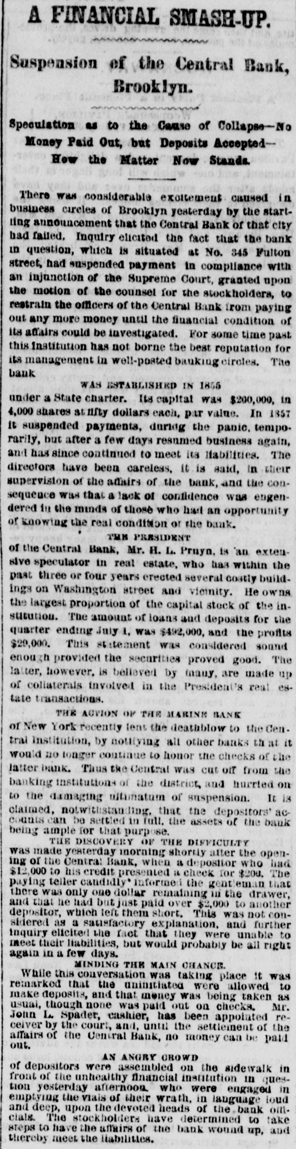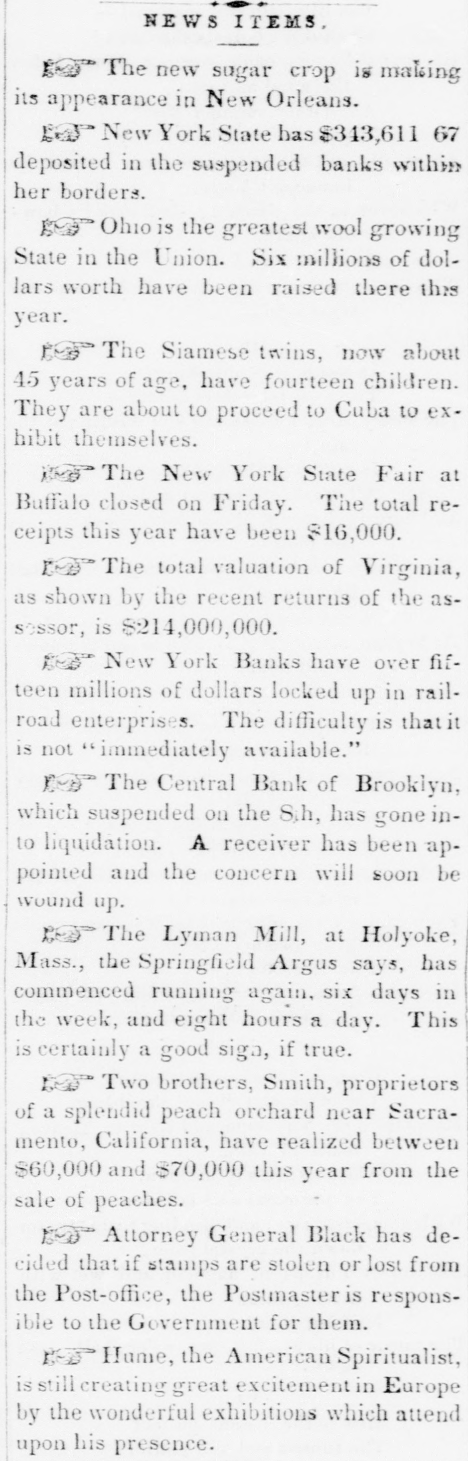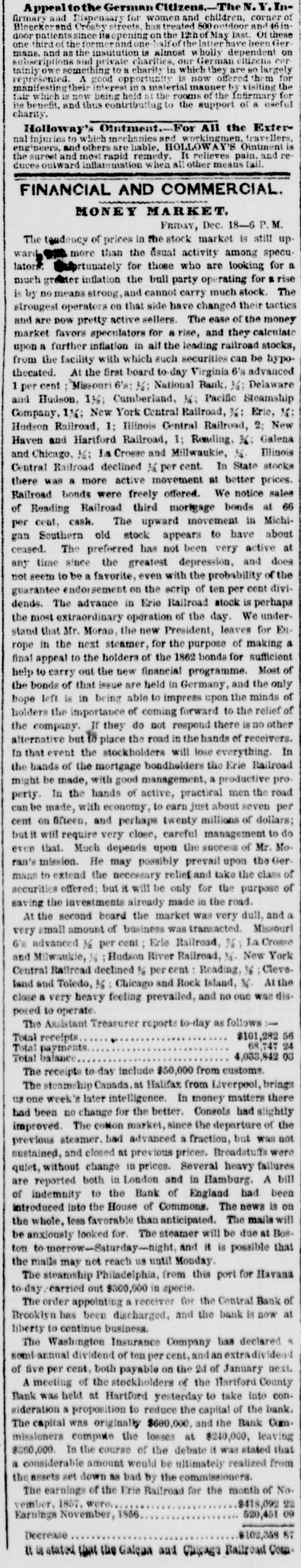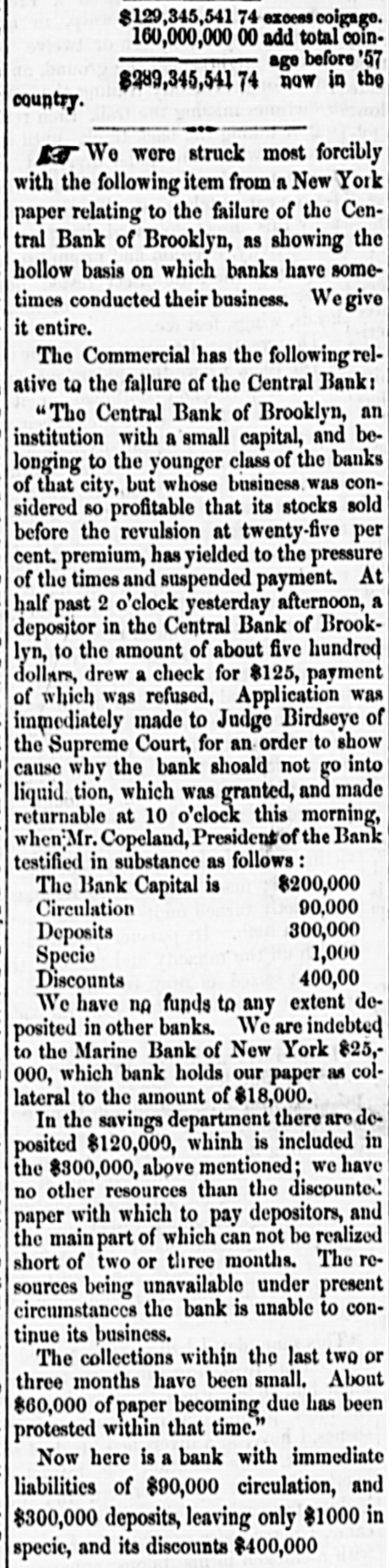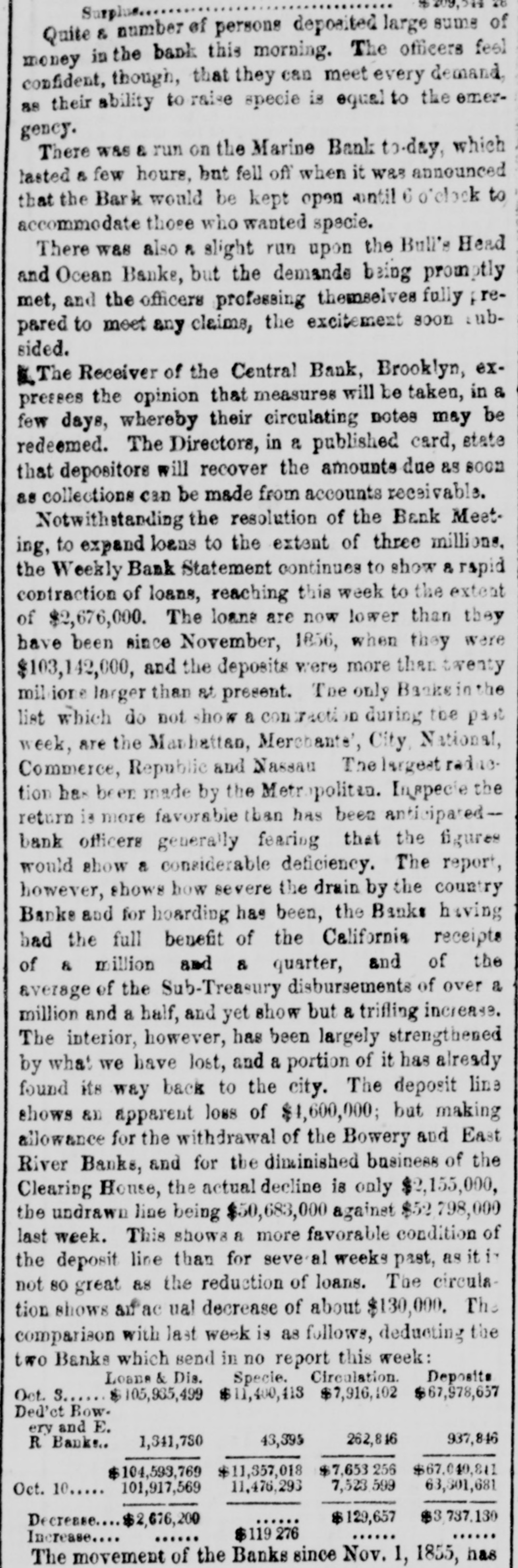 TELEGRAPHIC NEWS. FROM THE ASSOCIATED PRESS. The Financial Crisis, &c. NEW YORK, Oct. -There is a gloomy and despondent feeling here. The Commercial, of this afternoon. regards this as the worst day yet. There is a strong pressure upon the banks to expand liberally, as the only means for preventing a general bankruptcy. There is a heavy decline in bank stocks under present circumstances. The Pine Plains Bank, of this State, was thrown out here to-day. The Central Bank. of Brooklyn, was also thrown out The total number of failures announced for the last week is one hundred and twenty-three. The well-known houses of Bowen & McNamee, and of Wm G Lane & Co., both dry goods, ask an extension. ton. The latter has connections in Charles. The amount of grain on board of vessels here ready for clearance to Liverpool is 380,000 bushels. The payments at the sub-treasury to-day were $282,000, and the receipts $156,000. The Albany bankers have been in consulta tion with the New York bankers to-day to induce them to expand sufficiently to bring forward the produce from the lake ports. Unanimity of action was, however, found impossible, and the project failed. Stocks, after second board, further declined. Bank stocks are excessively heavy. The Amerday. ican Exchange declined 10 per cent since yesterThere are numerous failures to-day, but the names are not made public. The Sheriff this morning seized the books and papers of the Milwaukie and Mississippi Railroad. at the instance of the President of the Milwaukie Bank. PHILADELPHIA, Oct. 8.-A numerously attended mass meeting was held here this afternoon by our business men relative to the financial difficulties. The call, which was signed by most of our prominent firms, was only issued during the morning; but, being posted in every prominent position throughout the city, attracted general attention, and, notwithstanding the short notice, a large number of persons had assembled at the appointed hour. A number of speeches were made, and various views expressed. It was believed that New York was the cause of all the present difficulties. The New York banks had expanded $7,000,000 in thirty-one days, while an expansion of $17,000,000 in five months broke the United States Bank. Becoming frightened they curtailed in two months $12,000,000-suflicient to produce a panie in the strongest community. The condition of laboring men was deplorably presented. Thousands would starve if there was not immediate relief. Extracts from letters from the largest manufacturers in the country were read. Men implored aid for the payment of wages or else they would have to discharge thousands of hands. Notwithstanding it was their own interest to stop altogether, they were determined to keep on if possible. The remedy was in the renewal of confidence in the banks. Thus renew confidence, and all would be brought about by a discontinuance of the run on these institutions and not depriving them of the ability to move. TORONTO, Can., Oct. 7.-Messrs. E.F. Whittemore & Co., brokers in this city, suspended today. Much sympathy is felt for them in consequence of their high character. NEW ORLEANS, Oct. 8.-First class paper here is worth 2½ per cent. per month. No failures of consequence are reported. No movement in business is possible until sterling exchange can bring cash in New York. The banks are extending every facility to factors and are cheerful. The excessive stringency in the money market has caused a further heavy decline in cotton, the reduction from the highest point being now 3% cents. The sales the past three davs amount to 6,000 bales, including middling at 13. Receipts continue to pour in rapidly, and the indications are that lower figures will be submitted to. All branches of business are more or less affected by the pressure, but the merchants are using their utmost endeavors to brave the storm. Sterling has still further declined, and sales of bankers' bills are made at 97. Money is more in dull demand naminally and rates daily hardening. Freights are