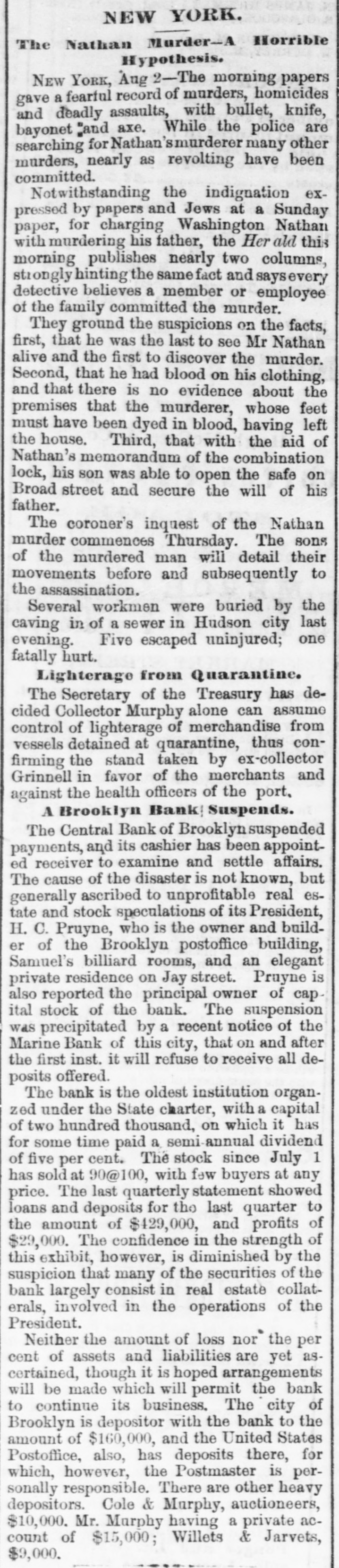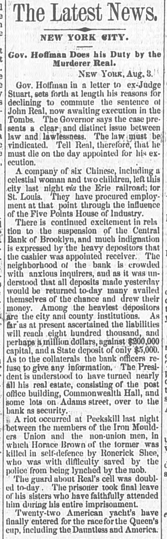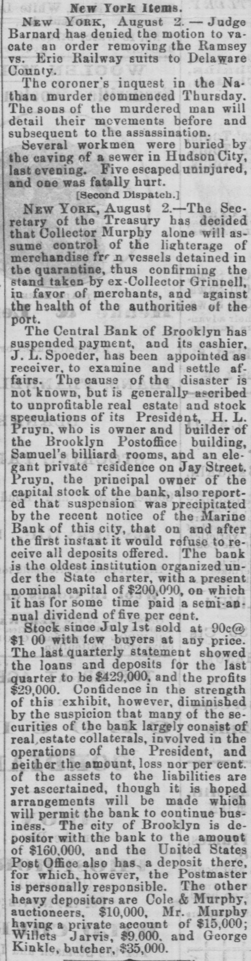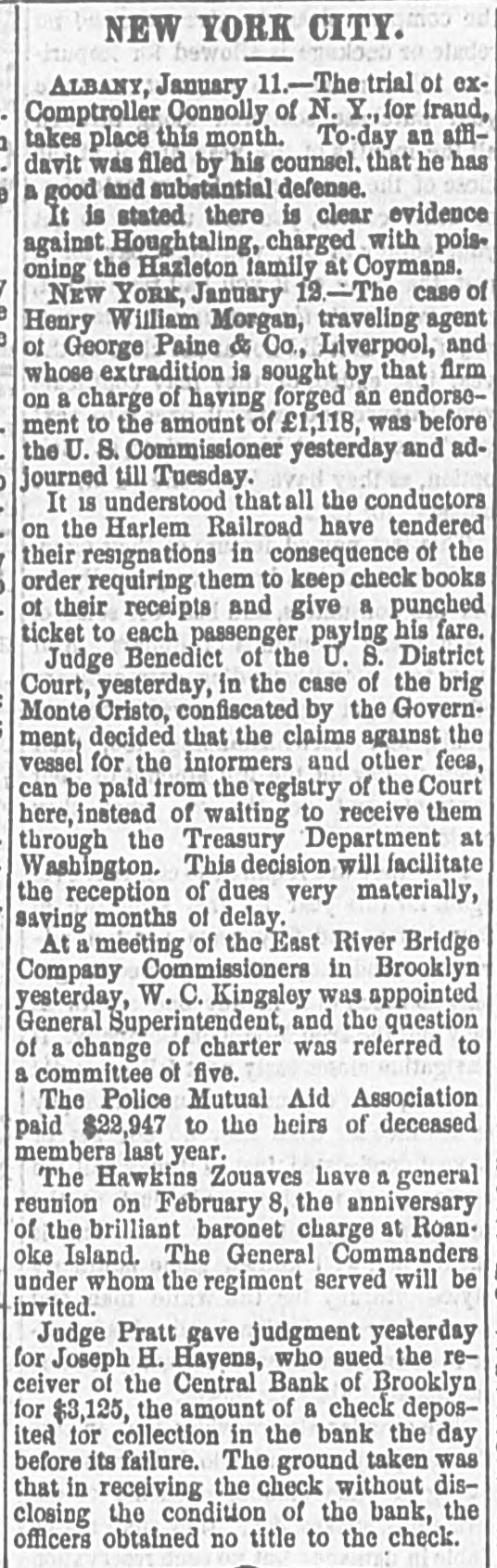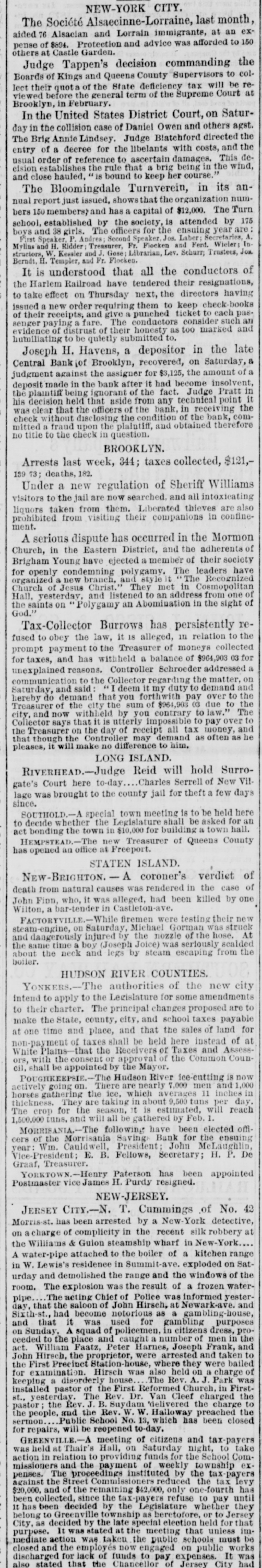 NEW-YORK CITY. The Société Alsaecinne-Lorraine, last month, aided 76 Alsacian and Lorrain immigrants, at an expense of $894. Protection and advice was afforded to 150 others at Castle Garden. Judge Tappen's decision commanding the Boards of Kings and Queens County Supervisors to collect their quota of the State deficiency tax will be reviewed before the general term of the Supreme Court at Brooklyn, in February. In the United States District Court, on Saturday in the collision case of Daniel Owen and others agst. The Brig Annie Lindsey. Judge Blatchford directed the entry of a decree for the libelants with costs, and the usual order of reference to ascertain damages. This decision establishes the rule that a brig being in the wind, and close hauled, "18 bound to keep her course." The Bloomingdale Turnverein, in its annual report just issued, shows that the organization numbers 150 members? and has a capital of $12,000. The Turn school, established by the society, is attended by 175 boys and 38 girls. The officers for the ensuing year are: First Andres; Second Speaker. Jos. Laber; Secretaries, Mylins and H. Ridder; Treasurer, Fr. Flocken and Ferd. Wieler; Instructors, Kessler and J. Gose: Librarian, Lev. Schurr; Trustees, Jos. Berndt H. Templer, and Fr. Flocken. It is understood that all the conductors of the Harlem Railroad have tendered their resignations, to take effect on Thursday next, the directors having issued a new order requiring them to keep check books of their receipts, and give punched ticket to each passenger paying fare. The conductors consider such an evidence of distrust of their honesty as too marked and humiliating to be quietly submitted to. Joseph H. Havens, a depositor in the late Central Bank (of Brooklyn, recovered, on Saturday, a judgment against the assigner for $3,125, the amount of a deposit made in the bank after it had become insolvent, the plaintiff being ignorant of the fact. Judge Pratt in his decision held that aside from any technical point it was clear that the officers of the bank, in receiving the check without disclosing the condition of the bank, committed fraud upon the plaintiff, and obtained therefore no title to the check in question. BROOKLYN. Arrests last week, 344; taxes collected, $121,139 73; deaths, 182. Under a new regulation of Sheriff Williams visitors to the jail are now searched. and all intoxicating liquors taken from them. Liberated thieves are also prohibited from visiting their companions in confinement. A serious dispute has occurred in the Mormon Church, in the Eastern District, and the adherents of Brigham Young have ejected a member of their society for openly condemning polygamy. The leaders have organized a new branch, and style The Recognized Church of Jesus Christ. They met in Cosmopolitan Hall, yesterday, and listened to an address from one of the saints on Polygamy an Abomination in the sight of God." Tax-Collector Burrows has persistently refused to obey the law, it is alleged, in relation to the prompt payment to the Treasurer of moneys collected for taxes, and has withheld a balance of $964,903 03 for unexplained reasons. Controller Schroeder addressed a communication to the Collector regarding the matter, on Saturday, and said deem it my duty to demand and hereby do demand that you forthwith pay over the Treasurer of the city the sum of $964,903 03 due to the city, and now withheld by you contrary to law." The Collector says that it utterly impossible to pay over the Treasurer on the day of receipt all tax money, and that though the Controller may demand as often as he pleases, it will make no difference to him. LONG ISLAND. RIVERHEAD.-Judge Reid will hold Surrogate's Court here to-day Charles Serrell of New Village was brought to the county jail for theft a few days since. SOUTHOLD.-A special town meeting is to be held here to decide whether the Legislature shall be asked for an act bonding the town in $10,000 for building a town hall. HEMPSTEAD.-The new Treasurer of Queens County has opened an office at Freeport. STATEN ISLAND. NEW-BRIGHTON. - A coroner's verdiet of death from natural causes was rendered in the case of John Fion, who, it was alleged, had been killed by one Wilton, a bar-tender in Castleton-ave. FACTORYVILLE-I firemen were testing their new steam-engine, on Saturday, Michael Gorman was struck and dangerously injured by the nozzle of the hose. At the same time a boy (Joseph Joice) was seriously scalded about the neck and legs by steam escaping from the boiler. HUDSON RIVER COUNTIES. YONKERS.- The authorities of the new city intend to apply to the Legislature for some amendments to their charter. The principal changes proposed are to make the State, county, city, and school taxes payable at one time and place, and that the sales of land for non-payment of taxes shall be held here instead of at White Plains-that the Receivers of Taxes and Assessors, with the consent or approval of the Common Council, shall be appointed by the Mayor. POUGHKEEPSIE.- The Hudson River ice-cutting is now actively going on. There are nearly 7,000 men and 1,000 horses gathering the ice. which averages 11 inches in thickness. They are taking in about 9,500 tuns per day. The crop for the season, it is estimated, will reach 1,500,000 tuns. and will all be gathered by Feb. 1. MORRIFANIA.-The following have been elected officers of the Morrisania Saving Bank for the ensuing year:Win. Cauldwell, President John McLaughlin, Vice-President; E. B. Fellows, Secretary; H. P. De Graaf, Treasurer. YORKTOWN.-Henry Paterson has been appointed Postmaster James H. Purdy resigned. NEW-JERSEY. JERSEY CITY.-N. T. Cummings of No. 42 Morris-st. has been arrested by a New- York detective, on a charge of complicity in the recent silk robbery at the Williams & Guion steamship wharf in New-York. A water-pipe attached to the boiler of a kitchen range in W. Lewis's residence in Summit-ave. exploded on Satfurday and demolished the range and the windows