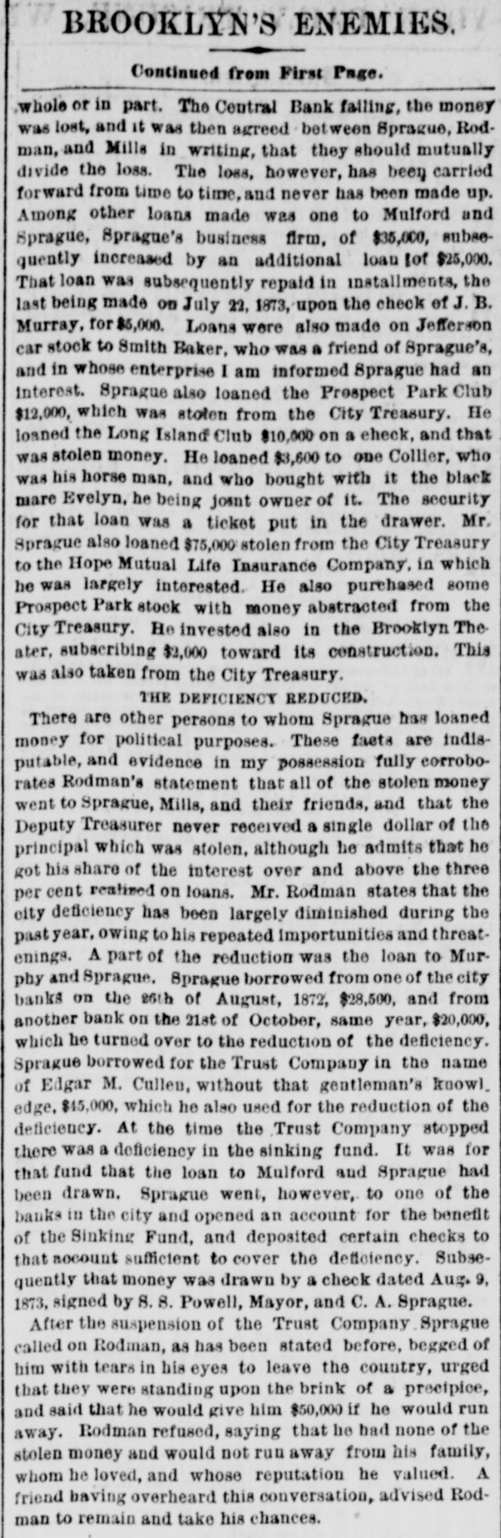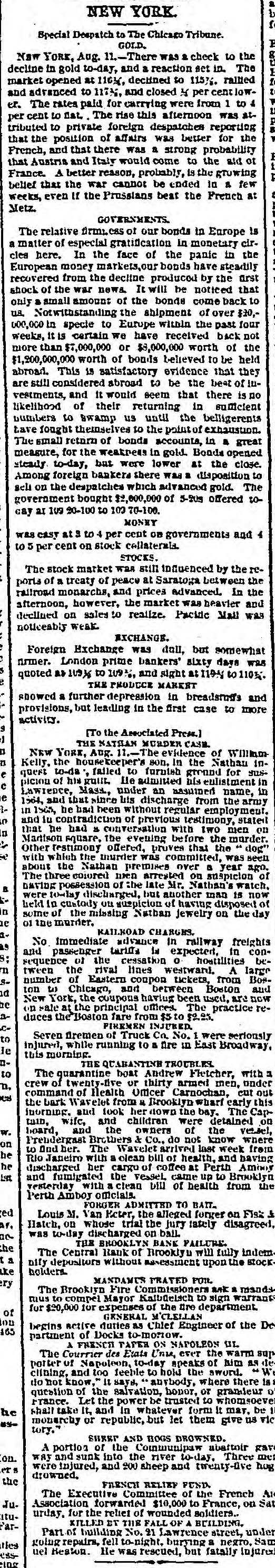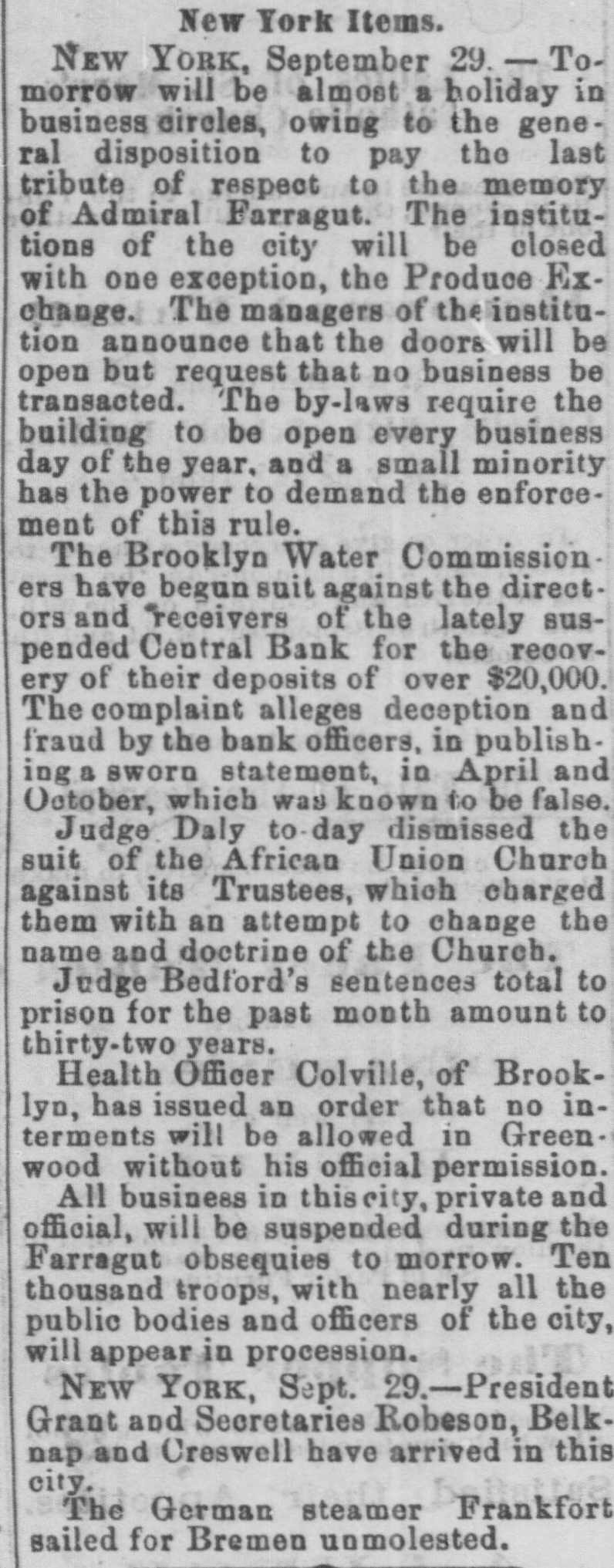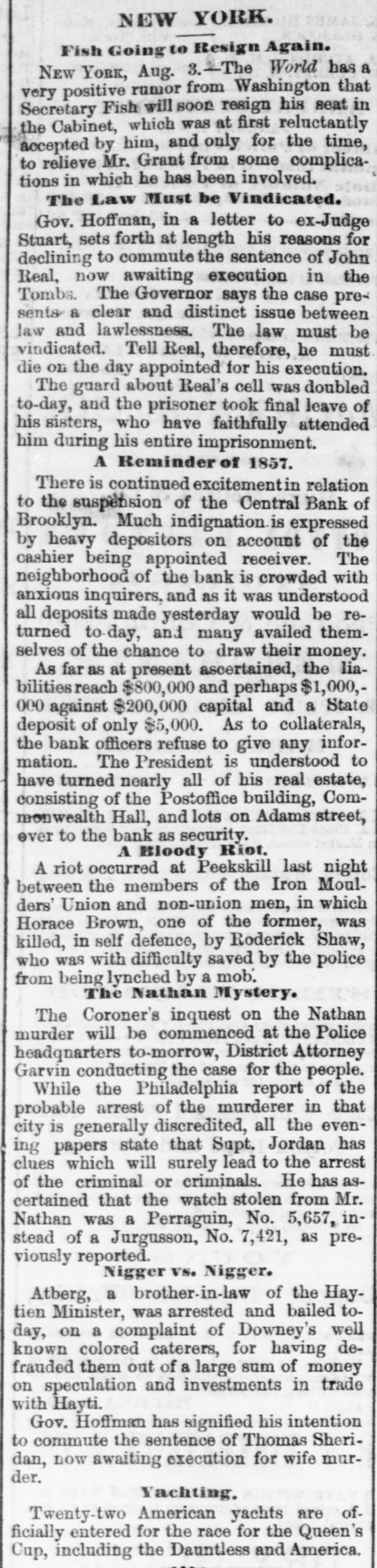 NEW-YORK CITY. The Société Alsaecinne-Lorraine, last month, aided 76 Alsacian and Lorrain immigrants, at an expense of $894. Protection and advice was afforded to 150 others at Castle Garden. Judge Tappen's decision commanding the Boards of Kings and Queens County Supervisors to collect their quota of the State deficiency tax will be reviewed before the general term of the Supreme Court at Brooklyn, in February. In the United States District Court, on Saturday in the collision case of Daniel Owen and others agst. The Brig Annie Lindsey. Judge Blatchford directed the entry of a decree for the libelants with costs, and the usual order of reference to ascertain damages. This decision establishes the rule that a brig being in the wind, and close hauled, "18 bound to keep her course." The Bloomingdale Turnverein, in its annual report just issued, shows that the organization numbers 150 members? and has a capital of $12,000. The Turn school, established by the society, is attended by 175 boys and 38 girls. The officers for the ensuing year are: First Andres; Second Speaker. Jos. Laber; Secretaries, Mylins and H. Ridder; Treasurer, Fr. Flocken and Ferd. Wieler; Instructors, Kessler and J. Gose: Librarian, Lev. Schurr; Trustees, Jos. Berndt H. Templer, and Fr. Flocken. It is understood that all the conductors of the Harlem Railroad have tendered their resignations, to take effect on Thursday next, the directors having issued a new order requiring them to keep check books of their receipts, and give punched ticket to each passenger paying fare. The conductors consider such an evidence of distrust of their honesty as too marked and humiliating to be quietly submitted to. Joseph H. Havens, a depositor in the late Central Bank (of Brooklyn, recovered, on Saturday, a judgment against the assigner for $3,125, the amount of a deposit made in the bank after it had become insolvent, the plaintiff being ignorant of the fact. Judge Pratt in his decision held that aside from any technical point it was clear that the officers of the bank, in receiving the check without disclosing the condition of the bank, committed fraud upon the plaintiff, and obtained therefore no title to the check in question. BROOKLYN. Arrests last week, 344; taxes collected, $121,139 73; deaths, 182. Under a new regulation of Sheriff Williams visitors to the jail are now searched. and all intoxicating liquors taken from them. Liberated thieves are also prohibited from visiting their companions in confinement. A serious dispute has occurred in the Mormon Church, in the Eastern District, and the adherents of Brigham Young have ejected a member of their society for openly condemning polygamy. The leaders have organized a new branch, and style The Recognized Church of Jesus Christ. They met in Cosmopolitan Hall, yesterday, and listened to an address from one of the saints on Polygamy an Abomination in the sight of God." Tax-Collector Burrows has persistently refused to obey the law, it is alleged, in relation to the prompt payment to the Treasurer of moneys collected for taxes, and has withheld a balance of $964,903 03 for unexplained reasons. Controller Schroeder addressed a communication to the Collector regarding the matter, on Saturday, and said deem it my duty to demand and hereby do demand that you forthwith pay over the Treasurer of the city the sum of $964,903 03 due to the city, and now withheld by you contrary to law." The Collector says that it utterly impossible to pay over the Treasurer on the day of receipt all tax money, and that though the Controller may demand as often as he pleases, it will make no difference to him. LONG ISLAND. RIVERHEAD.-Judge Reid will hold Surrogate's Court here to-day Charles Serrell of New Village was brought to the county jail for theft a few days since. SOUTHOLD.-A special town meeting is to be held here to decide whether the Legislature shall be asked for an act bonding the town in $10,000 for building a town hall. HEMPSTEAD.-The new Treasurer of Queens County has opened an office at Freeport. STATEN ISLAND. NEW-BRIGHTON. - A coroner's verdiet of death from natural causes was rendered in the case of John Fion, who, it was alleged, had been killed by one Wilton, a bar-tender in Castleton-ave. FACTORYVILLE-I firemen were testing their new steam-engine, on Saturday, Michael Gorman was struck and dangerously injured by the nozzle of the hose. At the same time a boy (Joseph Joice) was seriously scalded about the neck and legs by steam escaping from the boiler. HUDSON RIVER COUNTIES. YONKERS.- The authorities of the new city intend to apply to the Legislature for some amendments to their charter. The principal changes proposed are to make the State, county, city, and school taxes payable at one time and place, and that the sales of land for non-payment of taxes shall be held here instead of at White Plains-that the Receivers of Taxes and Assessors, with the consent or approval of the Common Council, shall be appointed by the Mayor. POUGHKEEPSIE.- The Hudson River ice-cutting is now actively going on. There are nearly 7,000 men and 1,000 horses gathering the ice. which averages 11 inches in thickness. They are taking in about 9,500 tuns per day. The crop for the season, it is estimated, will reach 1,500,000 tuns. and will all be gathered by Feb. 1. MORRIFANIA.-The following have been elected officers of the Morrisania Saving Bank for the ensuing year:Win. Cauldwell, President John McLaughlin, Vice-President; E. B. Fellows, Secretary; H. P. De Graaf, Treasurer. YORKTOWN.-Henry Paterson has been appointed Postmaster James H. Purdy resigned. NEW-JERSEY. JERSEY CITY.-N. T. Cummings of No. 42 Morris-st. has been arrested by a New- York detective, on a charge of complicity in the recent silk robbery at the Williams & Guion steamship wharf in New-York. A water-pipe attached to the boiler of a kitchen range in W. Lewis's residence in Summit-ave. exploded on Satfurday and demolished the range and the windows